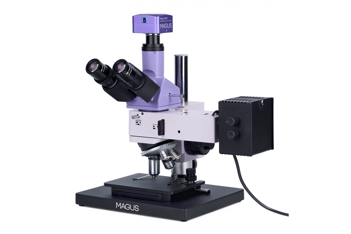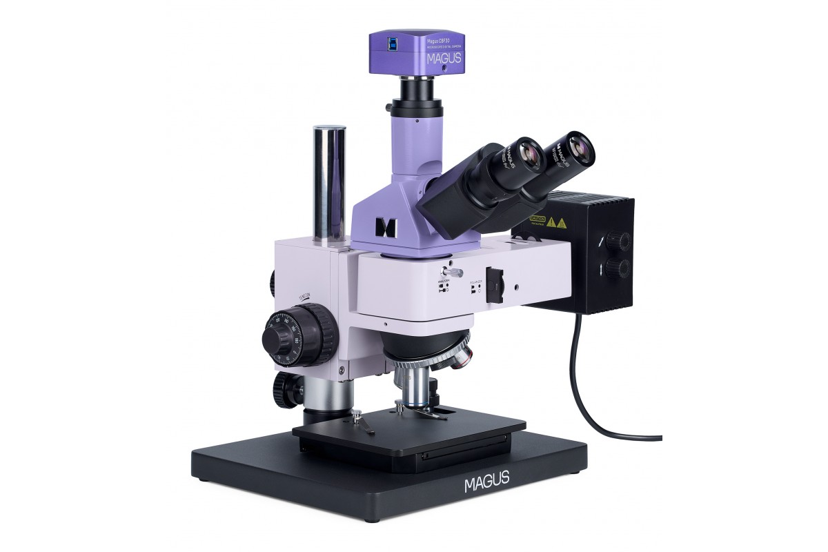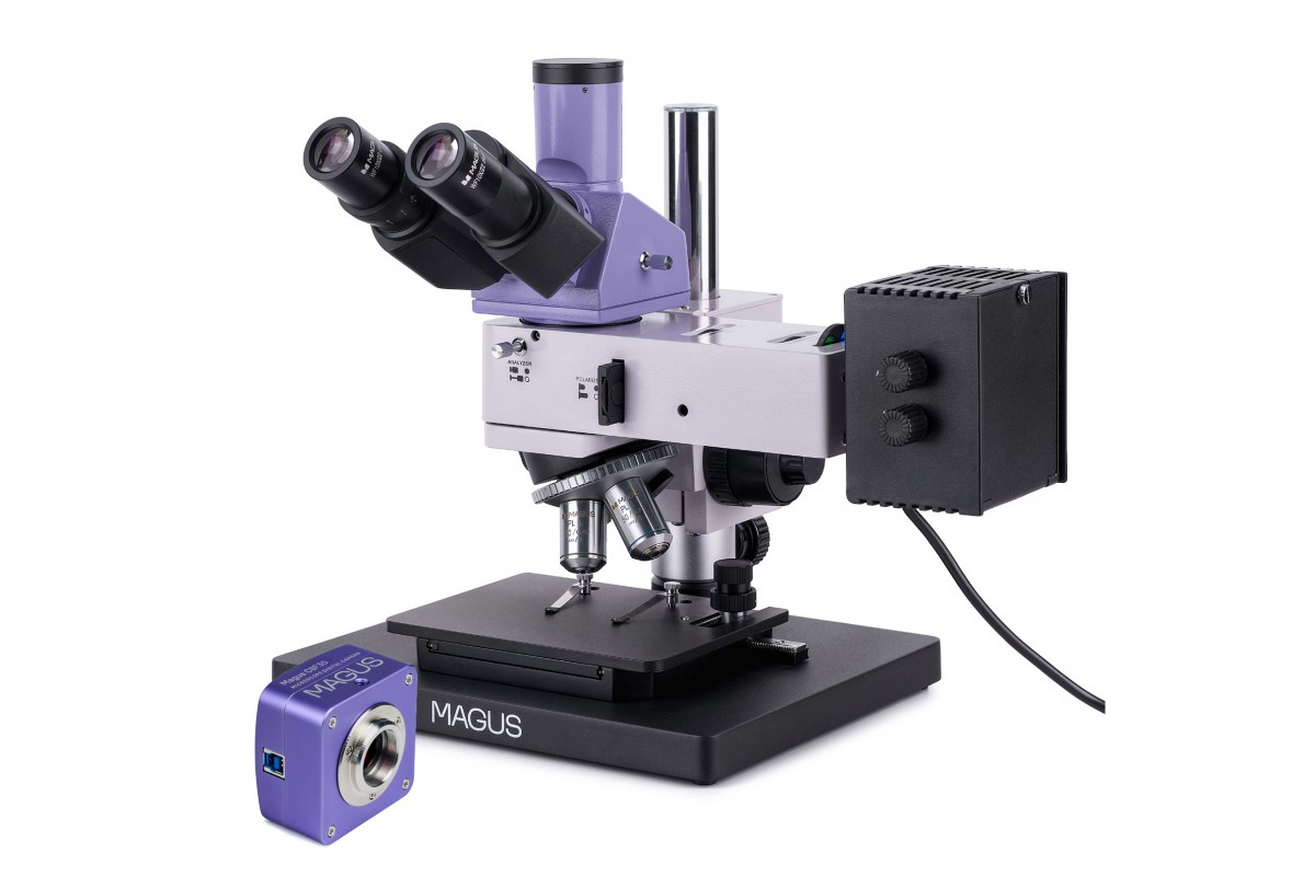 Универсальный микроскоп не ограничивает высоту и геометрию объектов исследования, работает в условиях ограничения пространства и предполагает модернизацию штатива под конкретные требования производственной линии. Микроскоп предназначен для наблюдения микроструктуры металлов и сплавов, полупроводниковых материалов, контроля качества лакокрасочных покрытий и исследования других непрозрачных объектов. Осветитель отраженного света предусматривает работу по методу светлого поля и простой поляризации. Микроскоп используется на предприятиях металлургической, машиностроительной, аэрокосмической, атомной и энергетической промышленности, в научно-исследовательских лабораториях и технических вузах. **Цифровая камера** Цифровая камера MAGUS CBF30 разработана для работы по методу светлого поля. Камера оснащена сенсором 6,3 Мпикс и формирует реалистичное изображение в разрешении 3072x2048 пикс. Камера рекомендуется для работы с объективами 4х, 10х, 20х и 40х. При работе с объективами малого увеличения камера позволит различить больше мелких деталей. Видеозапись ведется с частотой 59 кадров в секунду при максимальном разрешении. Видео плавные, с мягкими и незаметными глазу переходами между кадрами. Передвижение препарата отображается в реальном времени, без задержек. Камера обеспечивает удобную работу с подвижными объектами, подходит для проведения демонстраций в аудитории. При необходимости разрешение можно уменьшить до 1536x1024 пикс. Камера оснащена интерфейсом USB 3.0. Скорость передачи данных в 10 раз выше, чем у камер с интерфейсом USB 2.0. Высокоскоростная камера рекомендуется для профессиональной работы в лаборатории, исследований или обучения в вузах. **Визуальная насадка** Тринокулярная визуальная насадка рассчитана на бесконечность. Цифровая камера устанавливается в вертикальный тубус с каналом визуализации. Переключатель светового потока позволяет направлять 100% света или на цифровую камеру, или на окулярные тубусы. Диоптрийная подвижка на левом окулярном тубусе. **Револьверное устройство** Револьвер на 5 объективов. Свободное отверстие служит для настройки положения лампы осветителя отраженного света. Также в свободное гнездо револьвера можно установить дополнительный объектив, который позволит получить еще одно увеличение. **Объективы** Объективы-планахроматы с увеличенным рабочим расстоянием предназначены для работы в светлом поле. **Фокусировка** Коаксиальные рукоятки грубой и тонкой фокусировки расположены с двух сторон штатива. Настройка фокуса происходит плавно и без усилий. Предусмотрена регулировка жесткости хода грубой фокусировки. **Штатив** Микроскоп помещается на полках высотой 40 см и больше благодаря компактному штативу. Оригинальная конструкция штатива и механизма фокусировки не ограничивает высоту объектов исследования, а двухкоординатный столик удобен для работы с небольшими объектами. Оптический блок вместе с осветительной частью микроскопа устанавливается на штатив индивидуального дизайна и встраивается в производственную линию. **Источник света** В осветителе отраженного света стоит 30-ваттная галогенная лампа. Она светит достаточно ярко для работы на объективах увеличением от 4х до 100х в светлом поле и в поляризованном свете. Галогенная лампа излучает свет, комфортной для глаз цветовой темпер