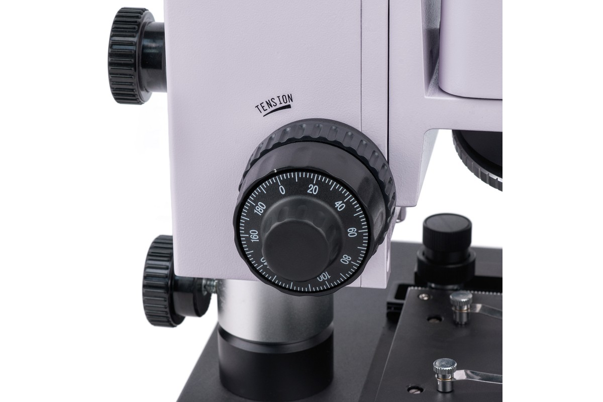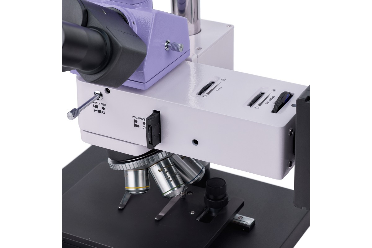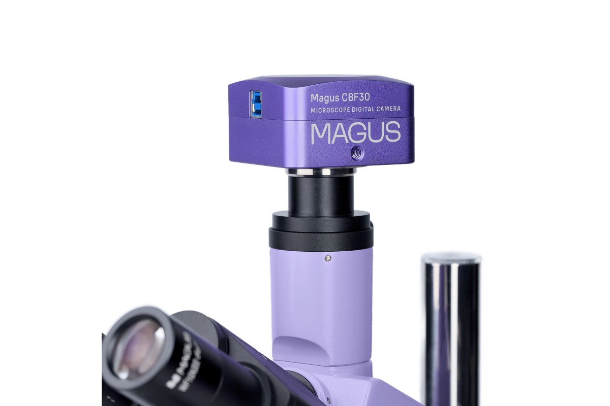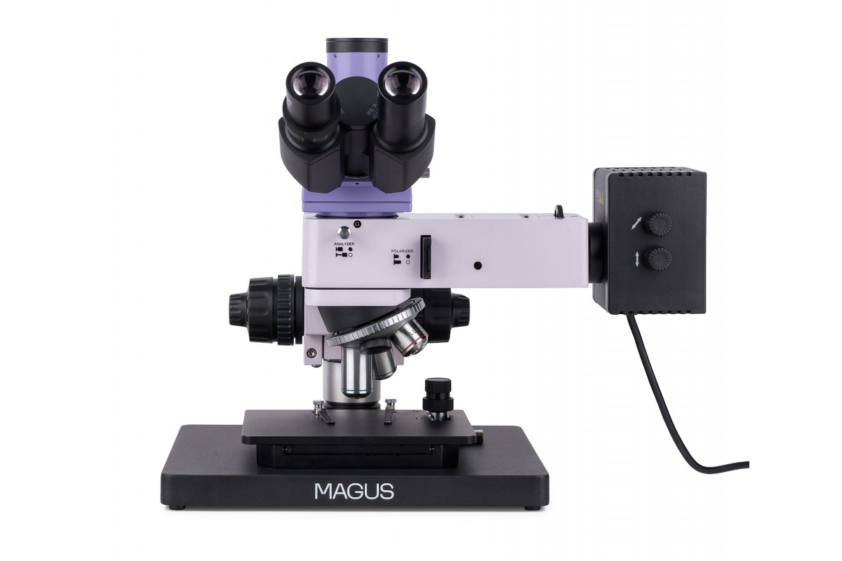 Универсальный микроскоп не ограничивает высоту и геометрию объектов исследования, работает в условиях ограничения пространства и предполагает модернизацию штатива под конкретные требования производственной линии. Микроскоп предназначен для наблюдения микроструктуры металлов и сплавов, полупроводниковых материалов, контроля качества лакокрасочных покрытий и исследования других непрозрачных объектов. Осветитель отраженного света предусматривает работу по методу светлого поля и простой поляризации. Микроскоп используется на предприятиях металлургической, машиностроительной, аэрокосмической, атомной и энергетической промышленности, в научно-исследовательских лабораториях и технических вузах. **Цифровая камера** Цифровая камера MAGUS CBF30 разработана для работы по методу светлого поля. Камера оснащена сенсором 6,3 Мпикс и формирует реалистичное изображение в разрешении 3072x2048 пикс. Камера рекомендуется для работы с объективами 4х, 10х, 20х и 40х. При работе с объективами малого увеличения камера позволит различить больше мелких деталей. Видеозапись ведется с частотой 59 кадров в секунду при максимальном разрешении. Видео плавные, с мягкими и незаметными глазу переходами между кадрами. Передвижение препарата отображается в реальном времени, без задержек. Камера обеспечивает удобную работу с подвижными объектами, подходит для проведения демонстраций в аудитории. При необходимости разрешение можно уменьшить до 1536x1024 пикс. Камера оснащена интерфейсом USB 3.0. Скорость передачи данных в 10 раз выше, чем у камер с интерфейсом USB 2.0. Высокоскоростная камера рекомендуется для профессиональной работы в лаборатории, исследований или обучения в вузах. **Визуальная насадка** Тринокулярная визуальная насадка рассчитана на бесконечность. Цифровая камера устанавливается в вертикальный тубус с каналом визуализации. Переключатель светового потока позволяет направлять 100% света или на цифровую камеру, или на окулярные тубусы. Диоптрийная подвижка на левом окулярном тубусе. **Револьверное устройство** Револьвер на 5 объективов. Свободное отверстие служит для настройки положения лампы осветителя отраженного света. Также в свободное гнездо револьвера можно установить дополнительный объектив, который позволит получить еще одно увеличение. **Объективы** Объективы-планахроматы с увеличенным рабочим расстоянием предназначены для работы в светлом поле. **Фокусировка** Коаксиальные рукоятки грубой и тонкой фокусировки расположены с двух сторон штатива. Настройка фокуса происходит плавно и без усилий. Предусмотрена регулировка жесткости хода грубой фокусировки. **Штатив** Микроскоп помещается на полках высотой 40 см и больше благодаря компактному штативу. Оригинальная конструкция штатива и механизма фокусировки не ограничивает высоту объектов исследования, а двухкоординатный столик удобен для работы с небольшими объектами. Оптический блок вместе с осветительной частью микроскопа устанавливается на штатив индивидуального дизайна и встраивается в производственную линию. **Источник света** В осветителе отраженного света стоит 30-ваттная галогенная лампа. Она светит достаточно ярко для работы на объективах увеличением от 4х до 100х в светлом поле и в поляризованном свете. Галогенная лампа излучает свет, комфортной для глаз цветовой темпер