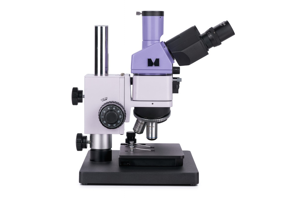 Микроскоп помещается на полках высотой 40 см и больше благодаря компактному штативу. Оригинальная конструкция штатива и механизма фокусировки не ограничивает высоту объектов исследования, а двухкоординатный столик удобен для работы с небольшими объектами. Оптический блок вместе с осветительной частью микроскопа устанавливается на штатив индивидуального дизайна и встраивается в производственную линию.