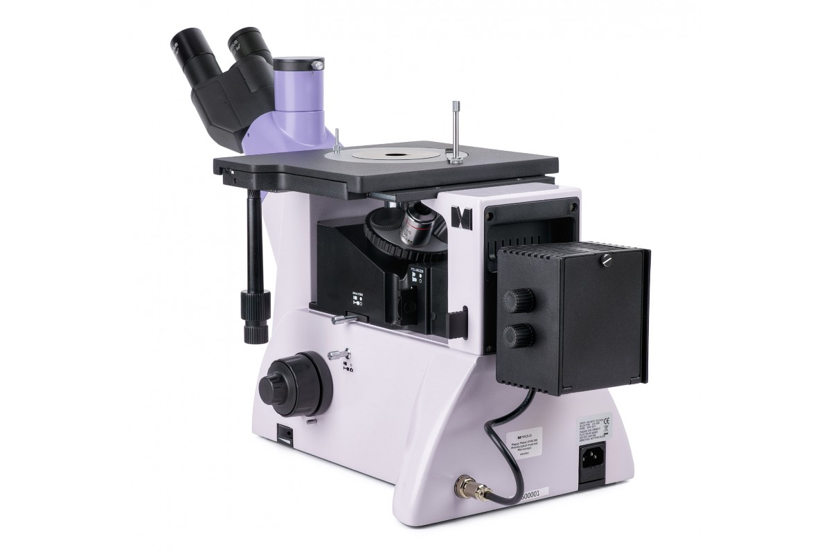 Галогенный осветитель отраженного света обладает увеличенной мощностью – 50 Вт достаточно для комфортных наблюдений не только в светлом поле и в поляризованном свете, но и в темном поле. Освещение получается теплым по цветовой температуре, поэтому глаза не устают при длительной работе. Источник света центрируется по трем осям. Наличие апертурной и полевой диафрагм позволяет настраивать освещение по методу Кёлера, а светофильтры упрощают настройку контрастности. Есть устройство простой поляризации со съемными анализатором и поляризатором, также в осветительной системе присутствует устройство для работы в темном поле.