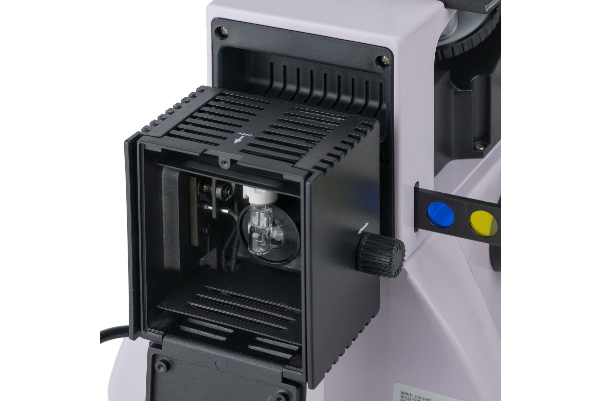 • Настройка освещения по Кёлеру, центровка источника света, светофильтры, осветитель – галогенная лампа мощностью 50 Вт с питанием от сети (мощность увеличена специально для работы в темном поле)