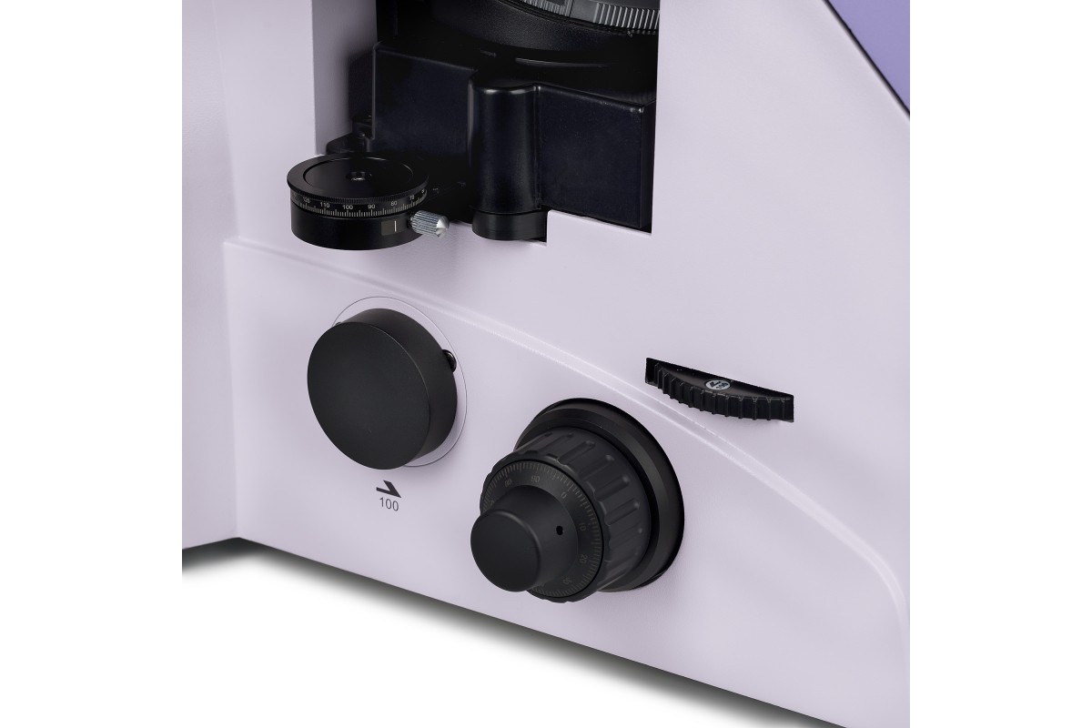 Рукоятка блокировки грубой фокусировки помогает быстро настроить микроскоп после смены объекта исследования. Рукоятка расположена с левой стороны микроскопа на одной оси с механизмом фокусировки.