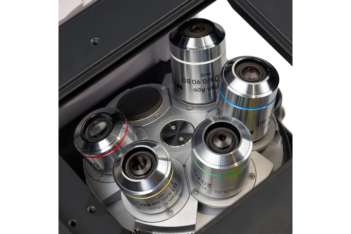 - Объективыплан-полуапохроматы и план-апохроматы для светлого и темного поля, скорректированные на бесконечность: 5x/0,15; 10x/0,30; 20x/0,45; 50xs/0,80; 100xs/0,90; парфокальная высота 45 мм