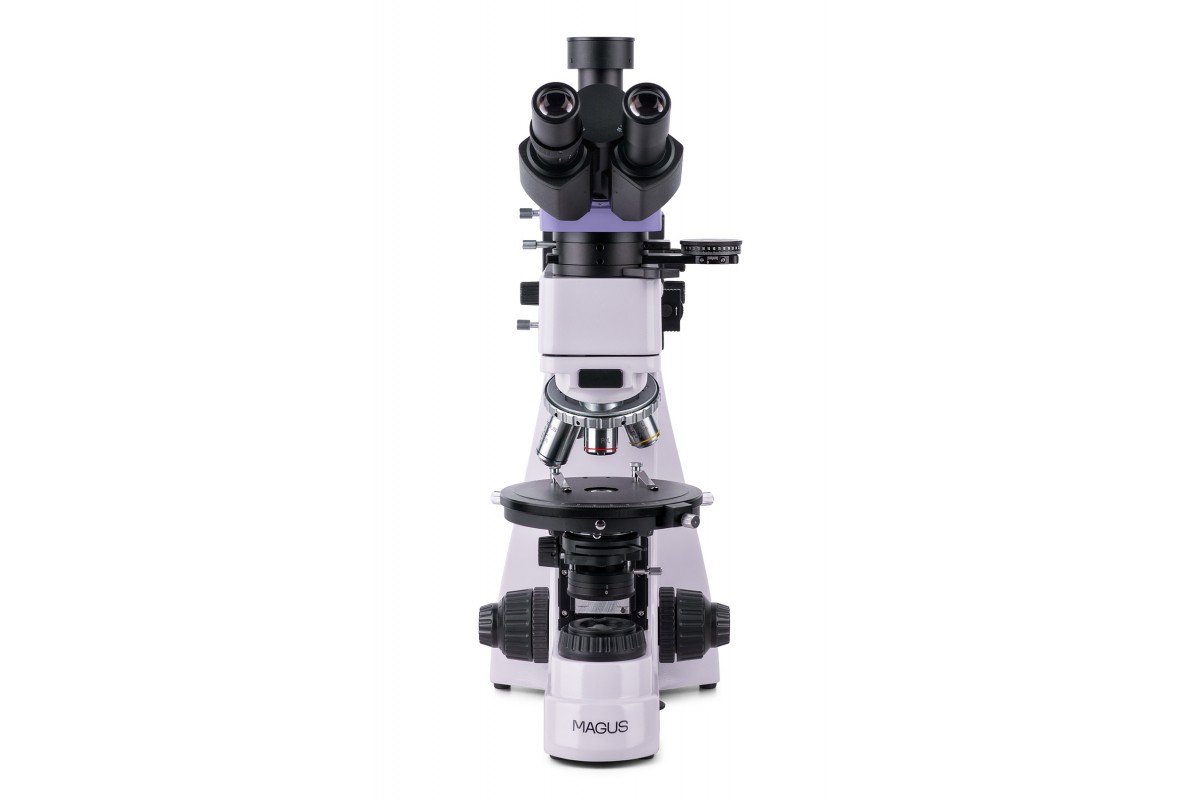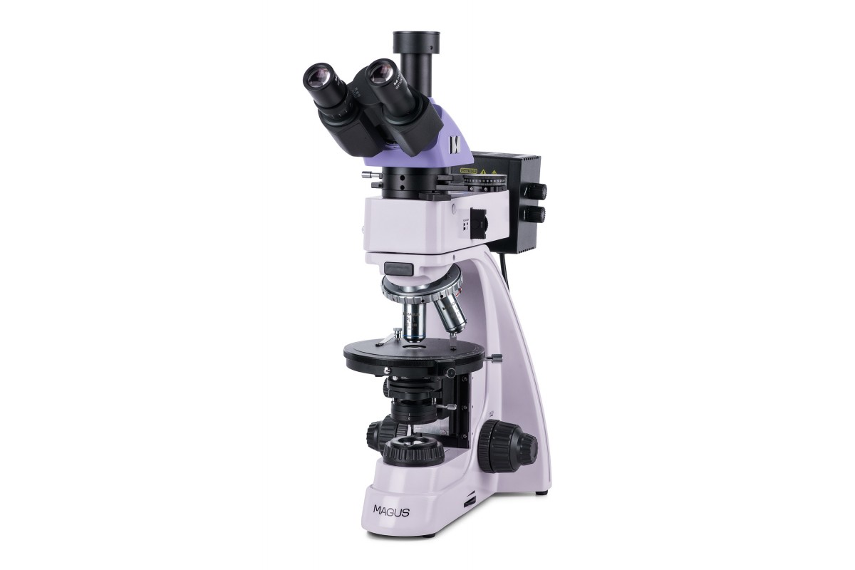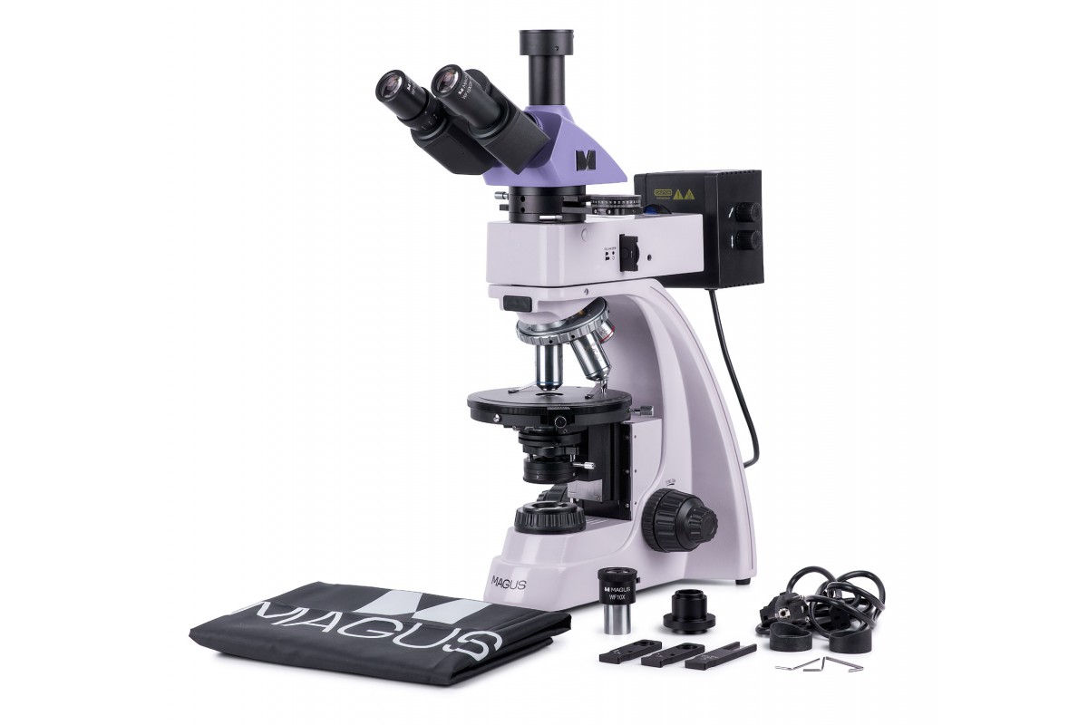 MAGUS Pol 850 – это профессиональный микроскоп для работы по методу поляризации в проходящем и отраженном свете. Также он поддерживает работу в светлом поле. Микроскоп предназначен для исследования геологических, биологических полимерных анизотропных объектов и непрозрачных аншлифов, толщина которых может достигать 15 мм. Одна сторона аншлифа должна быть отполирована. Микроскоп применяется в разных сферах науки: медицине, петрографии, минералогии, криминалистике и проч. **Оптическая схема** Планахроматические объективы рассчитаны на работу без покровного стекла и свободны от напряжений, т. е. не вносят ложных оптических эффектов в изображение. Оптика обеспечивает четкое и детализированное изображение по всему полю зрения. Всего в комплект включены четыре объектива, они устанавливаются в револьверное устройство с пятью гнездами. В оставшееся свободное гнездо может быть установлен опциональный объектив из линейки аксессуаров бренда. Гнезда револьвера центрируются. На микроскопе установлена тринокулярная насадка, имеющая отдельный канал визуализации для цифровой камеры (камера в комплектацию не включена). Световой поток может быть полностью направлен в окулярные тубусы или на камеру (деление 100/0 или 0/100). Для настройки оптики под особенности зрения пользователя можно воспользоваться диоптрийной подвижкой на левом окуляре. **Система освещения** Для освещения рабочей области используются галогенные лампы 30 Вт – для отраженного и проходящего света. Они ярко светят в «теплом» цветовом спектре, поэтому создают оптимальные условия для длительной работы на каждом объективе: образцы видны хорошо, а глаза не устают. Освещение может быть выставлено по методу Кёлера, т. е. изображение получится без артефактов, с высоким разрешением и без виньетирования. В отраженном свете доступно использование светофильтров. Поляризованный свет получается в результате взаимной работы анализатора и поляризатора: их поворотом относительно друг друга регулируют угол поляризации. Для коноскопии используется линза Бертрана – она расположена в промежуточной насадке. Там же находится слот для установки компенсаторов – с помощью компенсаторов повышают контраст объектов. **Механика** Предметный столик вращается, поэтому можно изменять преломление света внутри образца. Также столик может быть отцентрирован относительно оптической оси. На столике присутствуют отметки угла поворота и измерительная шкала. Для фокусировки используются рукоятки на корпусе микроскопа: резкость настраивают грубо и тонко. Ход грубой фокусировки можно сделать мягче или жестче – для удобства пользователя. Также для нее присутствует блокиратор хода. **Аксессуары** Раскрыть все возможности микроскопа помогут дополнительные аксессуары: объективы, окуляры, цифровые камеры, калибровочные слайды. Они представлены в линейке бренда MAGUS. **Основные особенности:** * Для работы по методу поляризации в отраженном и проходящем свете; доступен метод светлого поля * Канал визуализации для установки цифровой камеры; деление светового потока: 100% света на окуляры или 100% света на канал визуализации * Планахроматические объективы без напряжений не вносят оптических искажений в изображение * Источники проходящего и отраженного света – галогенные лампы 30 Вт; Кёлер для отраженного и прох