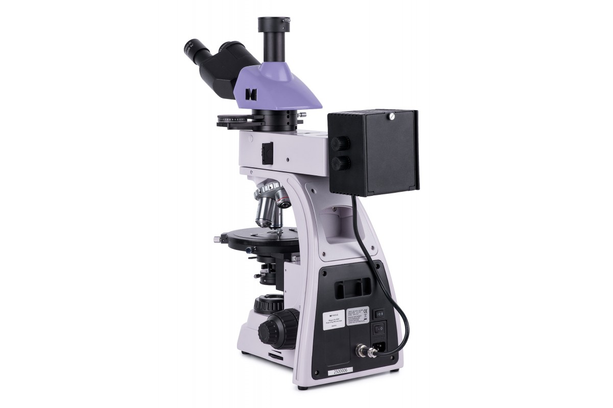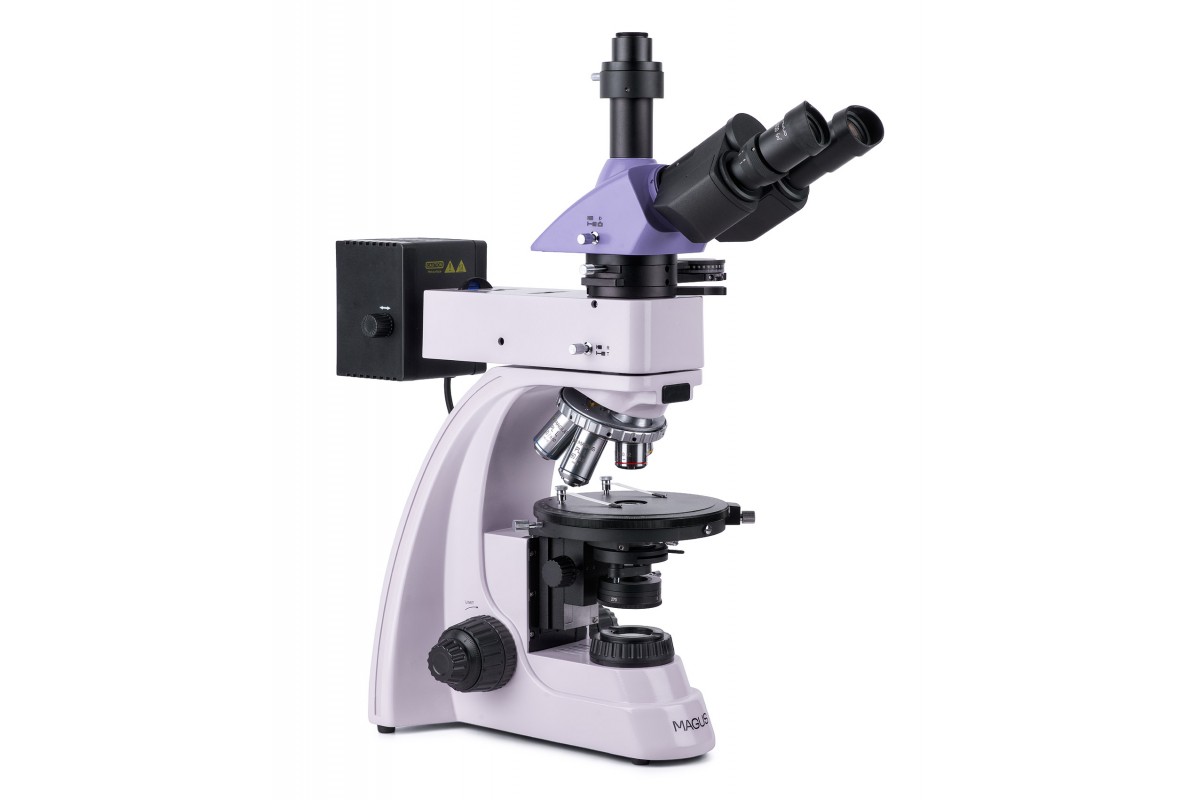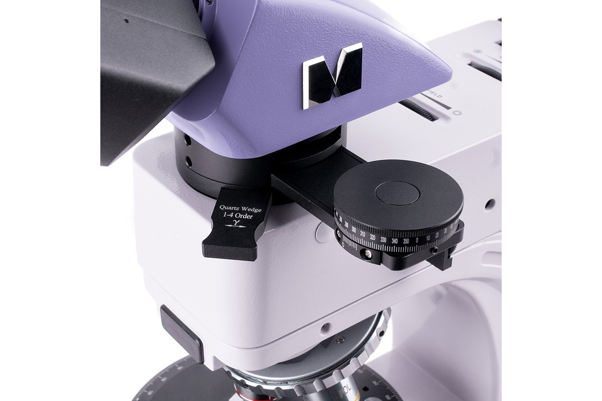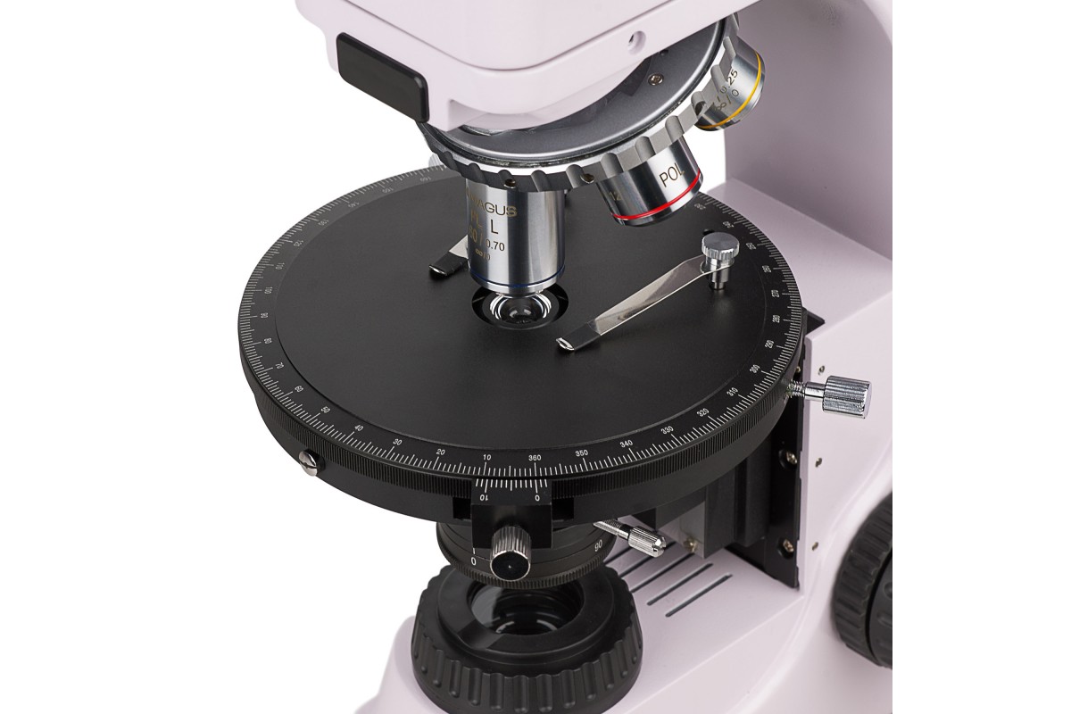 MAGUS Pol 850 – это профессиональный микроскоп для работы по методу поляризации в проходящем и отраженном свете. Также он поддерживает работу в светлом поле. Микроскоп предназначен для исследования геологических, биологических полимерных анизотропных объектов и непрозрачных аншлифов, толщина которых может достигать 15 мм. Одна сторона аншлифа должна быть отполирована. Микроскоп применяется в разных сферах науки: медицине, петрографии, минералогии, криминалистике и проч. **Оптическая схема** Планахроматические объективы рассчитаны на работу без покровного стекла и свободны от напряжений, т. е. не вносят ложных оптических эффектов в изображение. Оптика обеспечивает четкое и детализированное изображение по всему полю зрения. Всего в комплект включены четыре объектива, они устанавливаются в револьверное устройство с пятью гнездами. В оставшееся свободное гнездо может быть установлен опциональный объектив из линейки аксессуаров бренда. Гнезда револьвера центрируются. На микроскопе установлена тринокулярная насадка, имеющая отдельный канал визуализации для цифровой камеры (камера в комплектацию не включена). Световой поток может быть полностью направлен в окулярные тубусы или на камеру (деление 100/0 или 0/100). Для настройки оптики под особенности зрения пользователя можно воспользоваться диоптрийной подвижкой на левом окуляре. **Система освещения** Для освещения рабочей области используются галогенные лампы 30 Вт – для отраженного и проходящего света. Они ярко светят в «теплом» цветовом спектре, поэтому создают оптимальные условия для длительной работы на каждом объективе: образцы видны хорошо, а глаза не устают. Освещение может быть выставлено по методу Кёлера, т. е. изображение получится без артефактов, с высоким разрешением и без виньетирования. В отраженном свете доступно использование светофильтров. Поляризованный свет получается в результате взаимной работы анализатора и поляризатора: их поворотом относительно друг друга регулируют угол поляризации. Для коноскопии используется линза Бертрана – она расположена в промежуточной насадке. Там же находится слот для установки компенсаторов – с помощью компенсаторов повышают контраст объектов. **Механика** Предметный столик вращается, поэтому можно изменять преломление света внутри образца. Также столик может быть отцентрирован относительно оптической оси. На столике присутствуют отметки угла поворота и измерительная шкала. Для фокусировки используются рукоятки на корпусе микроскопа: резкость настраивают грубо и тонко. Ход грубой фокусировки можно сделать мягче или жестче – для удобства пользователя. Также для нее присутствует блокиратор хода. **Аксессуары** Раскрыть все возможности микроскопа помогут дополнительные аксессуары: объективы, окуляры, цифровые камеры, калибровочные слайды. Они представлены в линейке бренда MAGUS. **Основные особенности:** * Для работы по методу поляризации в отраженном и проходящем свете; доступен метод светлого поля * Канал визуализации для установки цифровой камеры; деление светового потока: 100% света на окуляры или 100% света на канал визуализации * Планахроматические объективы без напряжений не вносят оптических искажений в изображение * Источники проходящего и отраженного света – галогенные лампы 30 Вт; Кёлер для отраженного и прох