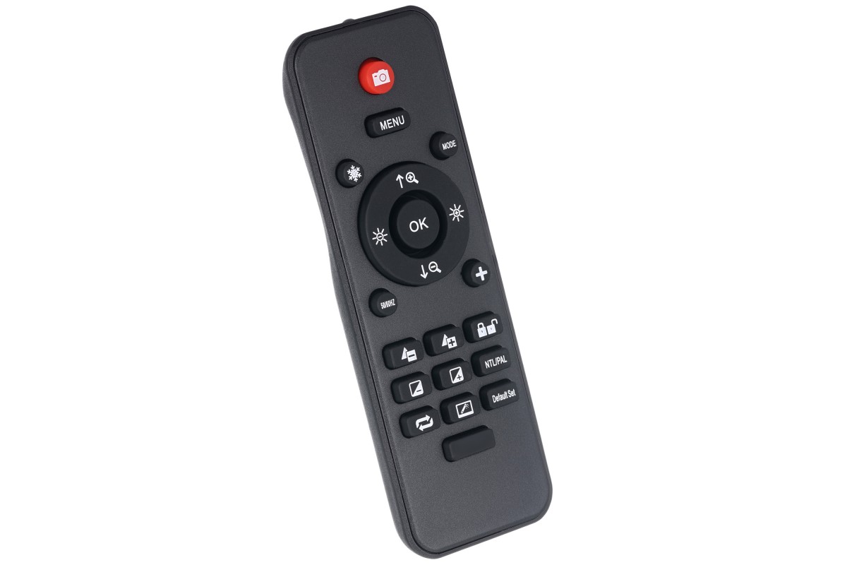 Кнопки управления микроскопом размещены на передней панели под ЖК-экраном, но также они продублированы на беспроводной пульт. Он позволяет регулировать увеличение, настраивать яркость подсветки, работать с фото и видео и многое другое.