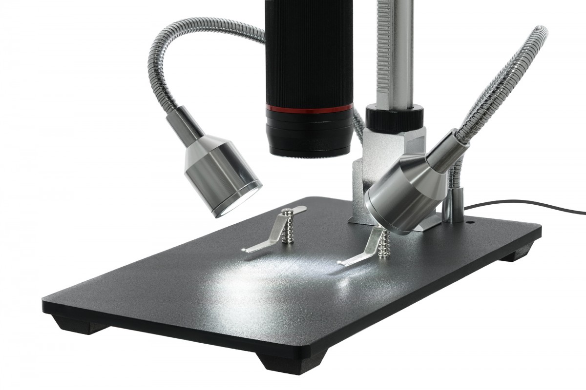 Подсветка находится над предметным столиком и реализована крайне интересно. Это два отдельно расположенных светодиода, закрепленные на гибких держателях. Благодаря этому свет можно направить на образец под любым углом, осветив даже труднодоступные области. Яркостью подсветки можно управлять при помощи переключателя на кабеле питания. Там же находится и кнопка включения/выключения прибора.