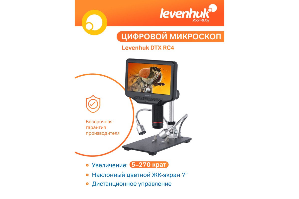 Микроскоп с дистанционным управлением Levenhuk DTX RC4 – это микроскоп для наблюдений и создания цифровых архивов с высококачественными фотографиями и видеороликами. Картинку можно выводить на внешний экран, а для управления использовать беспроводной пульт. Микроскоп удобен при работе в мастерской, сервисном центре или дома.