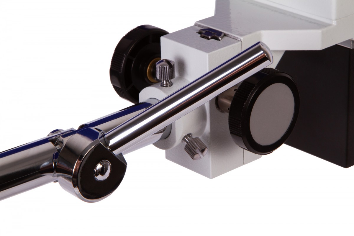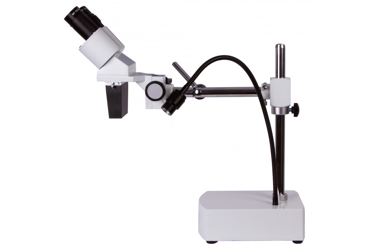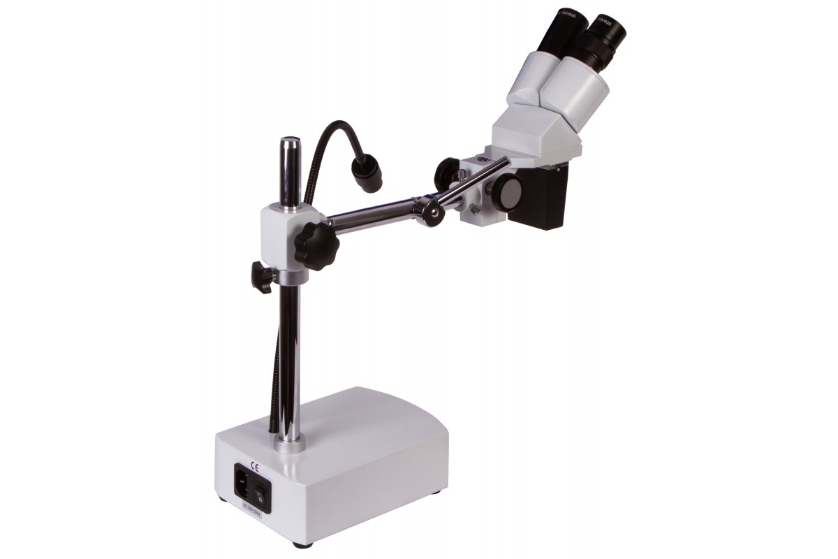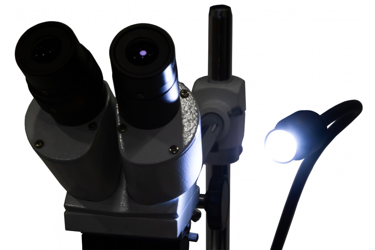 Микроскоп оснащен бинокулярной насадкой и использует широкоугольную оптику. Объективы сменные и различаются по степени приближения. Система освещения устроена необычным образом: это не фиксированный источник света, а светодиод, закрепленный на длинном гибком штативе. Яркость подсветки можно регулировать, а для ее работы требуется подключение к сети переменного тока.