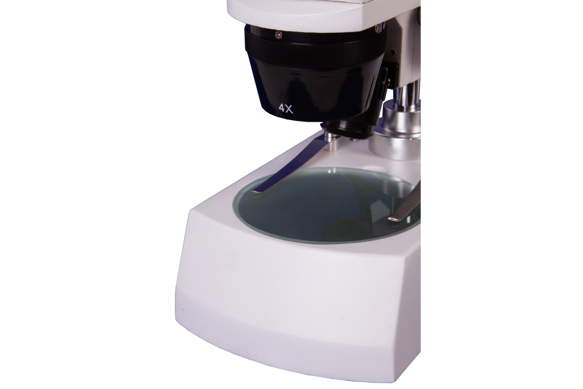 Подсветка состоит из верхнего и нижнего светодиодов. Оба имеют регулировку яркости и работают от стандартных батареек. Предметный столик нельзя двигать, а вот его поверхность можно менять: доступно матовое стекло и черно-белая пластина. Для удерживания микропрепаратов на столике используются стандартные зажимы.