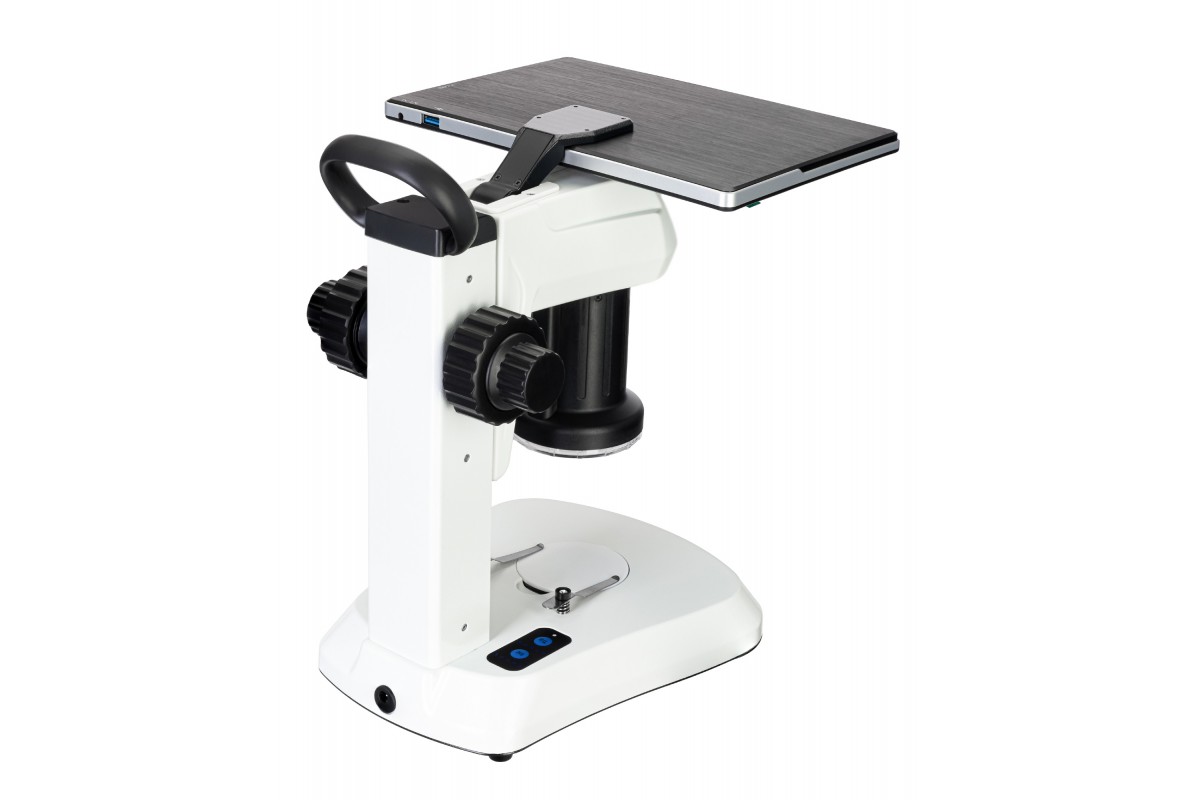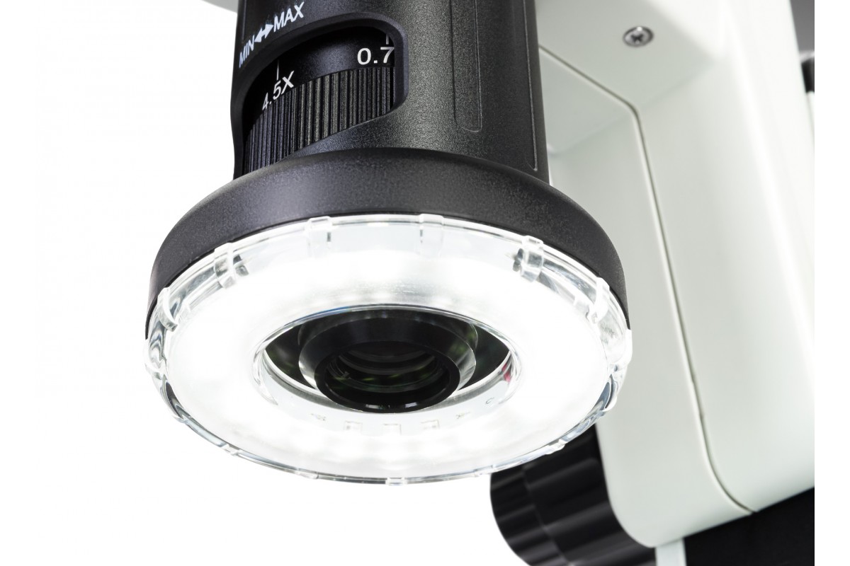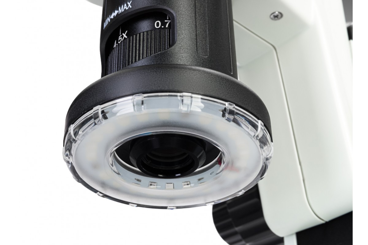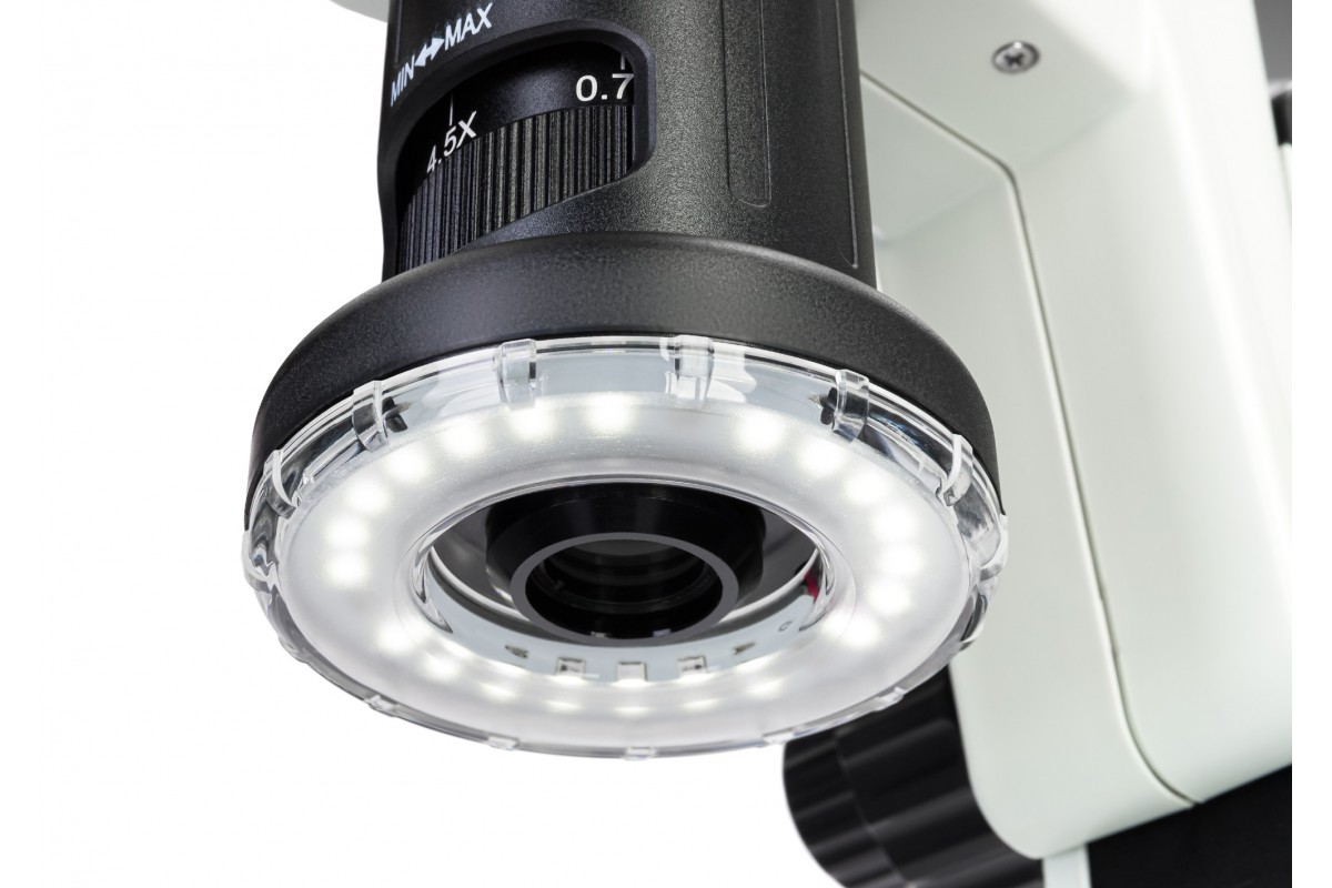 Система светодиодного освещения состоит из классического нижнего источника света и кольцевого верхнего осветителя, который создает бестеневое освещение. Доступна настройка яркости подсветки: всего пять уровней, причем для каждого осветителя регулировка может проводиться отдельно. Также можно откорректировать резкость при помощи ручек грубой и точной фокусировки.