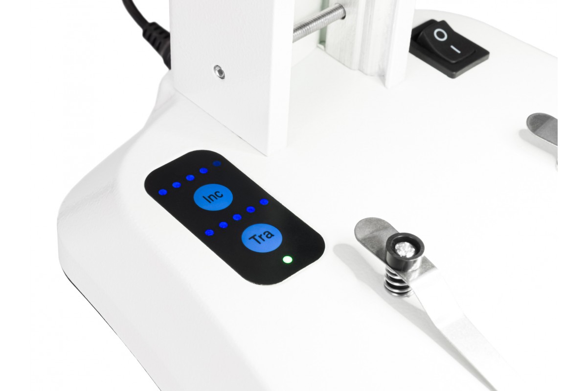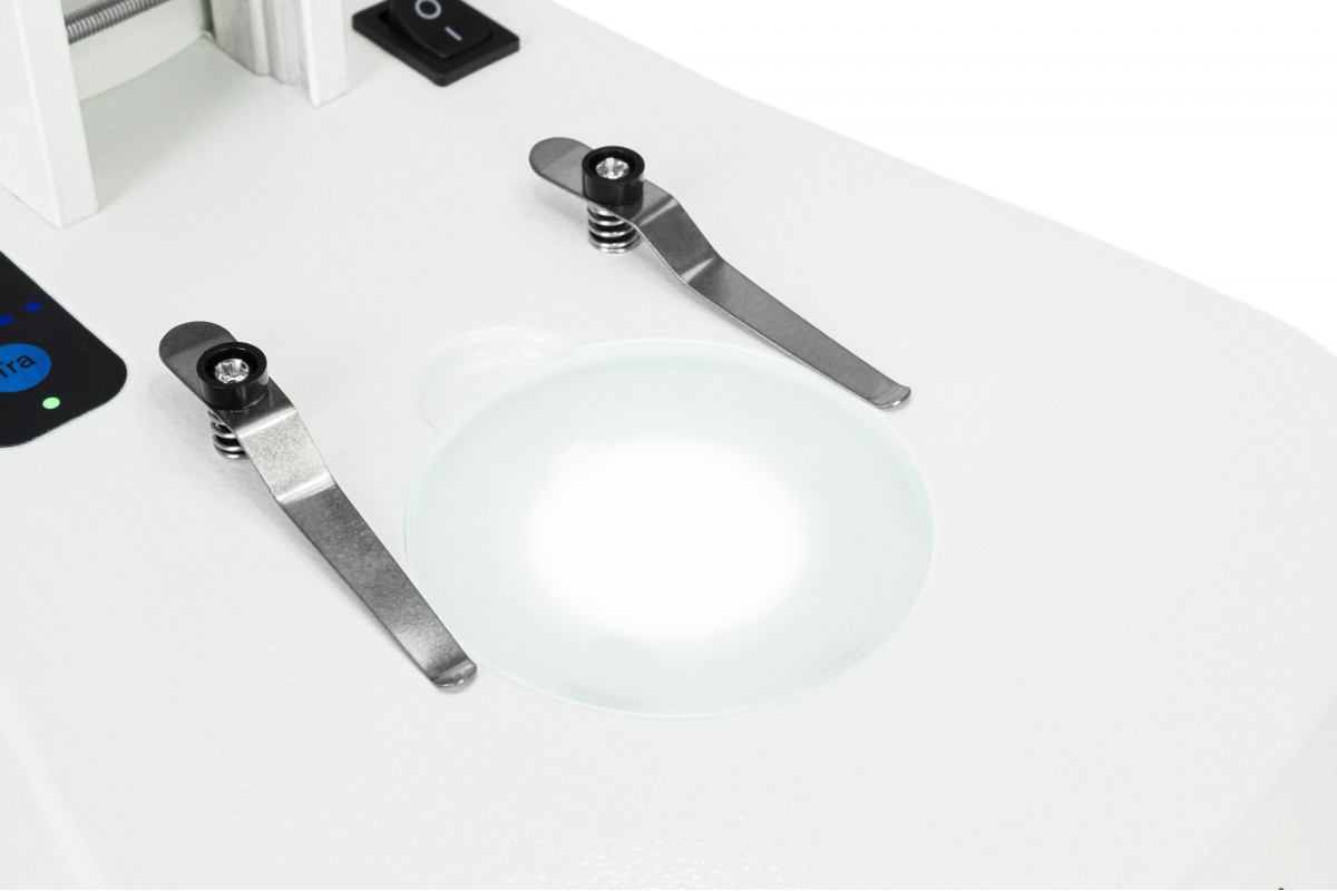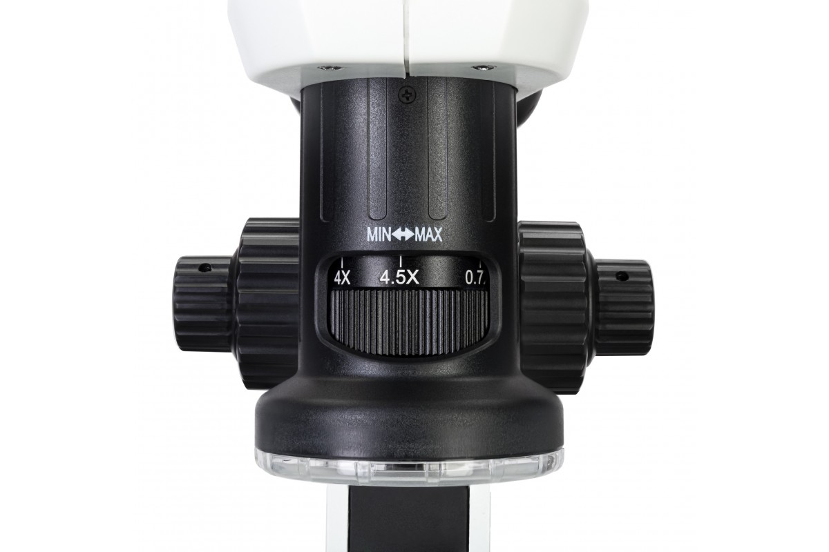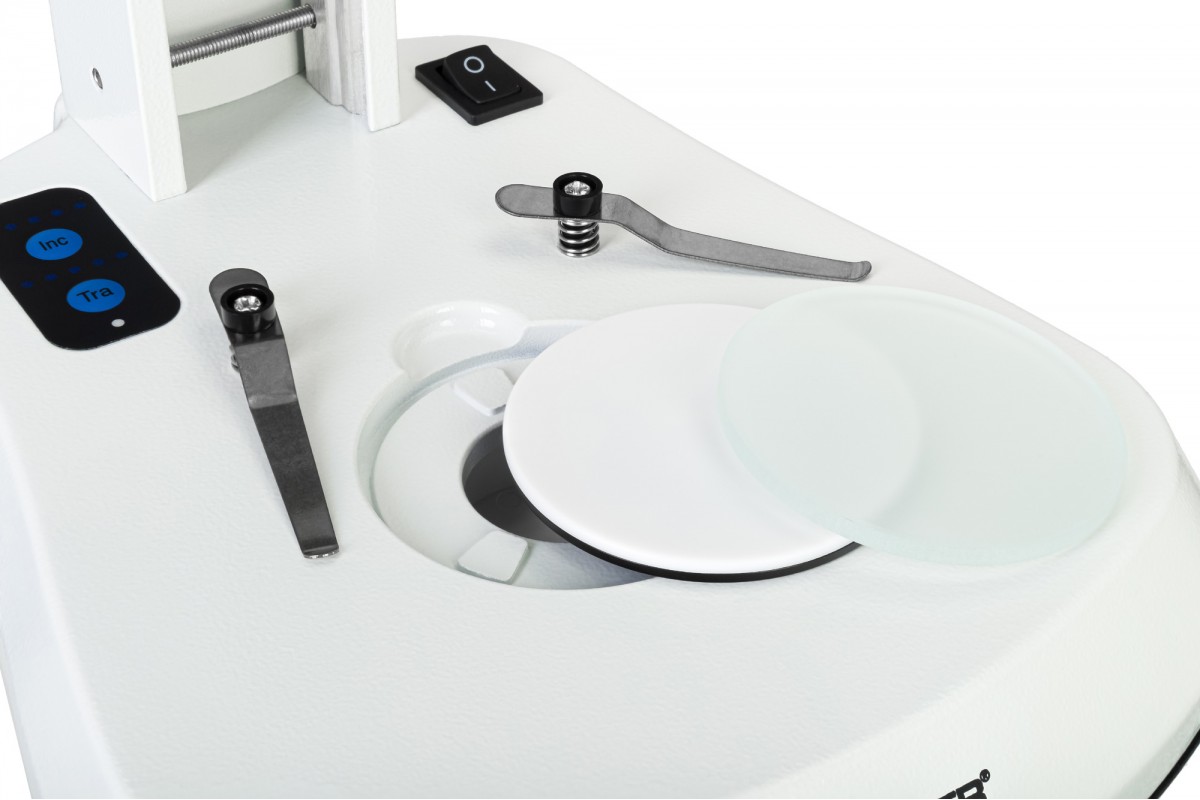 Система светодиодного освещения состоит из классического нижнего источника света и кольцевого верхнего осветителя, который создает бестеневое освещение. Доступна настройка яркости подсветки: всего пять уровней, причем для каждого осветителя регулировка может проводиться отдельно. Также можно откорректировать резкость при помощи ручек грубой и точной фокусировки.