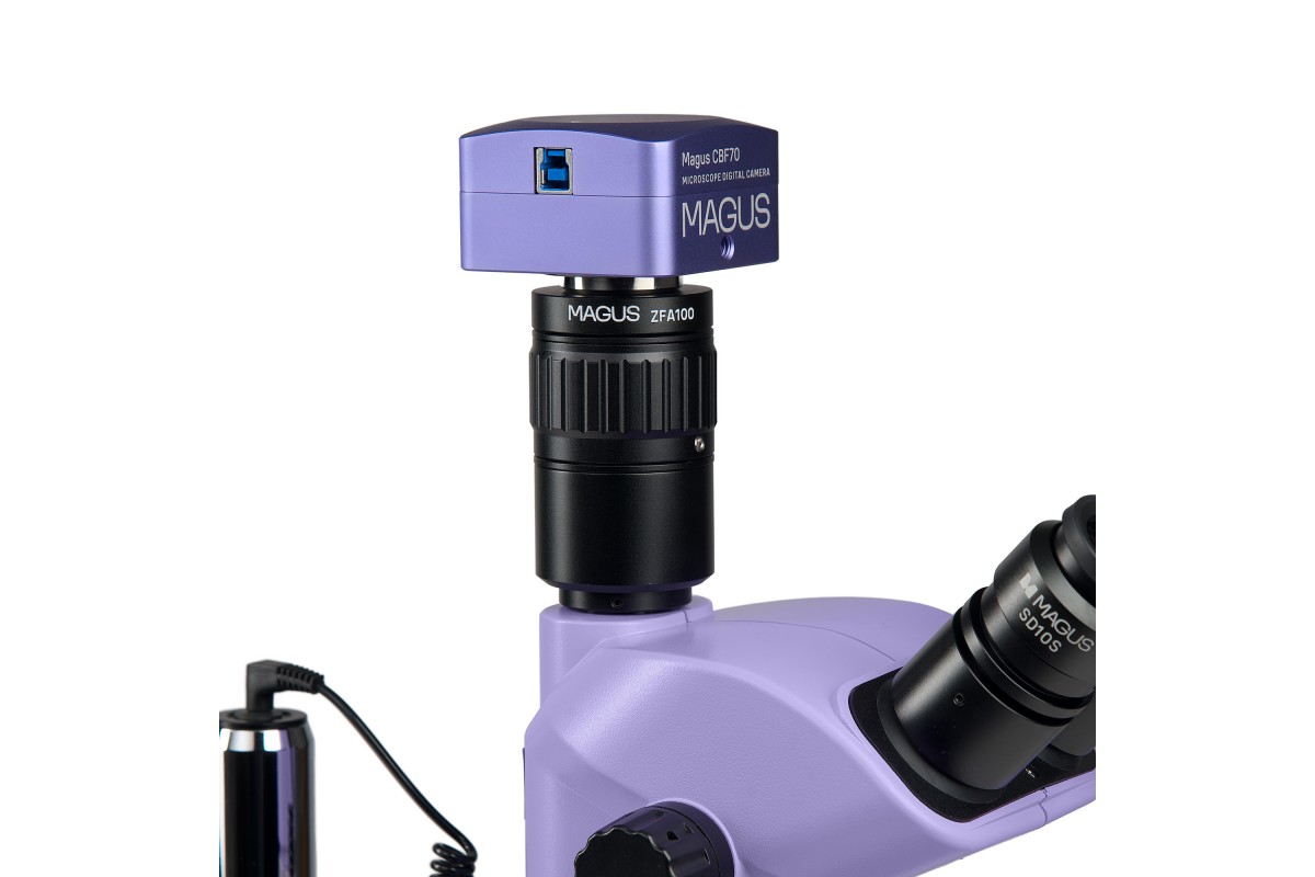 Цифровая камера, устанавливаемая в вертикальный канал микроскопа, выполняет важную функцию фиксации изображений. Прибор с разрешением 21 Мпикс предлагает пять режимов съемки для оптимизации баланса между детализацией и скоростью передачи кадров: начиная от 584x438 пикс (192 FPS) и заканчивая 5280x3954 пикс (17 FPS). В основе камеры лежит цветной CMOS-сенсор SONY Exmor с обратной засветкой и большим физическим размером (4/3″). Это позволяет получать яркие, контрастные и детализированные изображения даже при недостаточном внешнем освещении, снижая уровень шума и передавая глубину цвета. Поле зрения при минимальном увеличении микроскопа составляет 26,76х20 мм (при использовании однократного адаптера из комплекта поставки).