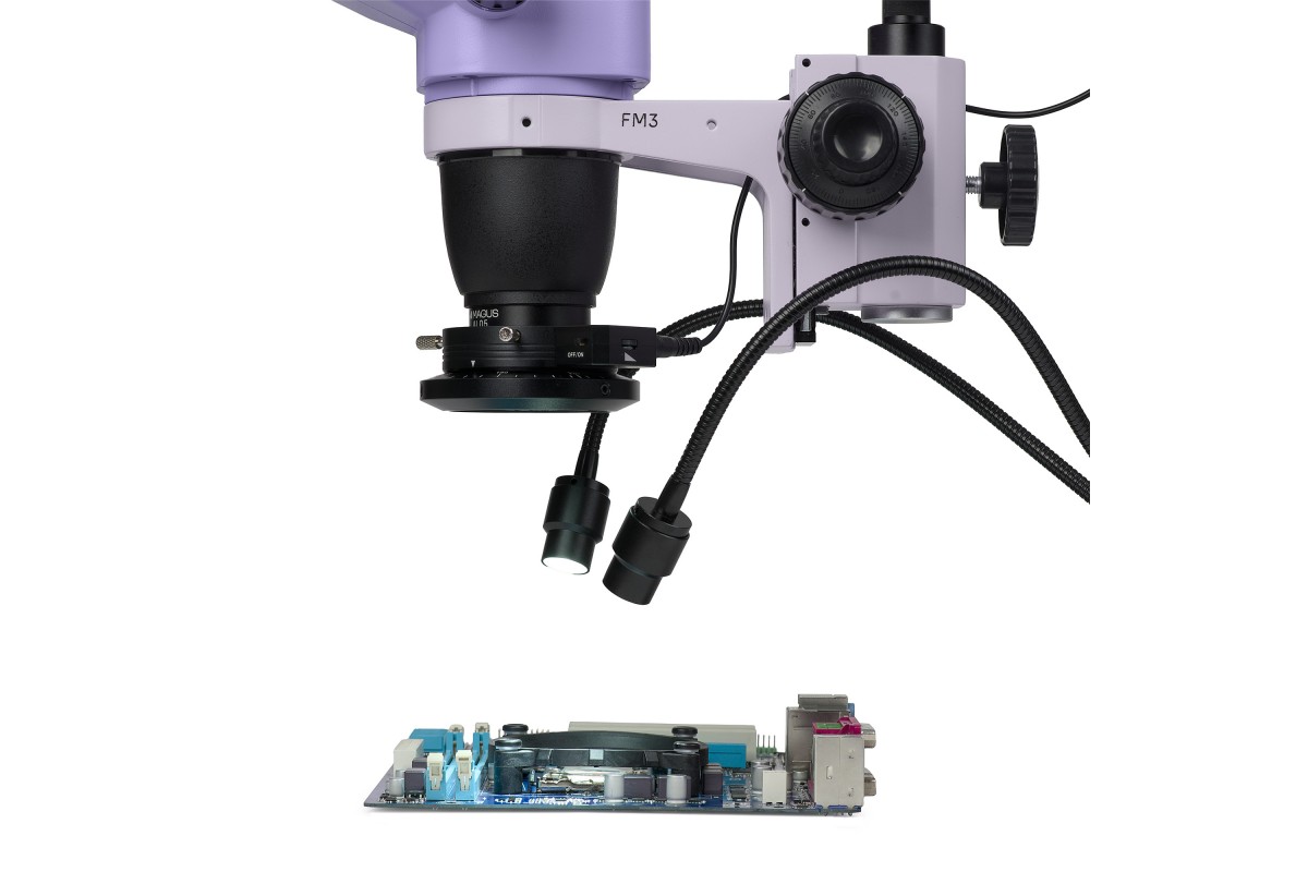 Тринокулярный микроскоп с монитором подойдет тем, кто предпочитает смотреть на печатную плату вперед, а не вниз. Такой способ наблюдения потребует некоторого времени для приобретения привычки, зато спина и шея не будут уставать. Также эта модель подойдет и преподавателям, которые обучают студентов.