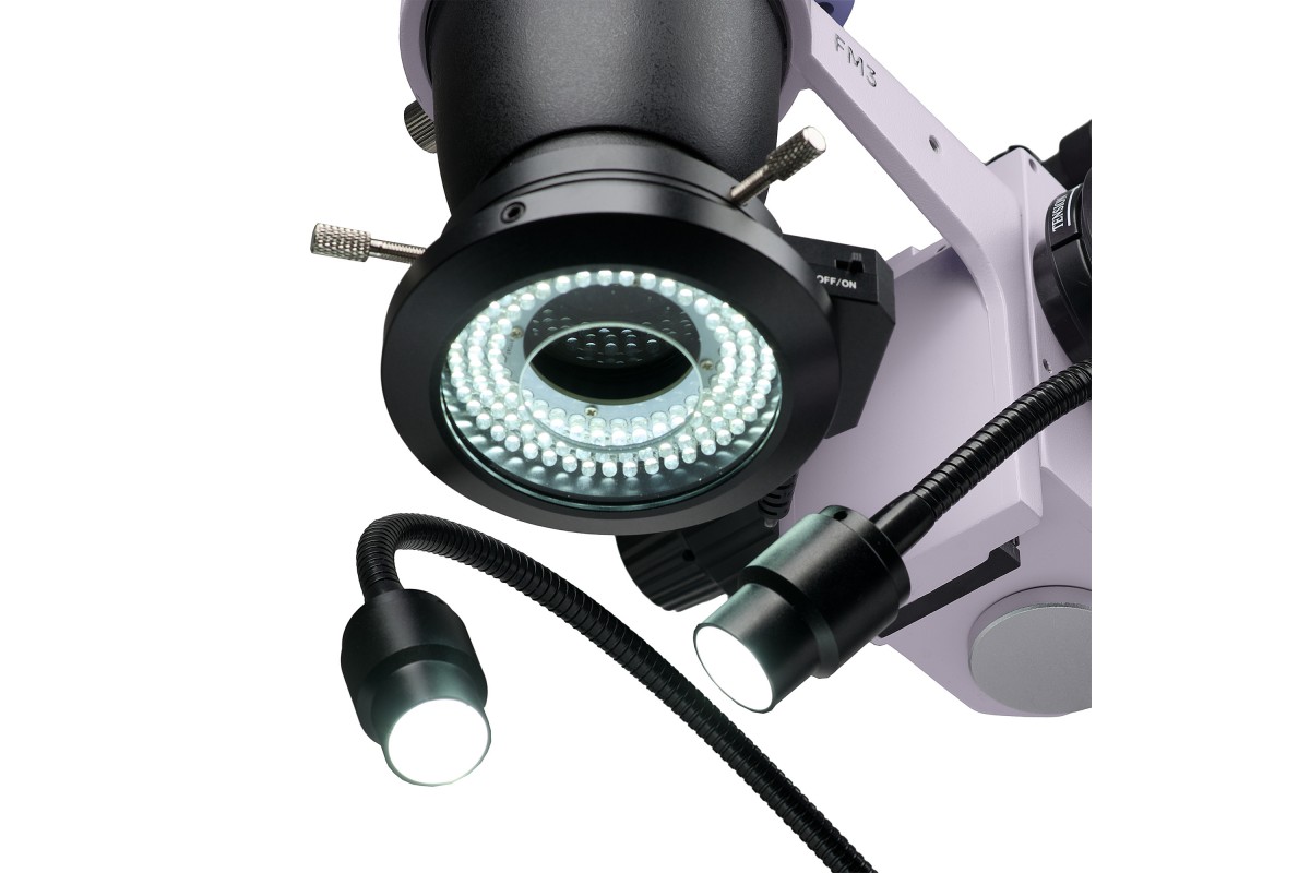 Микроскоп оснащен двумя осветителями отраженного света: кольцевым с поляризационным фильтром и осветителем типа «гусиная шея».
