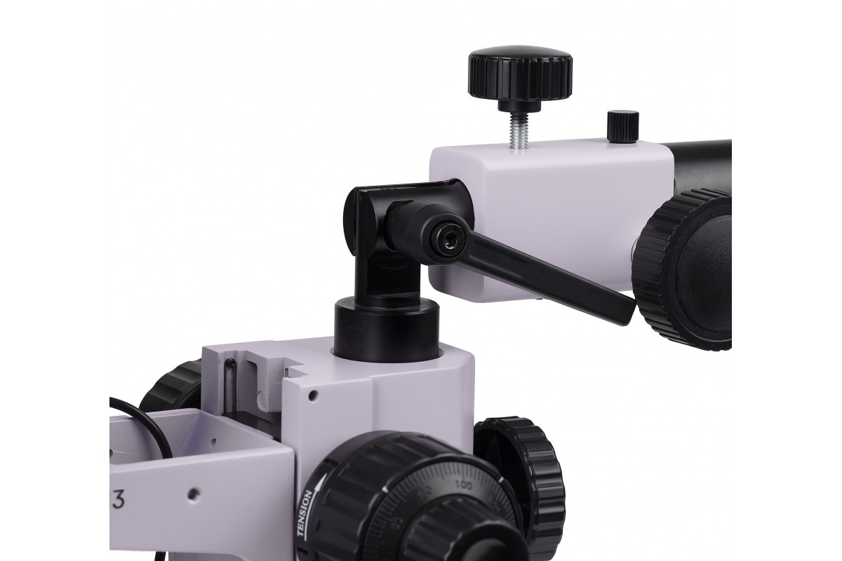 Штатив заканчивается механизмом, который изменяет угол наклона оптической оси. При необходимости оператор наблюдает под углом объект, который лежит на столе. Эта функция добавляет удобство и для манипуляций, и для проверки качества пайки, и для изучения изогнутых объектов.