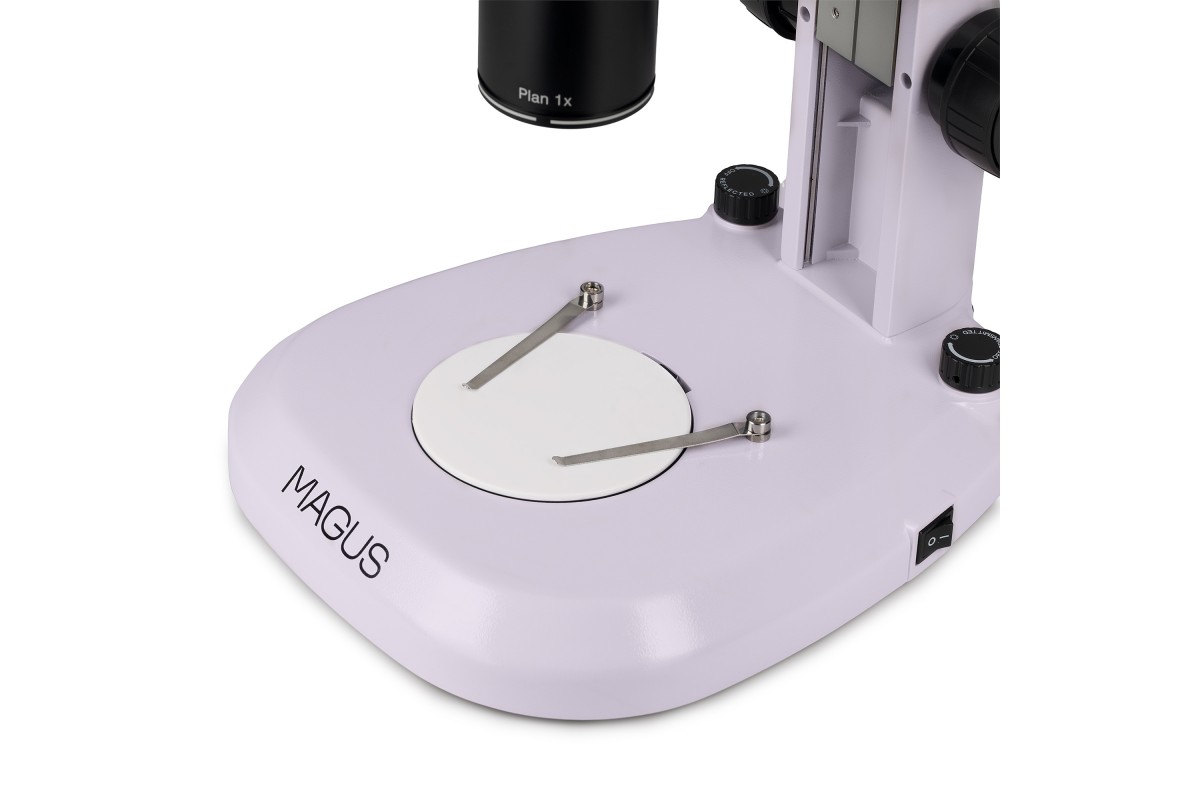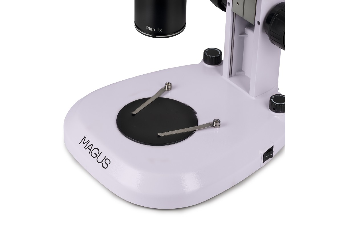 Стереомикроскоп Аббе имеет два оптических канала, которые соединяются в главном объективе. Начинаются они в окулярных тубусах. Модель MAGUS Stereo A10 оснащена бинокулярной визуальной насадкой, ее тубусы имеют наклон 20° над горизонтальной плоскостью – такое положение комфортно при продолжительных исследованиях. Система диоптрийной подстройки на тубусах не предусмотрена. В микроскоп можно установить цифровую камеру: для этого используйте промежуточную насадку с фотовыходом и адаптер C-mount.