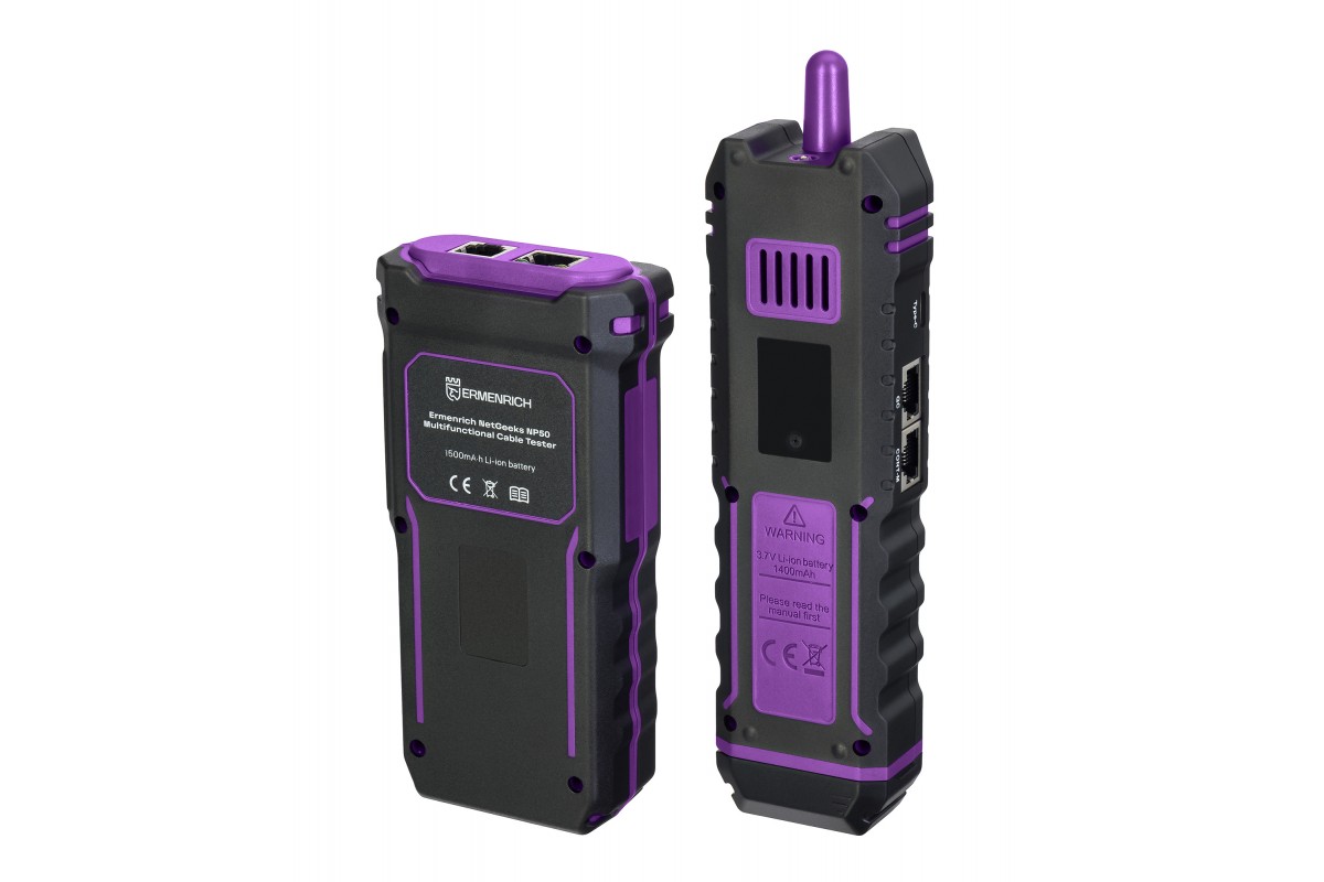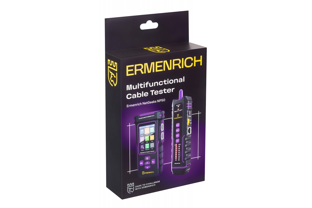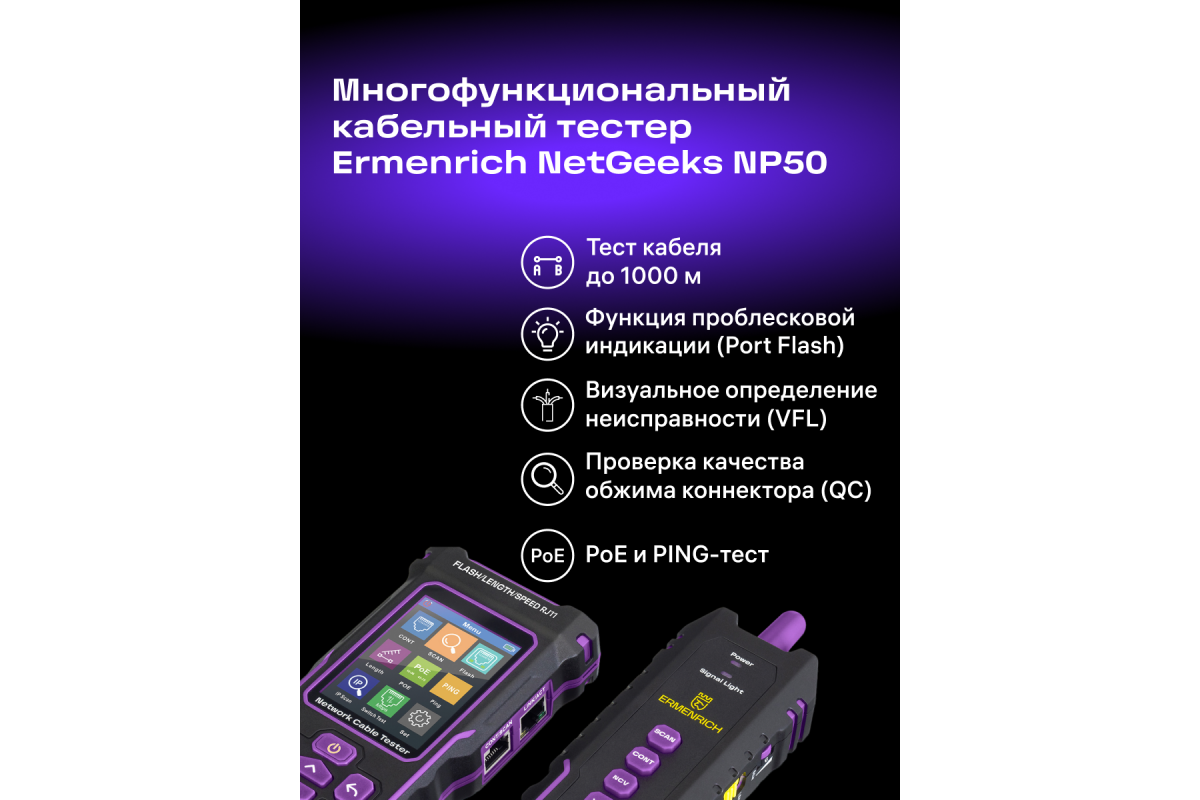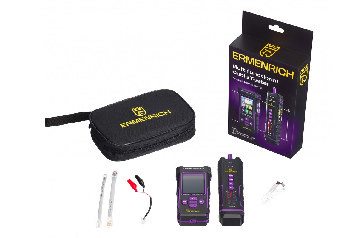 Многофункциональный кабельный тестер Ermenrich NetGeeks NP50 – компактное портативное устройство для диагностики кабелей, измерения их длины и определения наиболее важных показателей сети. Инструмент позволяет проводить тесты PoE и PING, имеет функции NCV (бесконтактное определение напряжения) и VFL (визуальный локатор неисправностей), помогает в определении полярности, оценке качества обжима коннектора. Тестер помогает идентифицировать провода с металлическими сердечниками: сетевые, телефонные, электрические; подходит для диагностики кабелей STP/UTP категорий 5/5E/6/6A.