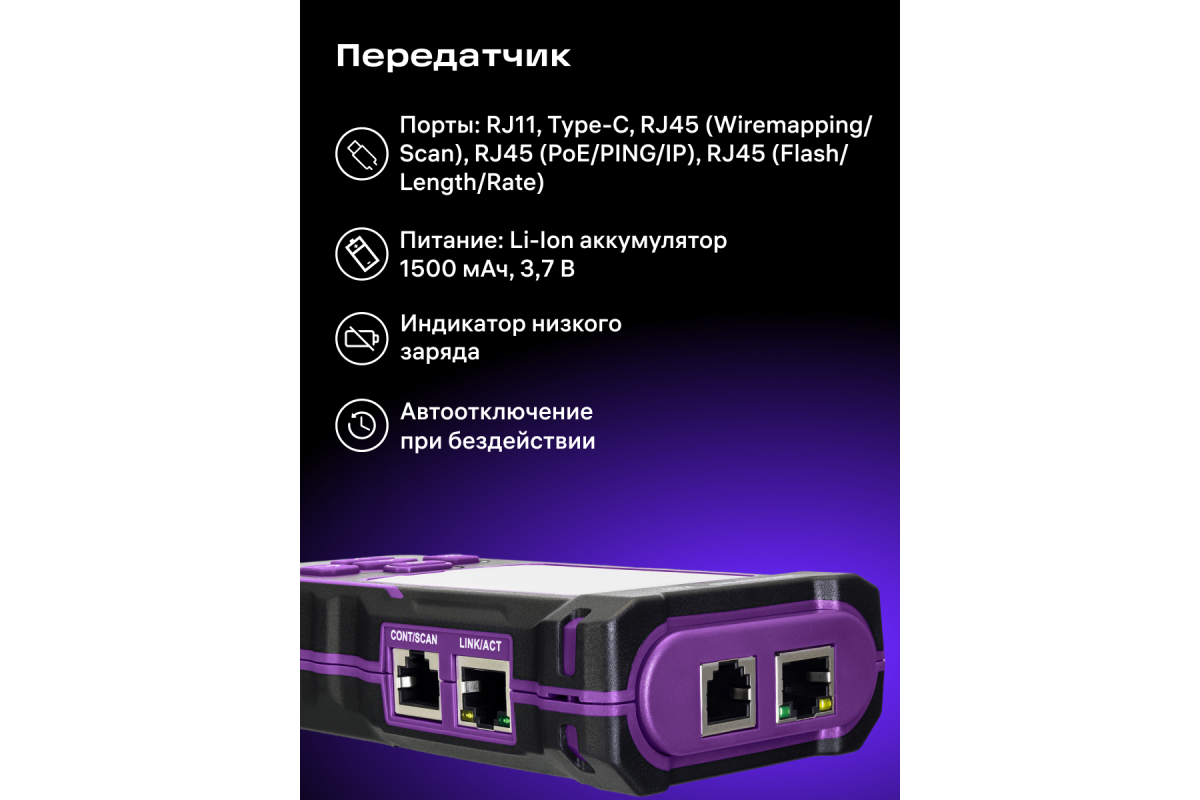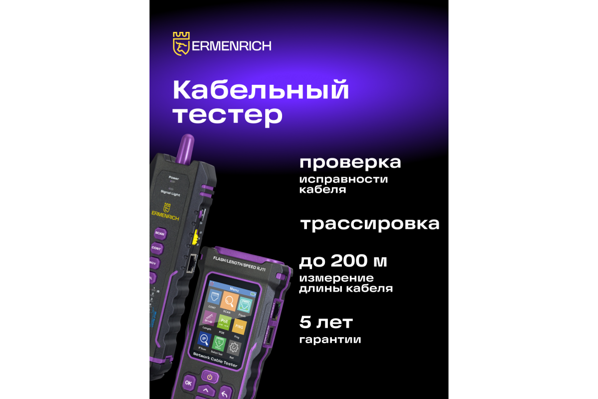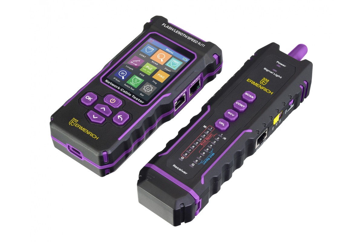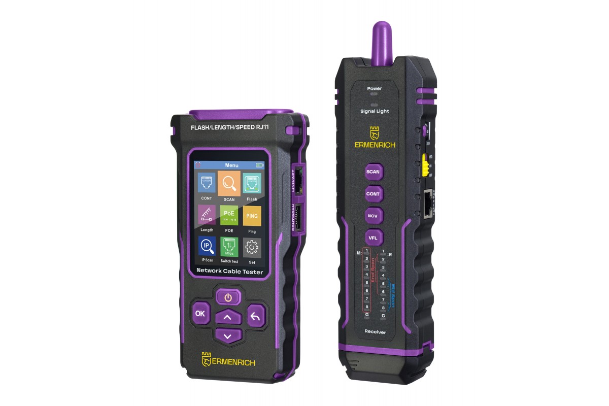 Многофункциональный кабельный тестер Ermenrich NetGeeks NP50 – компактное портативное устройство для диагностики кабелей, измерения их длины и определения наиболее важных показателей сети. Инструмент позволяет проводить тесты PoE и PING, имеет функции NCV (бесконтактное определение напряжения) и VFL (визуальный локатор неисправностей), помогает в определении полярности, оценке качества обжима коннектора. Тестер помогает идентифицировать провода с металлическими сердечниками: сетевые, телефонные, электрические; подходит для диагностики кабелей STP/UTP категорий 5/5E/6/6A.