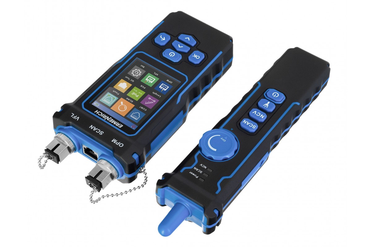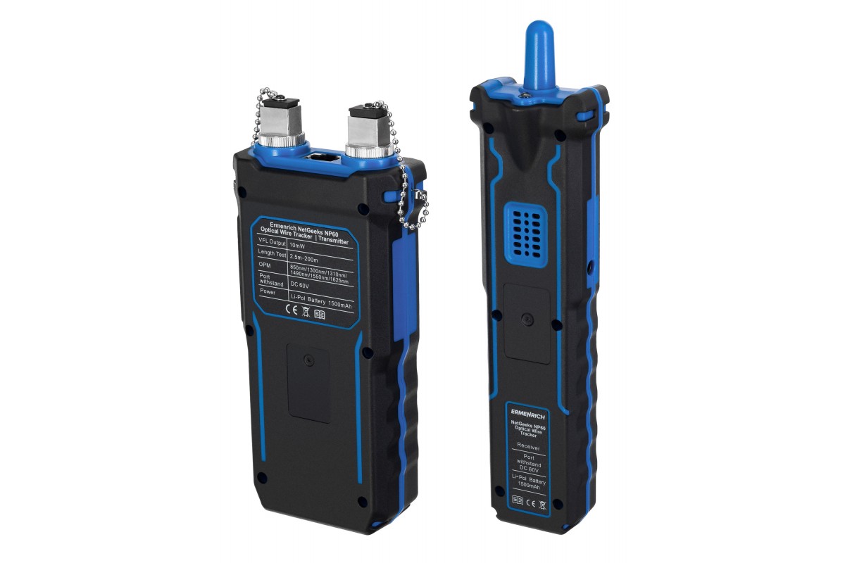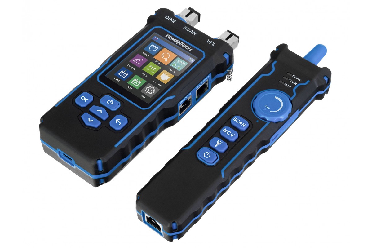 Комплект кабельного тестера Ermenrich NetGeeks NP60 включает в себя передатчик с цветным ЖК-дисплеем и кнопками управления и приемник со встроенным фонариком. Передатчик и приемник оснащены литий-полимерными аккумуляторами емкостью 1500 мАч. Зарядка осуществляется через кабель USB Type-C (входит в комплектацию).