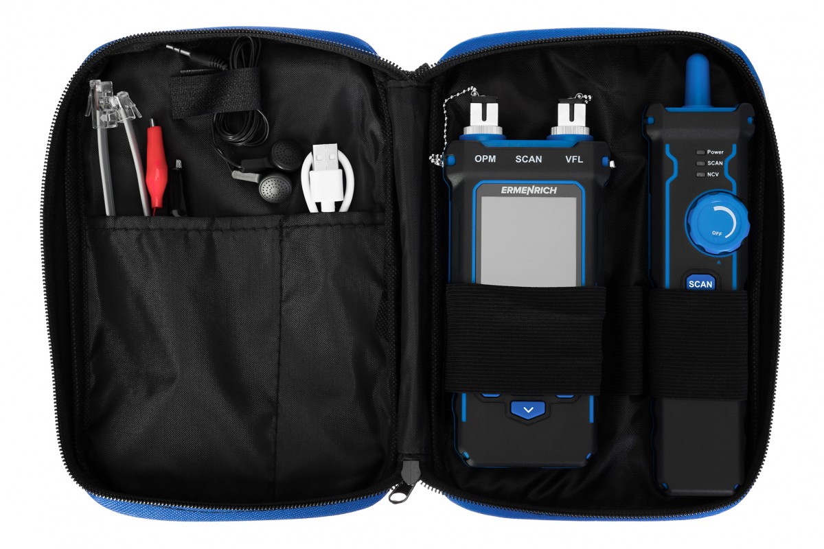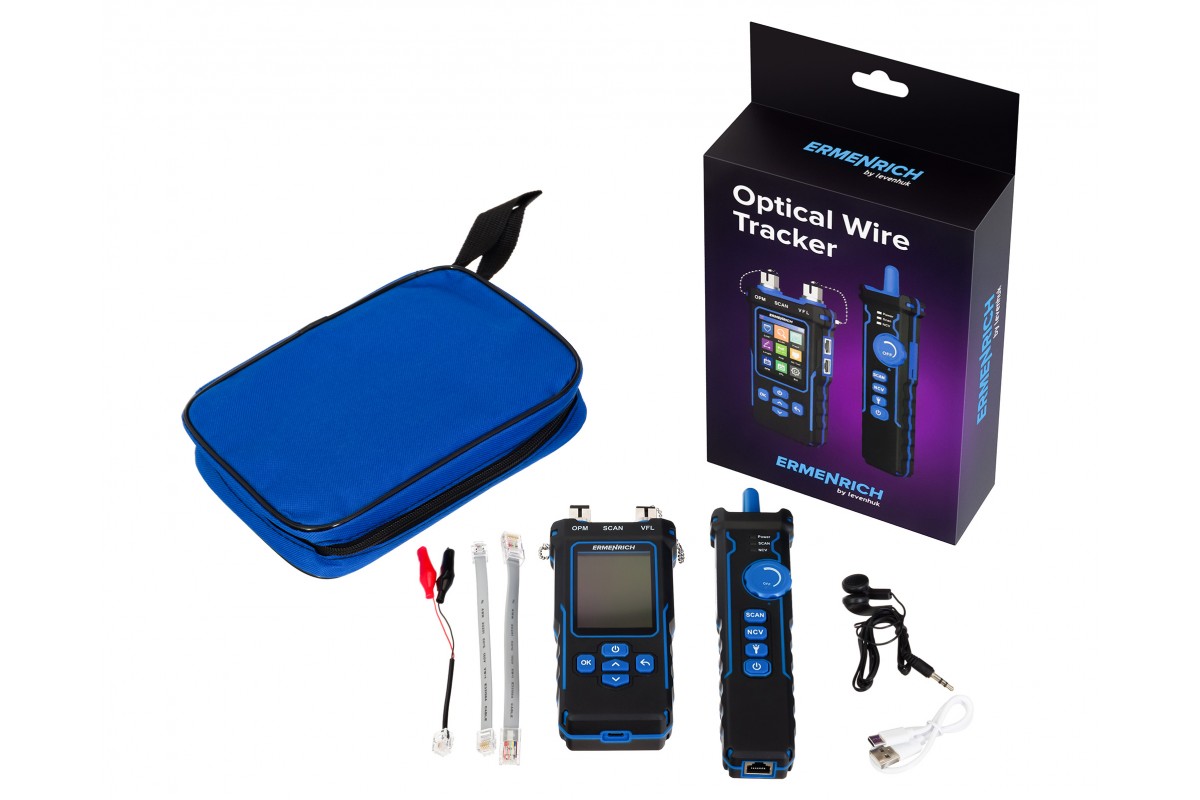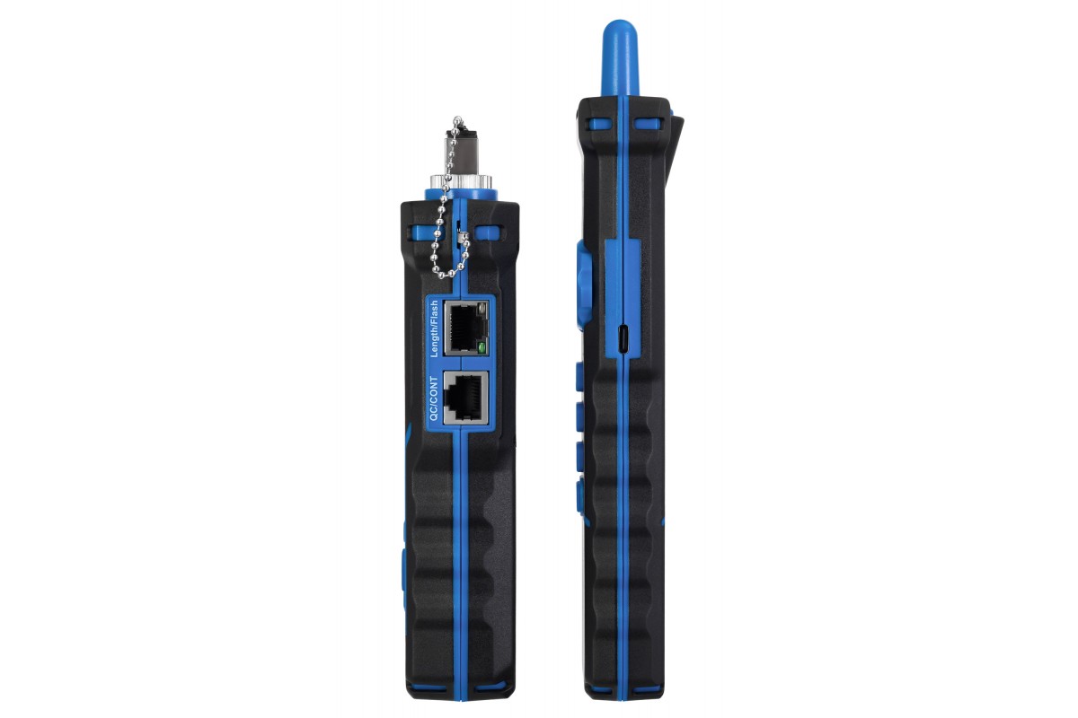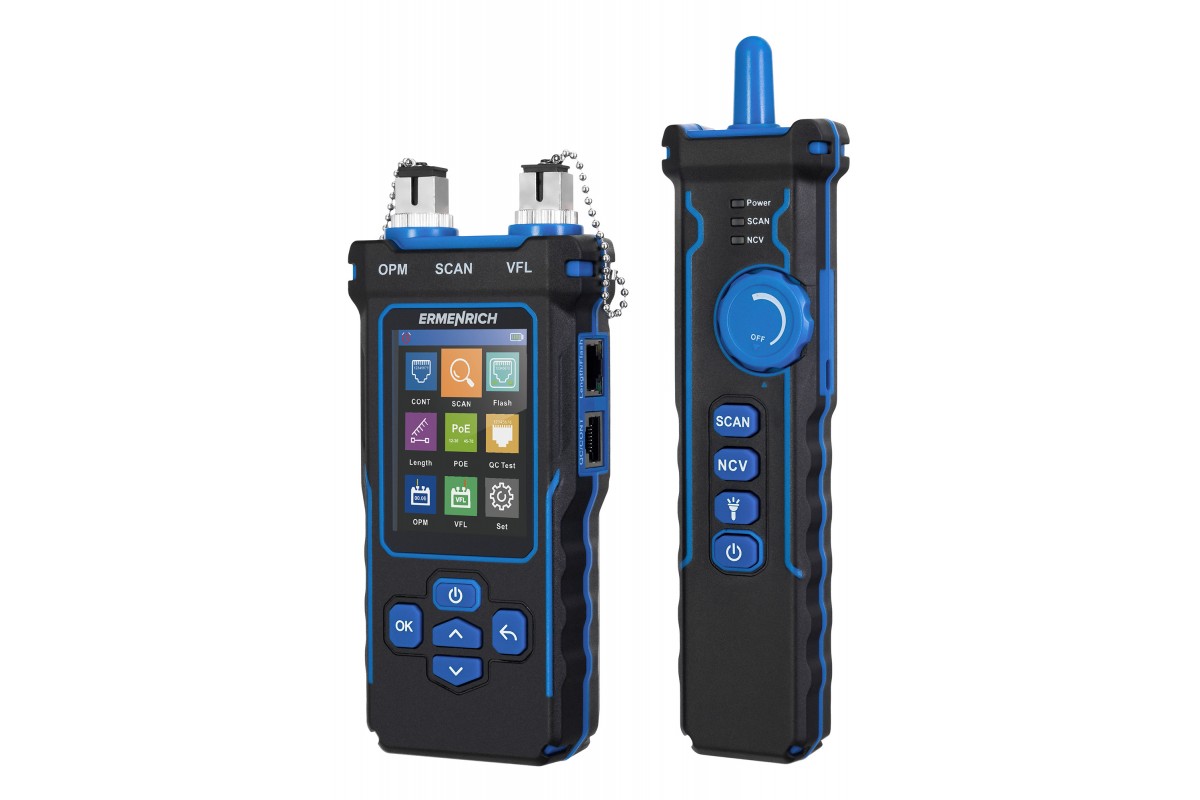 Комплект кабельного тестера Ermenrich NetGeeks NP60 включает в себя передатчик с цветным ЖК-дисплеем и кнопками управления и приемник со встроенным фонариком. Передатчик и приемник оснащены литий-полимерными аккумуляторами емкостью 1500 мАч. Зарядка осуществляется через кабель USB Type-C (входит в комплектацию).