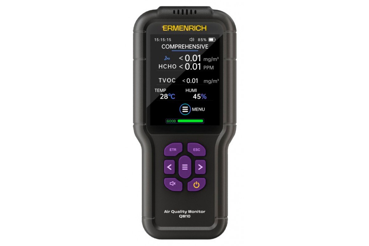 Монитор качества воздуха Ermenrich QM10 предназначен для оперативного анализа воздуха на предмет загрязнения в жилых и коммерческих помещениях – квартирах, офисах, школах, гостиницах, кафе и магазинах. Прибор обнаруживает более 23 видов опасных летучих соединений, включая бензолы, алканы, ароматические углеводороды, олефины, галогенированные углеводороды, сложные эфиры, альдегиды, кетоны и др. Он оснащен многоуровневой сигнализацией, помогающей быстро реагировать на измеренные показатели, когда те требуют срочного внимания. При превышении допустимых концентраций формальдегида (HCHO) или общего уровня летучих органических соединений (TVOC) монитор подает звуковой сигнал (зуммер) и световое предупреждение. Звук тревоги при необходимости можно отключить – это опция остается на усмотрение пользователя.