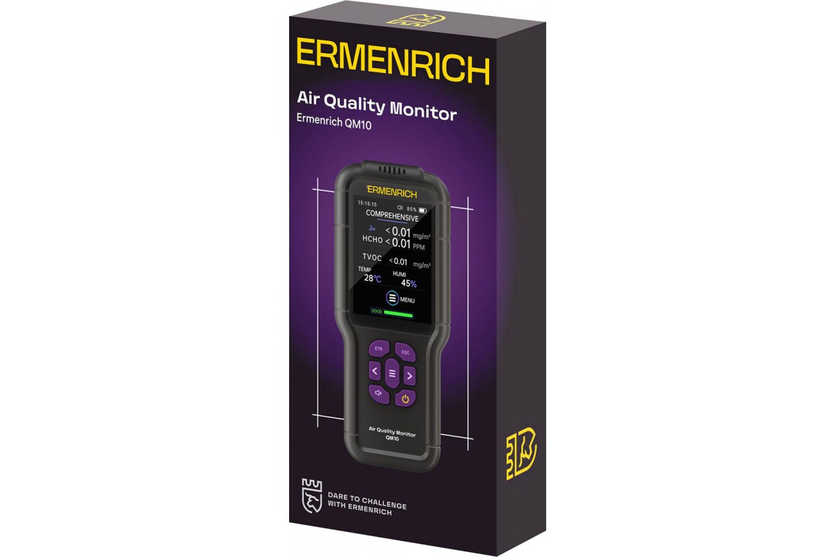 Для точности измерений датчик TVOC требует калибровки при первом включении устройства и далее каждые 12 часов эксплуатации. Процесс занимает мало времени и выполняется автоматически – прибор уведомляет пользователя о готовящейся операции за 10 секунд до ее начала. Результаты всех измерений отображаются на 3,2-дюймовом цветном LCD-экране, на который также выводятся актуальные время и дата – так, на одном ярком и легко читаемом дисплее можно контролировать как показатели, так и время работы. Корпус Ermenrich QM10 изготовлен из прочного и надежного ABS-пластика с силиконовыми кнопками из материала HTV, обеспечивающими тактильное удобство использования.