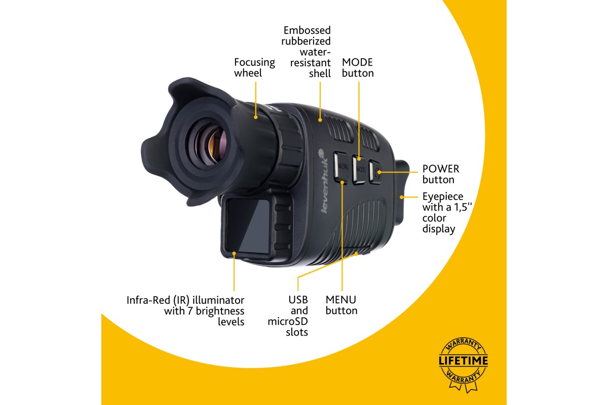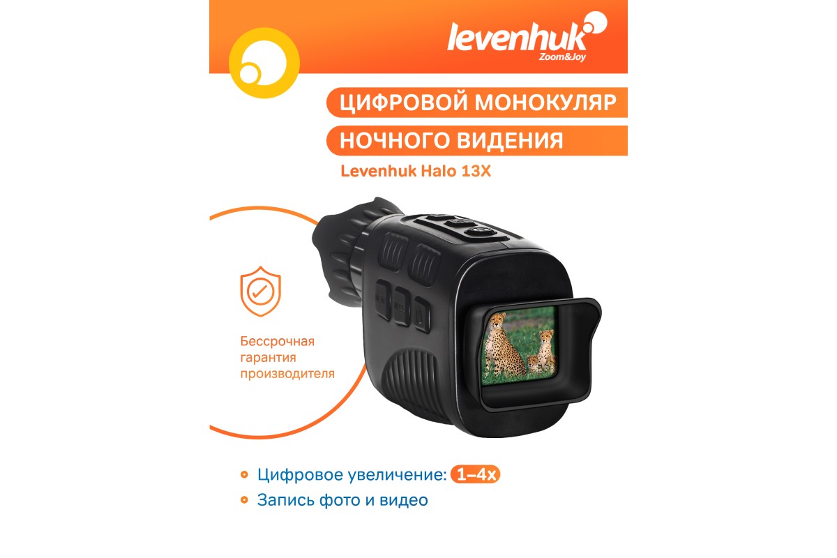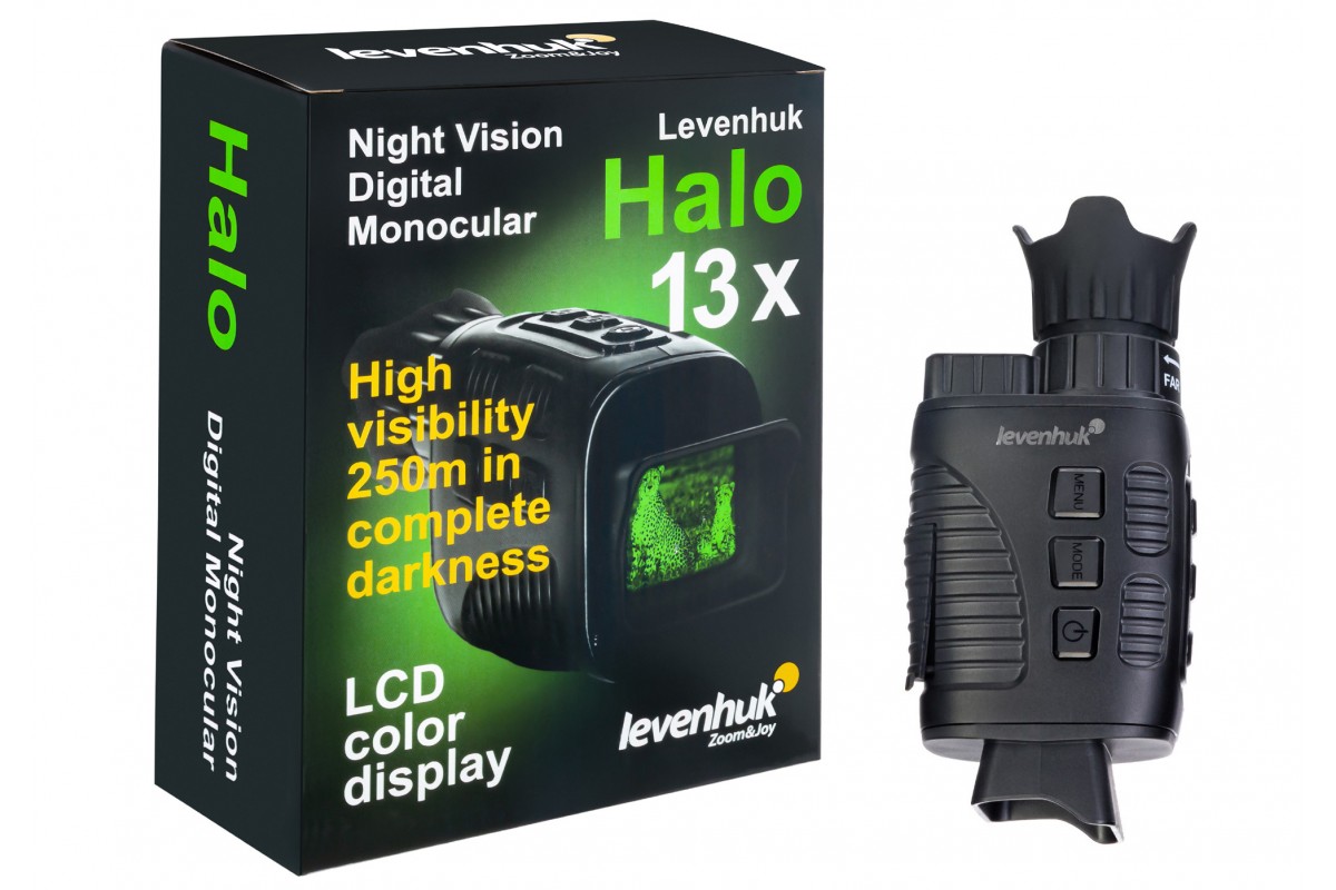 Монокуляр ночного видения Levenhuk Halo 13X снабжен цифровым преобразователем, поэтому не боится засветки и может использоваться как обычный монокуляр. Прибор станет прекрасным выбором для охоты, поможет обеспечить безопасность лагеря в походе, подойдет для тактических и спортивных игр на незнакомой местности. Благодаря встроенному рекордеру монокуляр также можно использовать для фотографирования и записи видеороликов наблюдений.