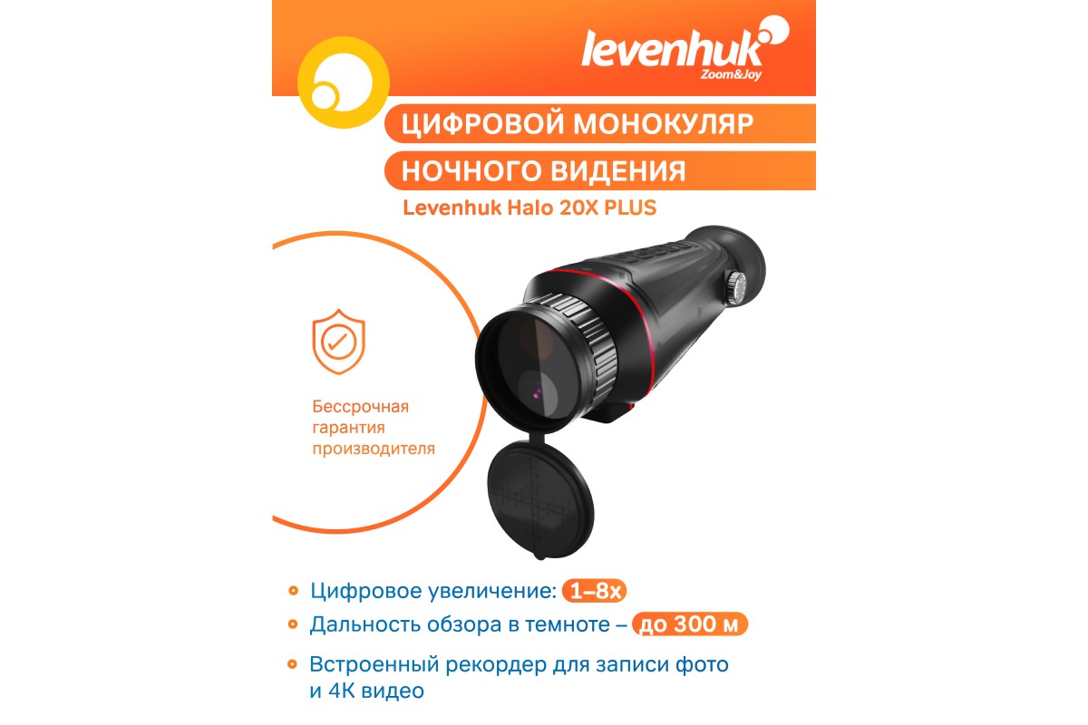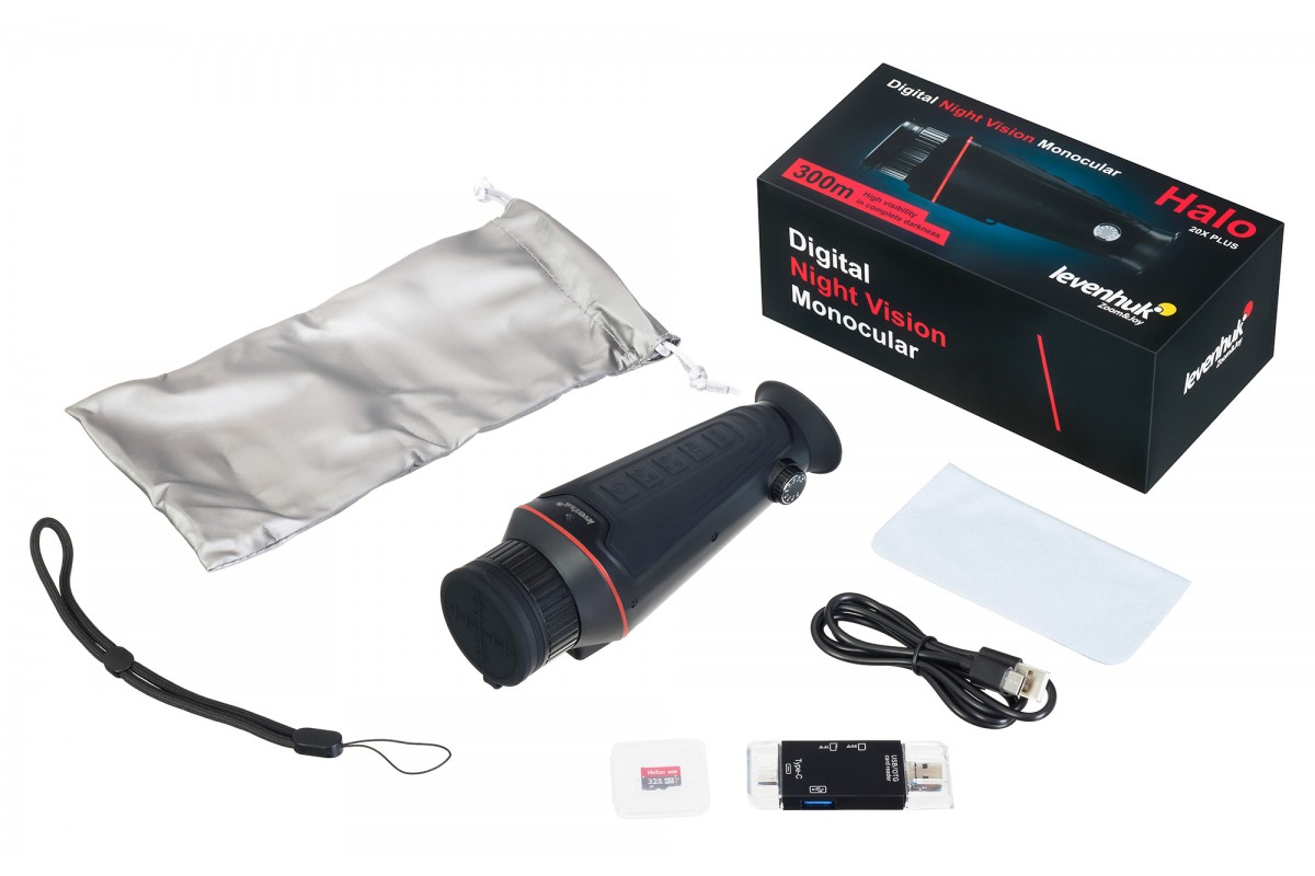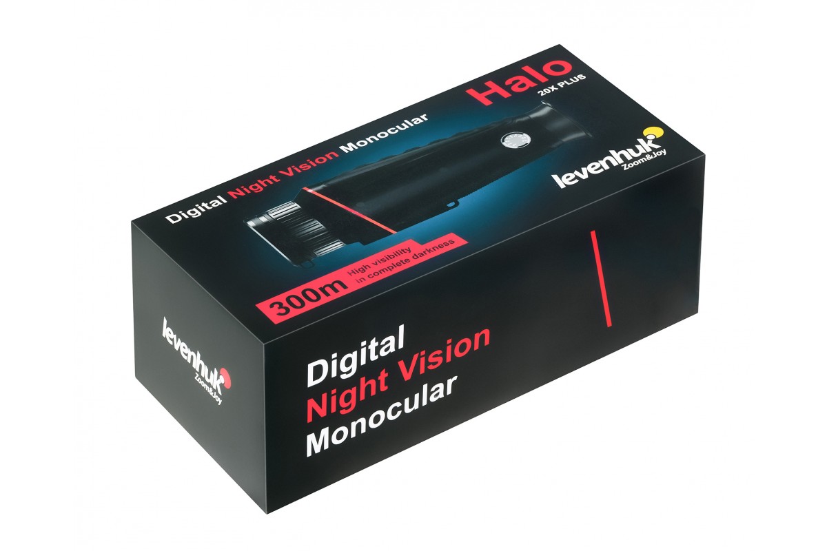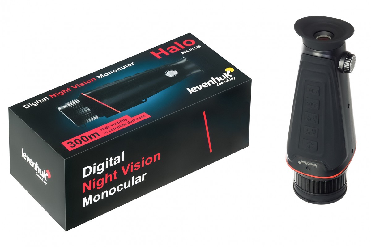 Levenhuk Halo 20X PLUS – монокуляр с функцией ночного видения и широкими возможностями настройки под конкретные условия. Прибор оснащен инфракрасным осветителем с семью уровнями яркости для работы в слабом свете или в полной темноте – уровень пользователь устанавливает вручную, отталкиваясь от условий окружающей среды. Ночью при базовых настройках изображение будет выводиться в черно-белом цвете, днем картинка будет цветной или черно-белой – на выбор пользователя. Для дневного и ночного режимов можно использовать дополнительные эффекты: «светящийся зеленый» или «цветная пленка».