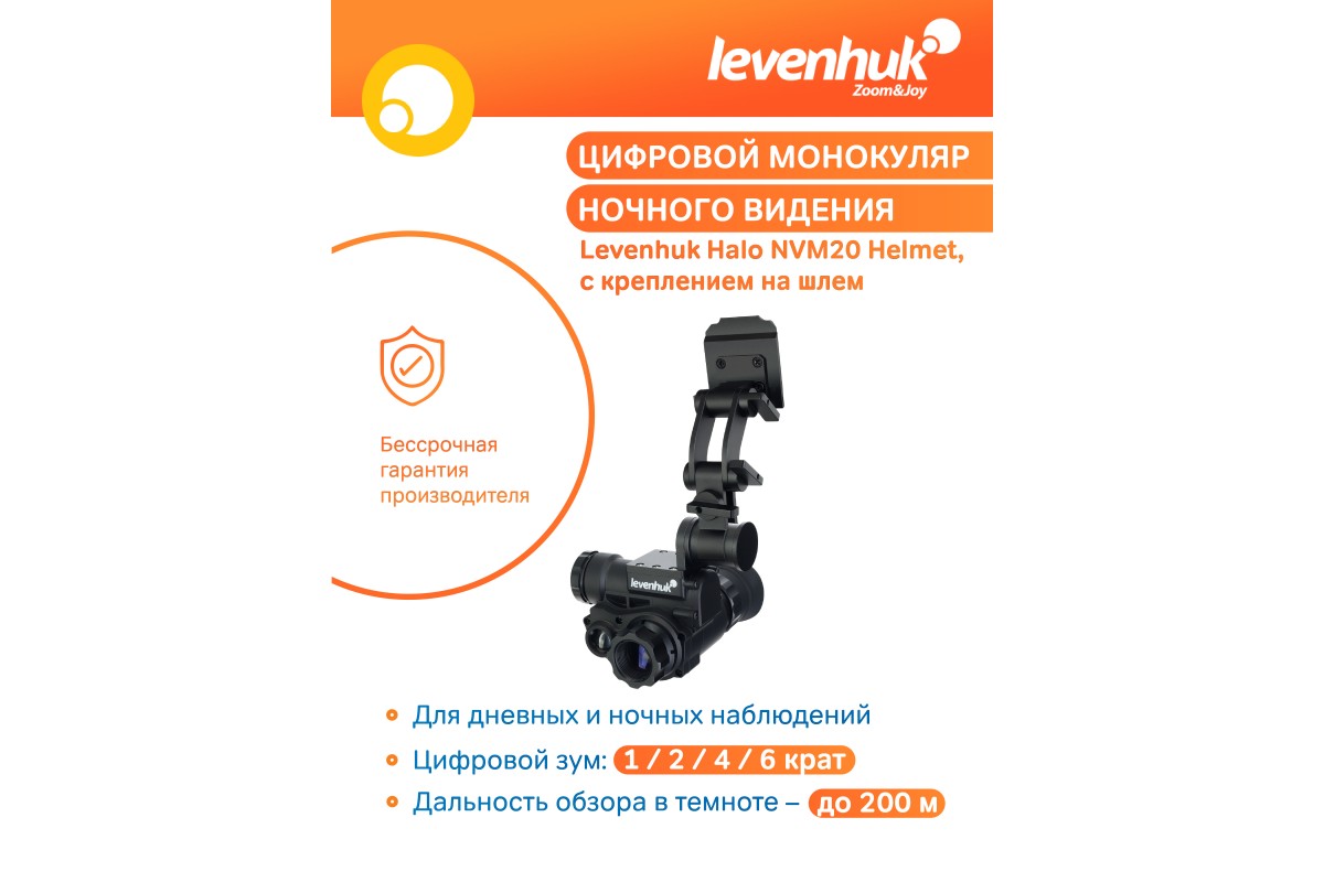 Прибор ночного видения Levenhuk Halo NVM20 подходит для охоты, спортивных и тактических соревнований, охраны, спасательных работ – он одинаково эффективен и в темноте, и при дневном свете. В светлое время суток его можно использовать как обычный монокуляр с цифровым увеличением. В темноте и при слабом освещении прибор позволяет вести наблюдения на расстоянии 200 метров.