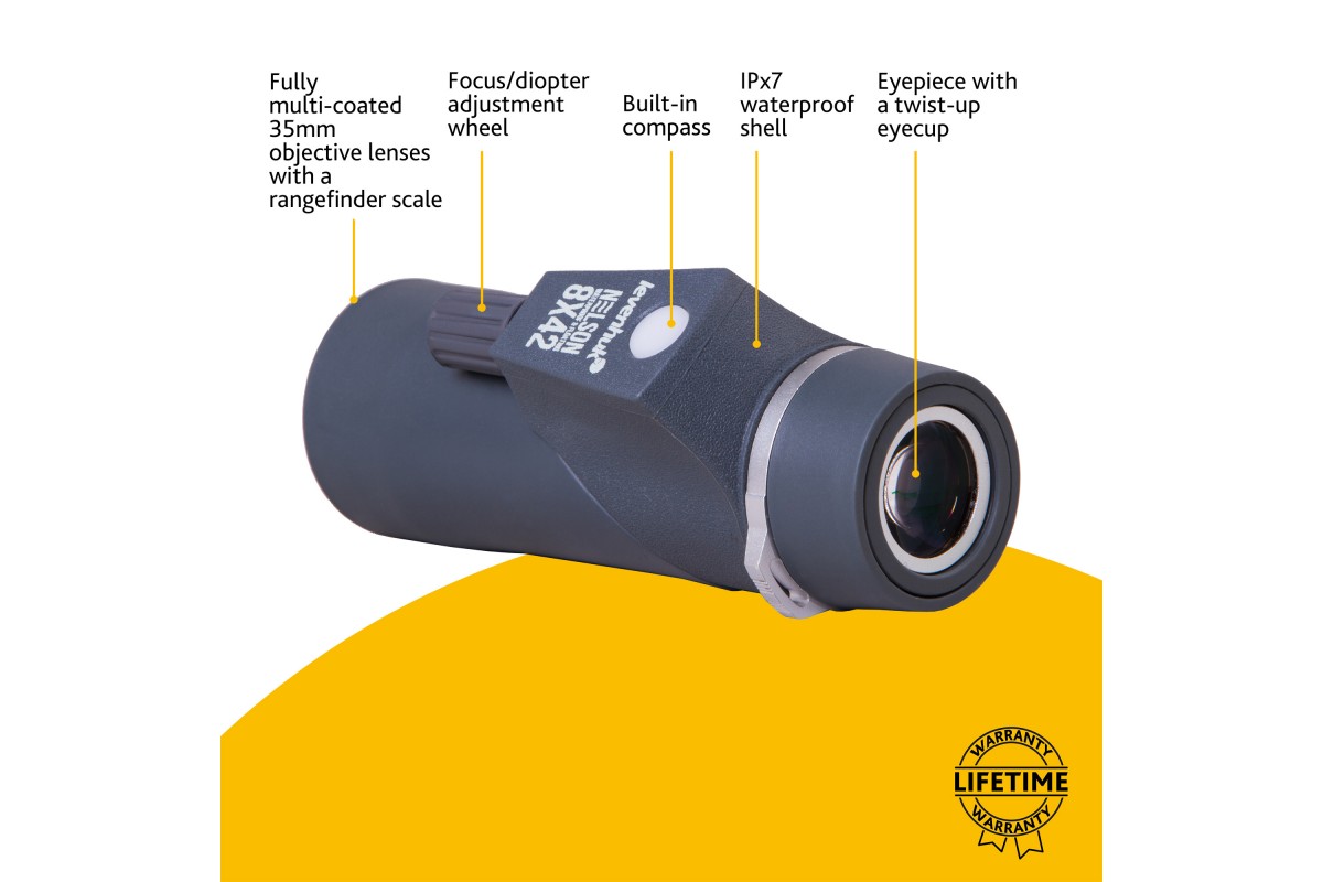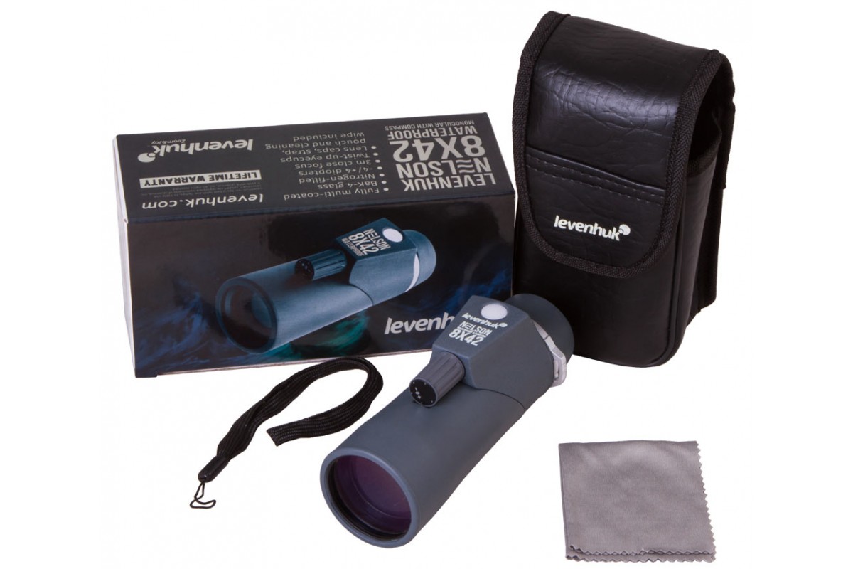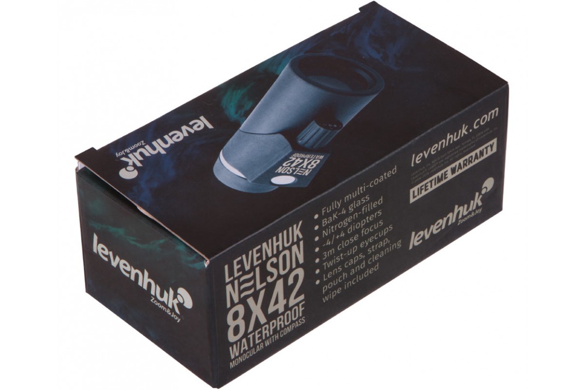 Levenhuk Nelson 8x42 – морской монокуляр со встроенными компасом и дальномером. Оптический прибор можно рекомендовать любителям рыбалки и прогулок по морю. Легкий и компактный монокуляр легко держать одной рукой, он поместится даже в карман куртки.