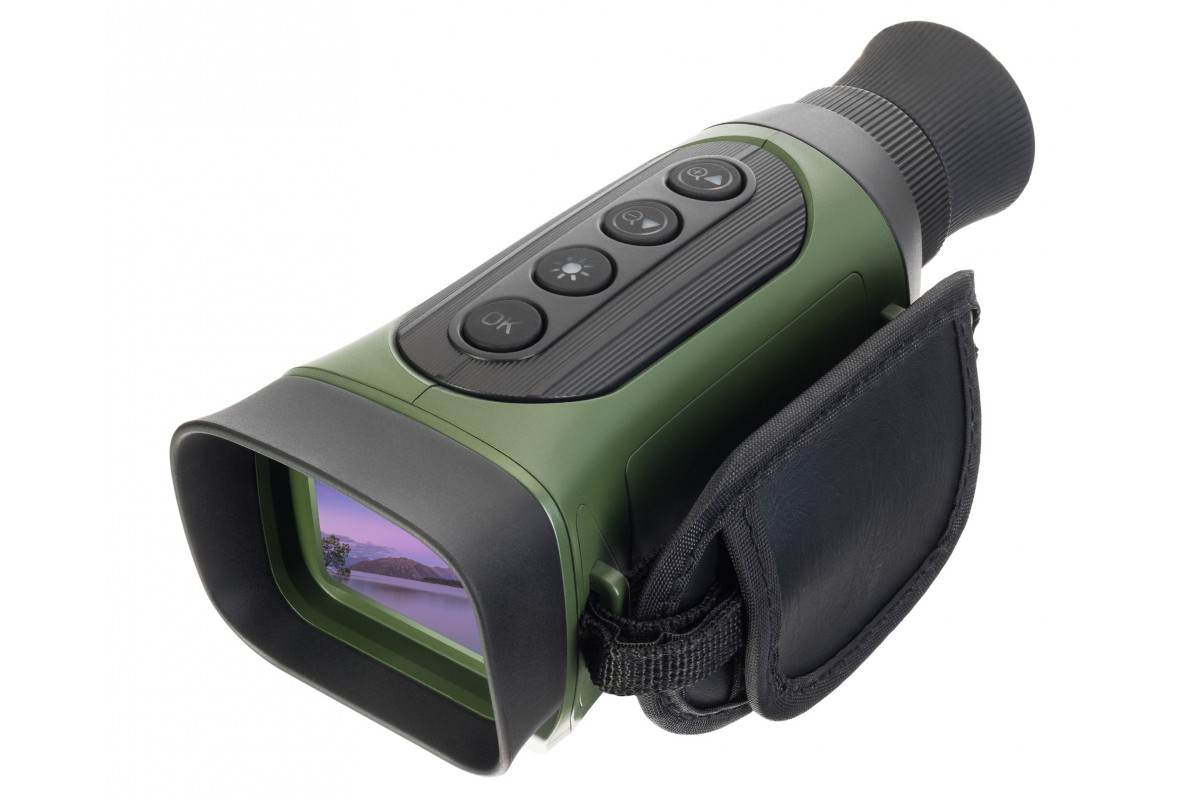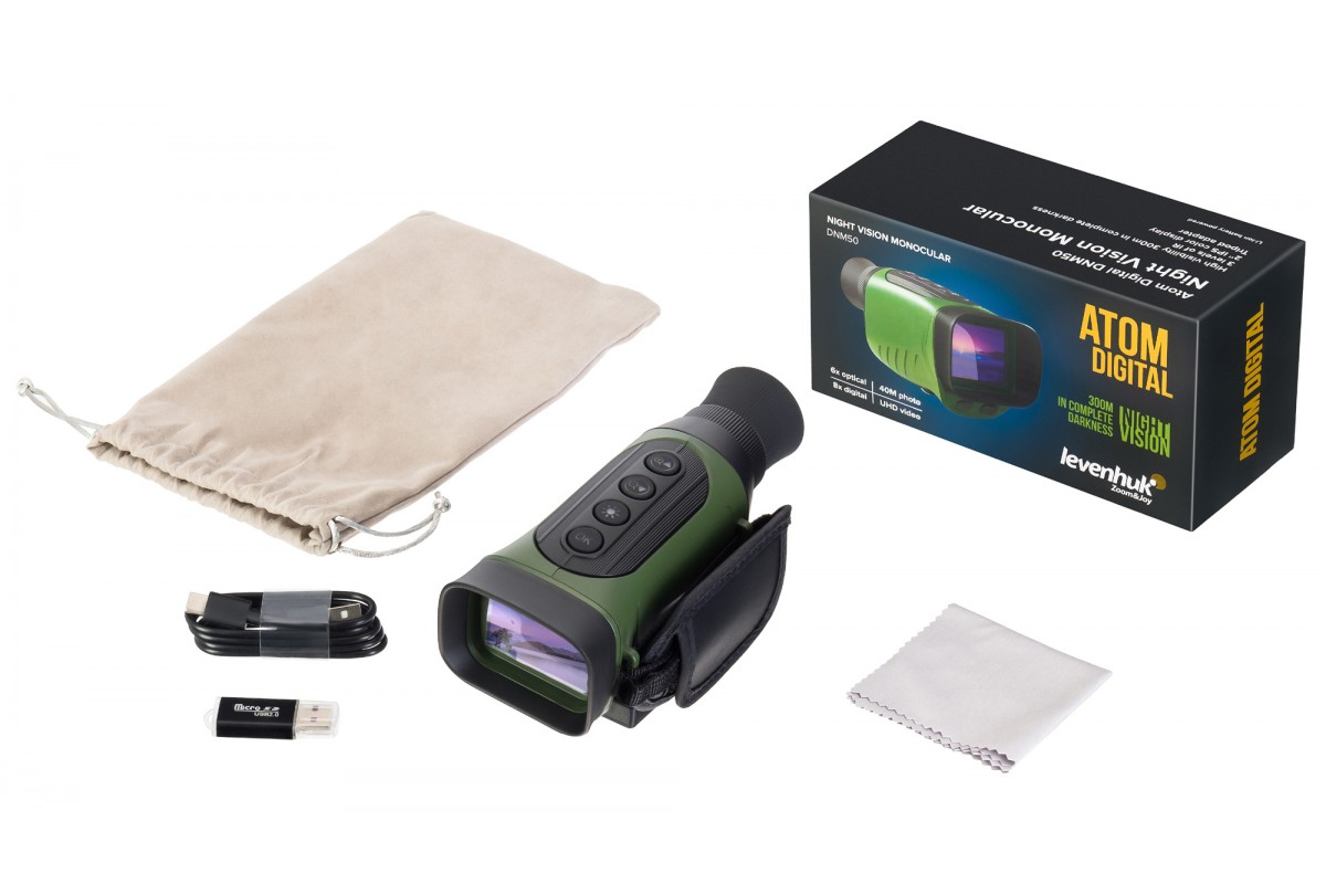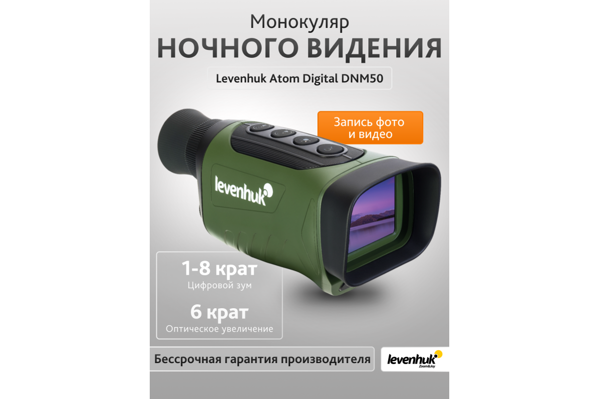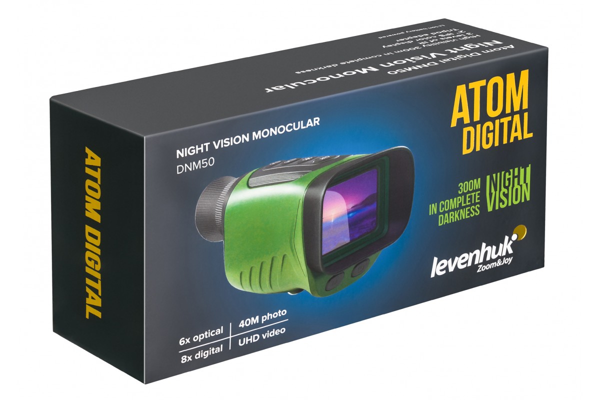 Компактный и легкий монокуляр ночного видения Levenhuk Atom Digital DNM50 хорошо проявит себя на ночной охоте, во время длительного похода и в любой работе, связанной с наблюдениями на местности. Его можно использовать днем и ночью, для наблюдений в полной темноте предусмотрена инфракрасная светодиодная подсветка с 3 уровнями яркости. Приблизить картинку помогают 6-кратное оптическое увеличение и цифровой зум 1–8 крат. Вне зависимости от освещения гибкие настройки прибора позволяют быстро подобрать оптимальные условия и получить информативное изображение на встроенном дисплее. В дневное время изображение цветное, ночью – черно-белое.