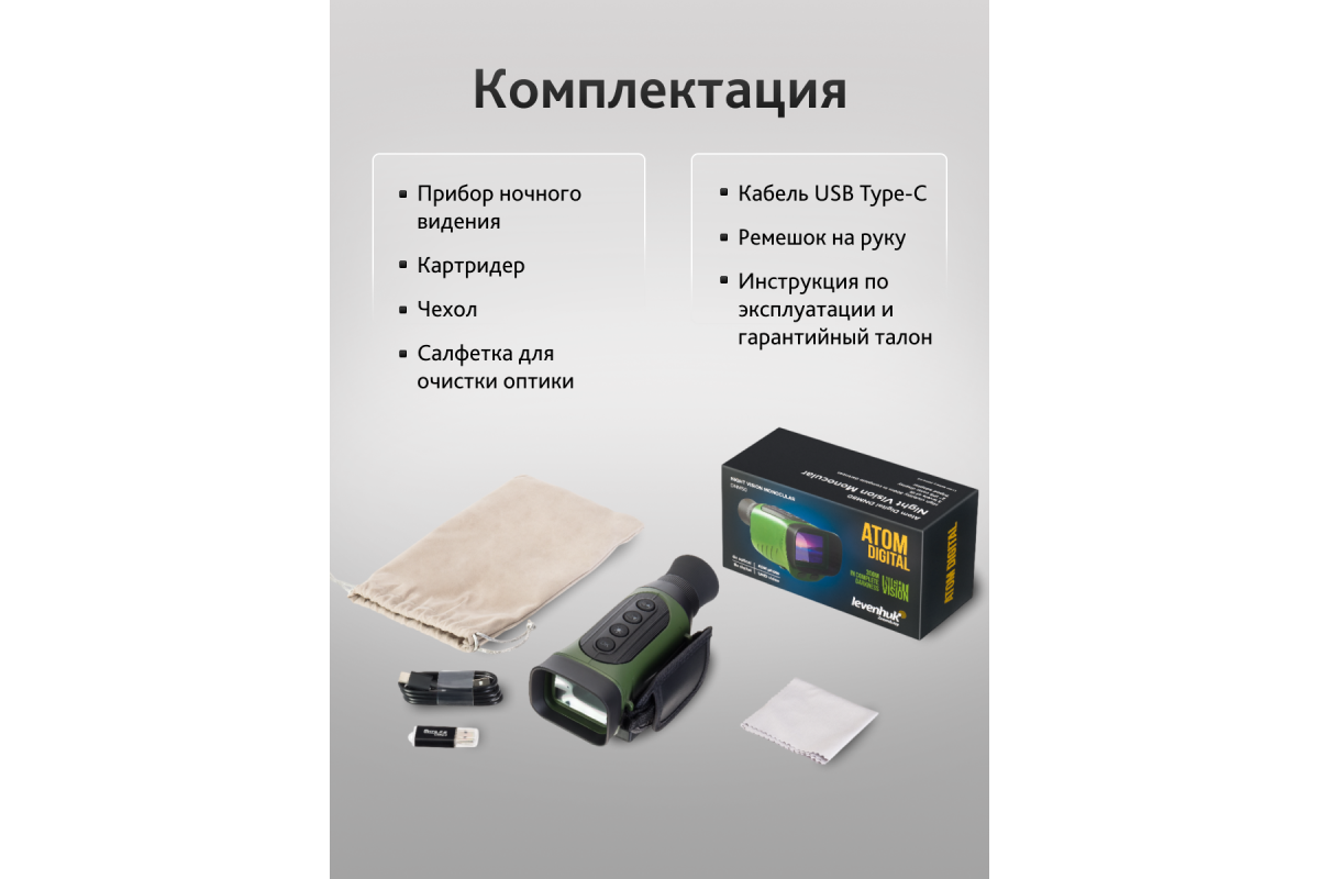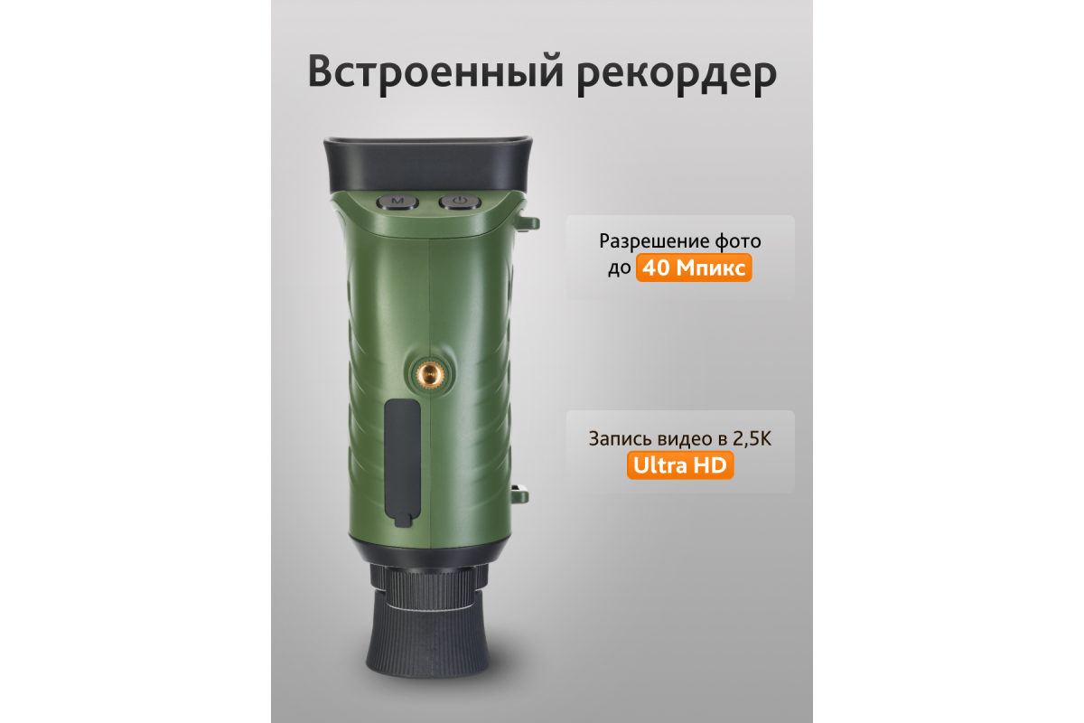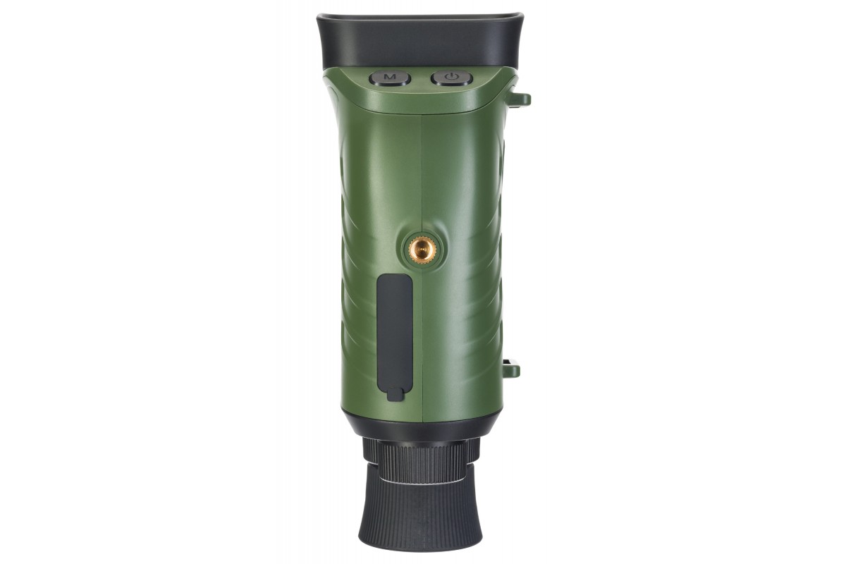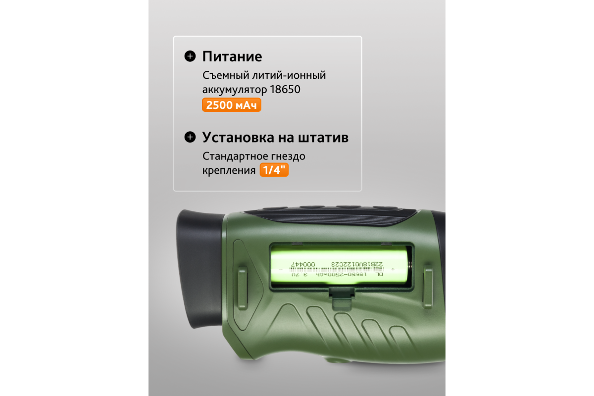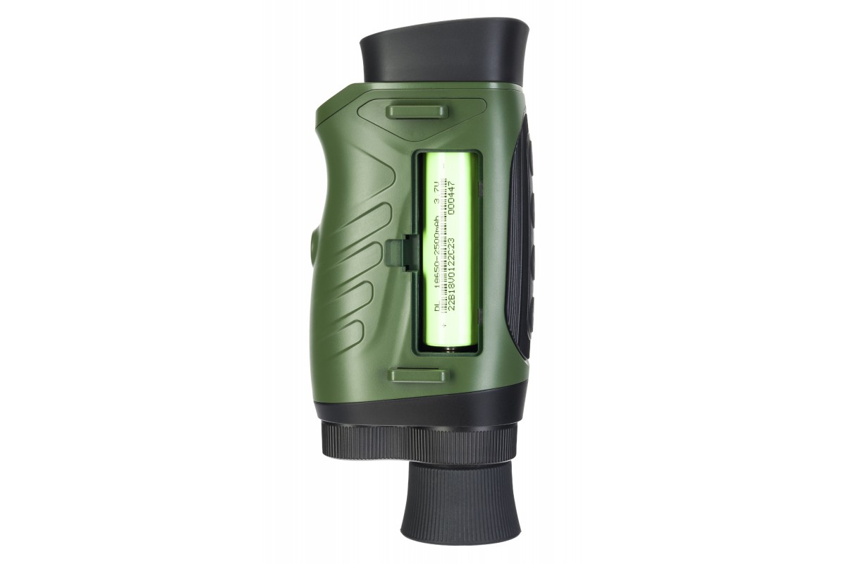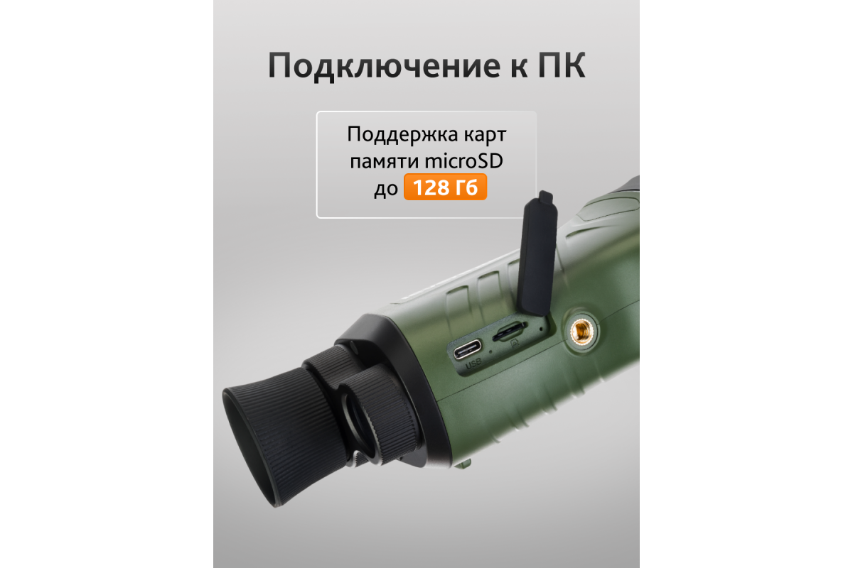Изображение формируется качественной стеклянной оптикой и чувствительным CMOS-сенсором. Компактный и легкий монокуляр удобно взять с собой, чтобы быстро достать его и приступить к наблюдениям, когда возникнет необходимость. Питание осуществляется от съемного аккумулятора, для подзарядки используются сетевой адаптер 5 В/1 А (приобретается отдельно) и кабель USB Type-C (в комплекте). Время непрерывной работы в ночном режиме достигает 4 часов. Надежный корпус из высокопрочного ABS-пластика защищает прибор от повреждений в случае падения из рук.