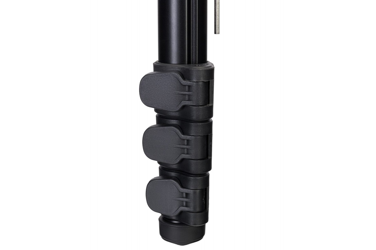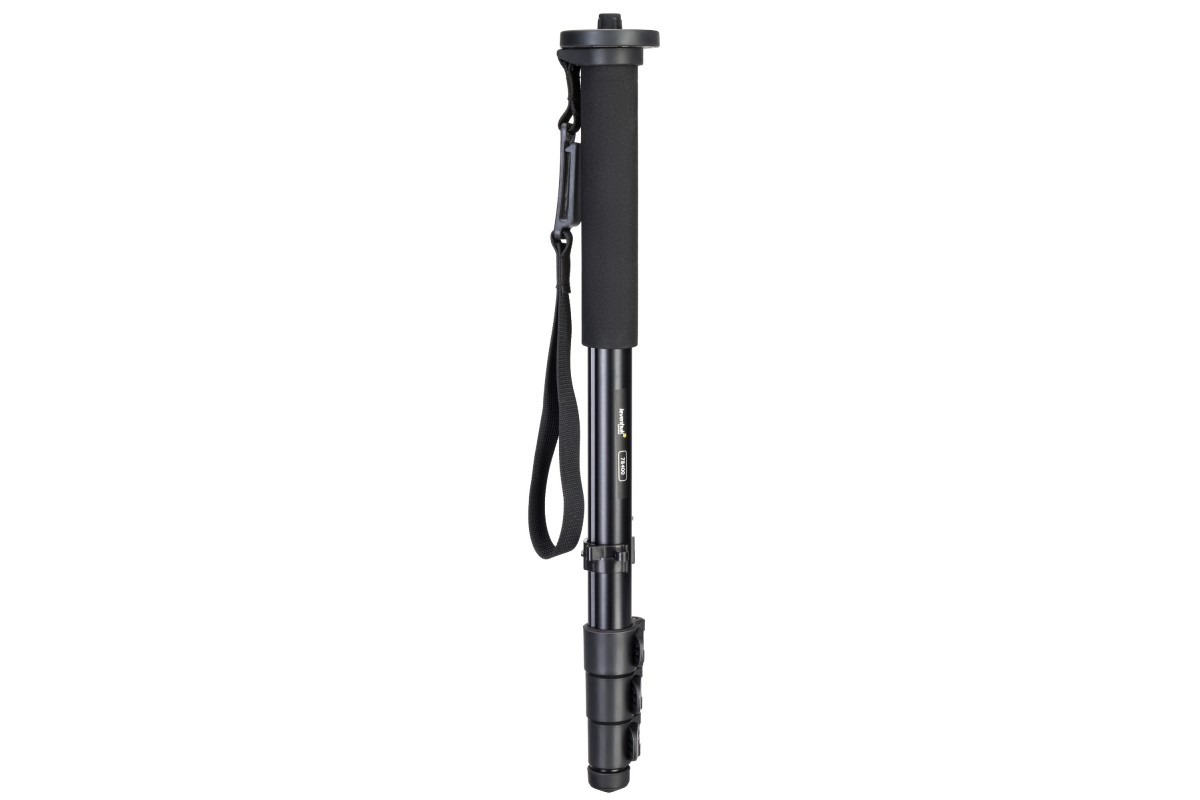 Монопод сделан из металла, имеет четыре секции и флип-замки для быстрой фиксации опоры в одном положении. Регулировать длину ручки можно в диапазоне от 480 до 1550 мм. Ножек для установки на землю не предусмотрено, подразумевается использование с рук. В комплектацию включен чехол для транспортировки и хранения.
