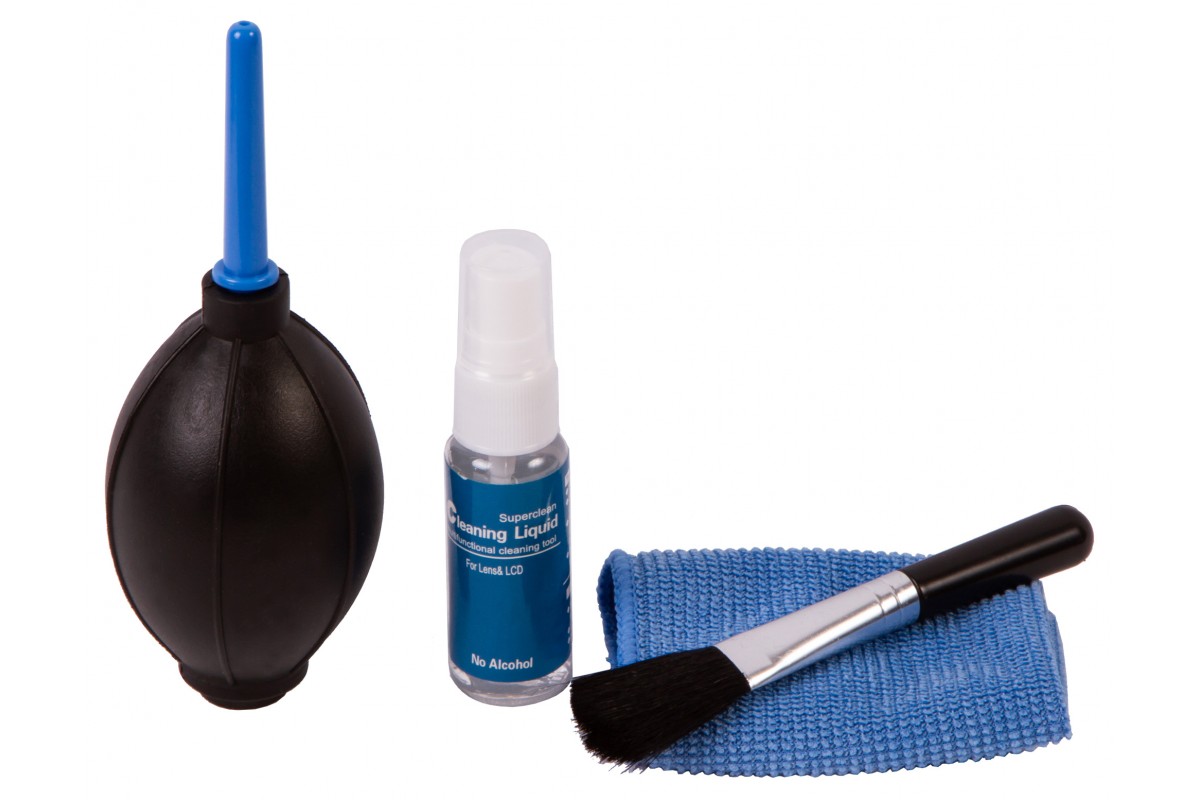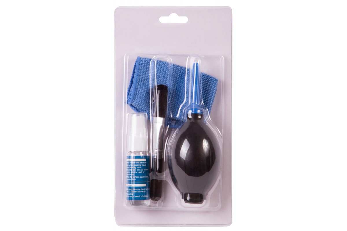 Воздушная груша предназначена для бесконтактной очистки: она эффективно сдувает мелкую пыль и ворсинки. Мягкая кисточка позволяет убирать более крупные пылевые частички и мусор. Жидкое средство наносится на салфетку из микрофибры и используется для очистки от серьезных загрязнений, в том числе жирных пятен. Его рекомендуется применять на последнем этапе очистки, когда вся мелкая пыль уже убрана.