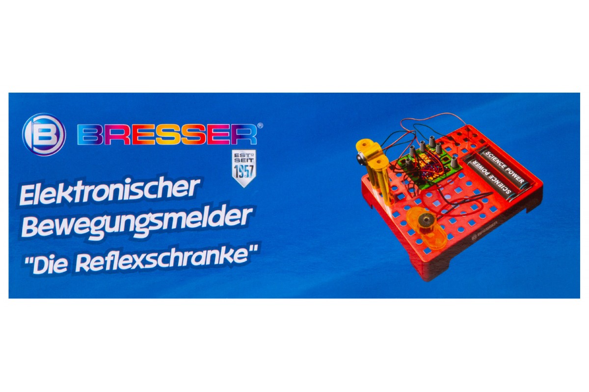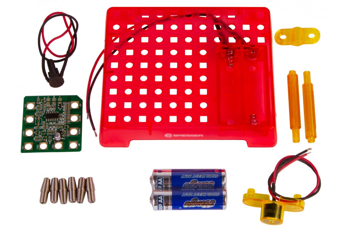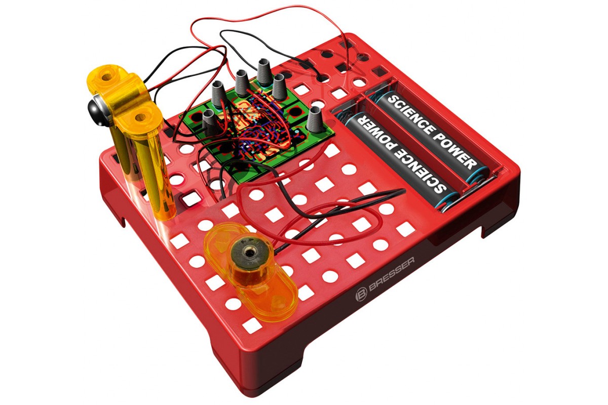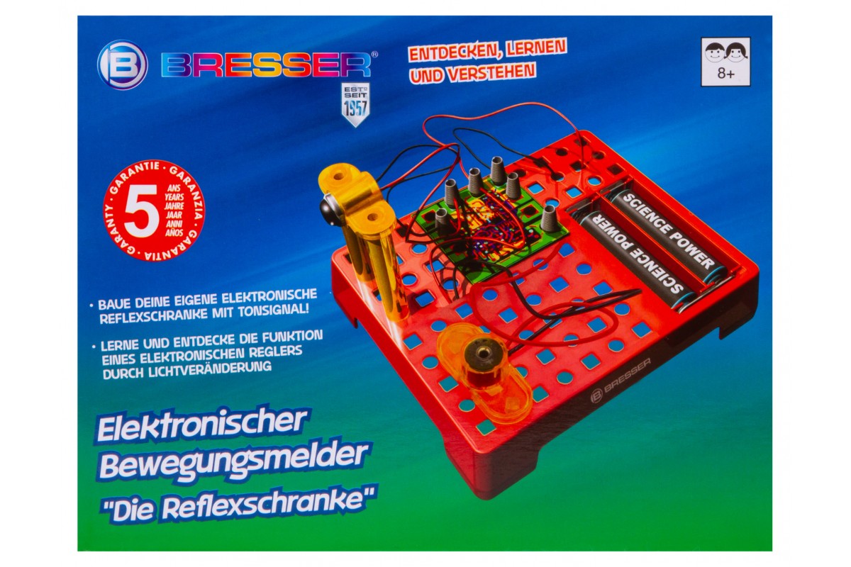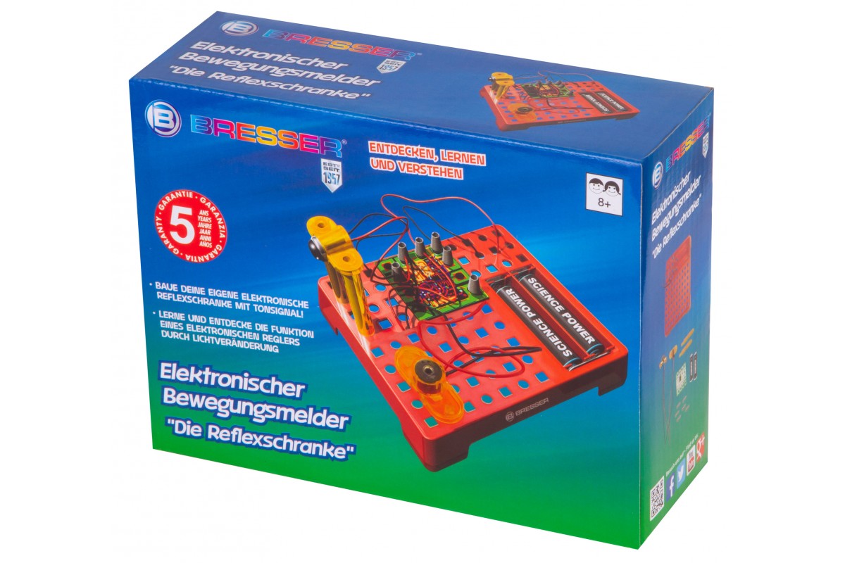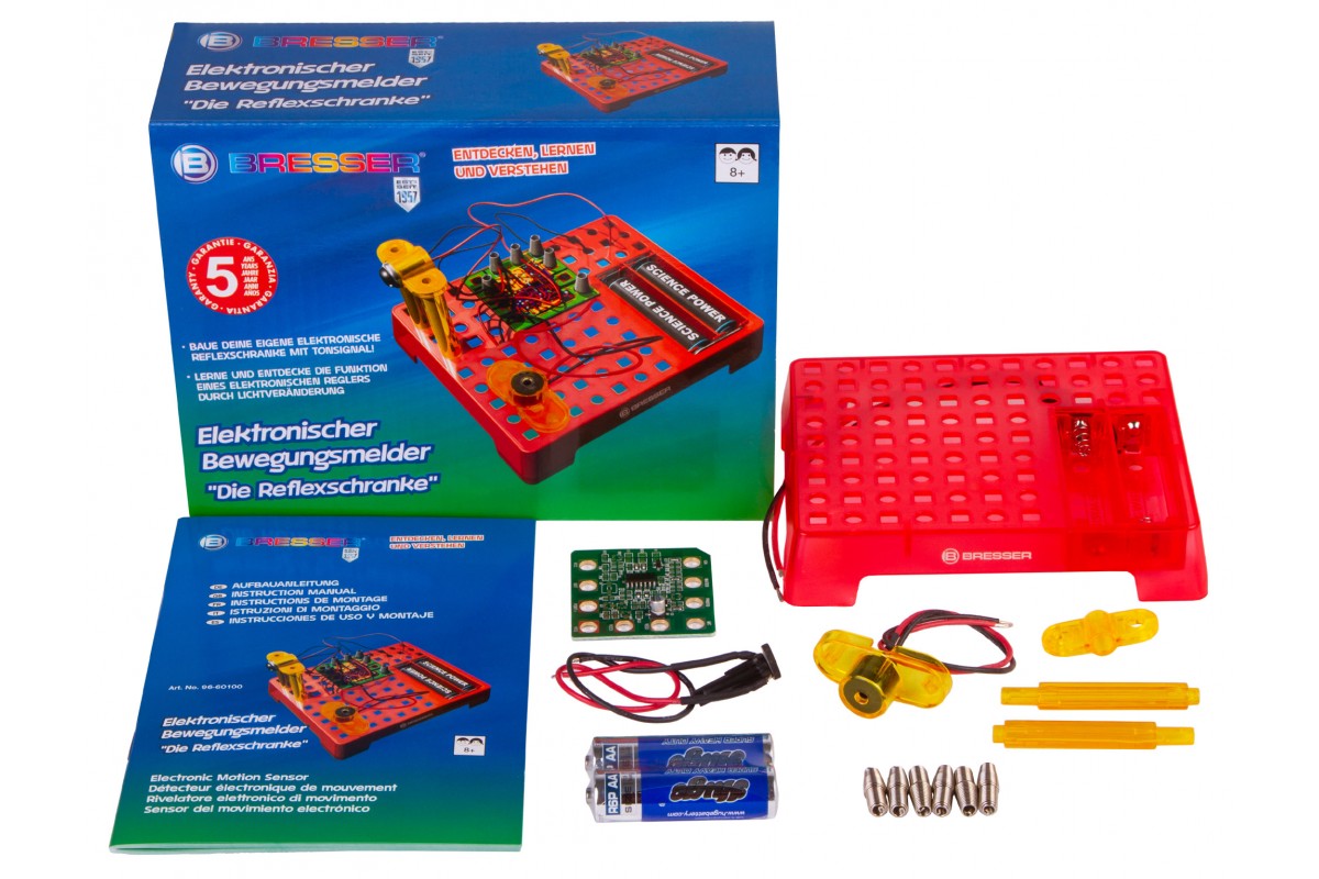 Набор Bresser Junior «Датчик движения» позволяет собрать настоящий датчик движения, похожий на те, что устанавливают в автоматические двери в торговых центрах. Он состоит из элементов, которые ребенок должен собрать в работающую микросхему по прилагаемому руководству. В итоге получится прибор, который будет издавать звуковой сигнал, если поднести к нему руку или пройти мимо.