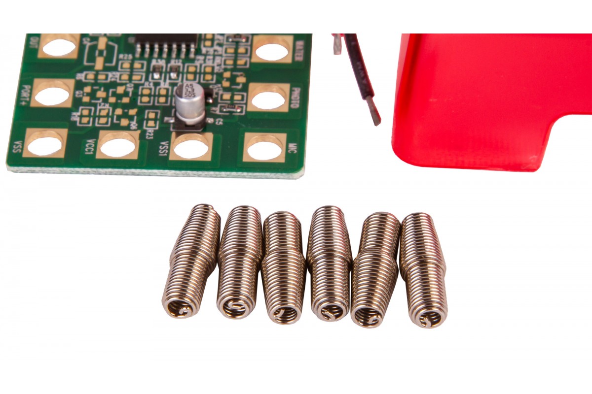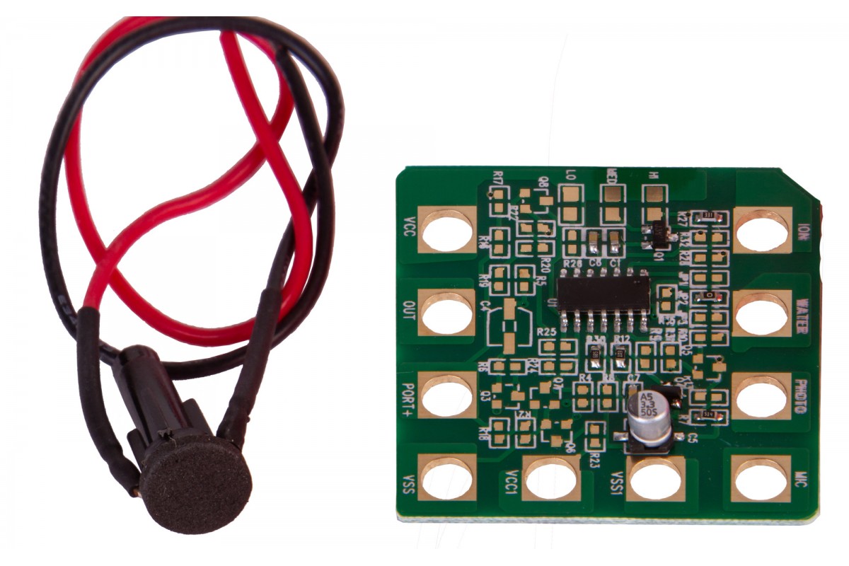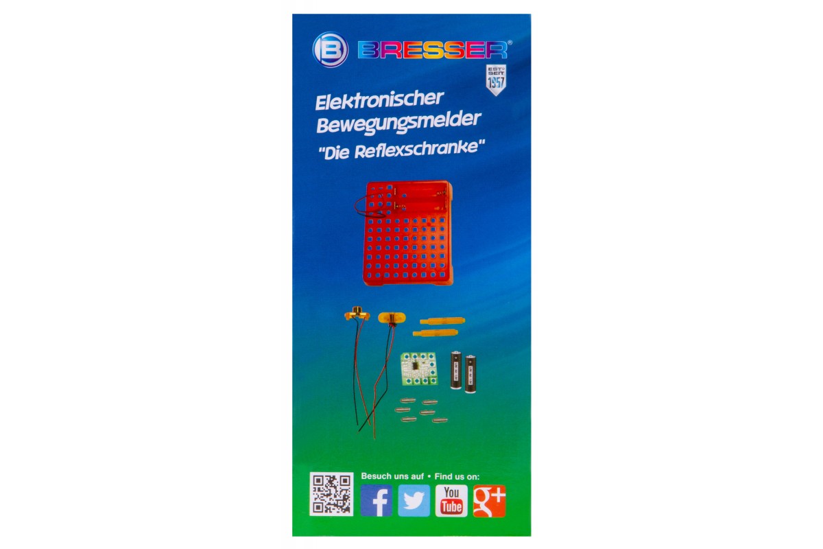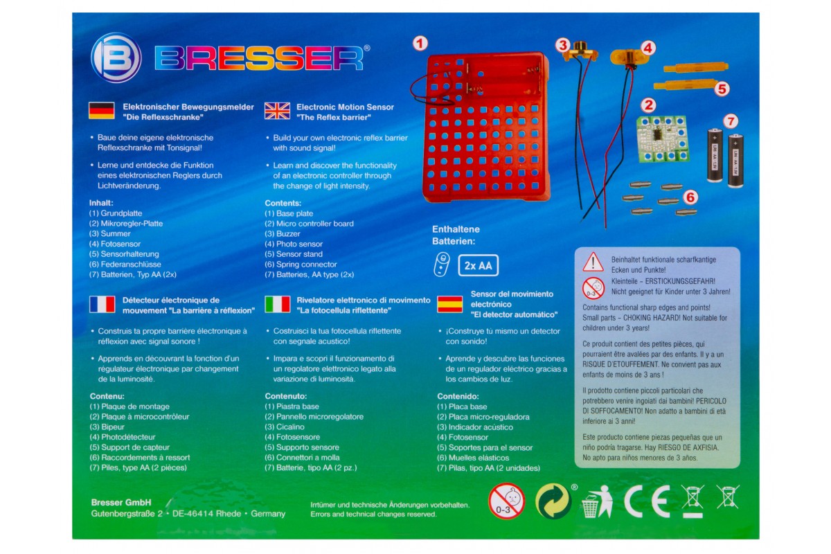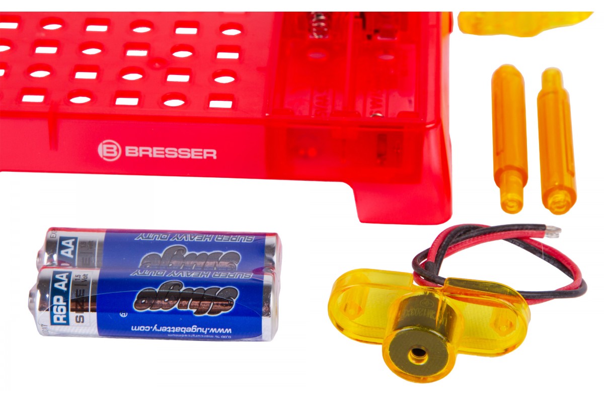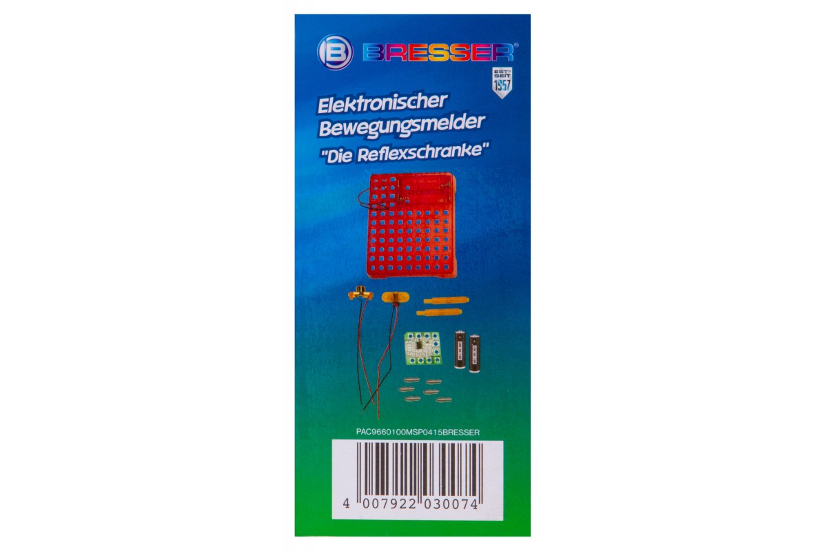 Набор Bresser Junior «Датчик движения» позволяет собрать настоящий датчик движения, похожий на те, что устанавливают в автоматические двери в торговых центрах. Он состоит из элементов, которые ребенок должен собрать в работающую микросхему по прилагаемому руководству. В итоге получится прибор, который будет издавать звуковой сигнал, если поднести к нему руку или пройти мимо.