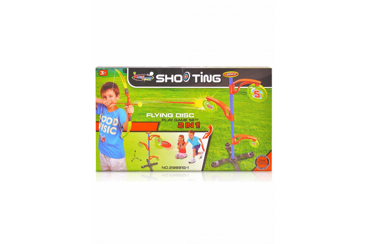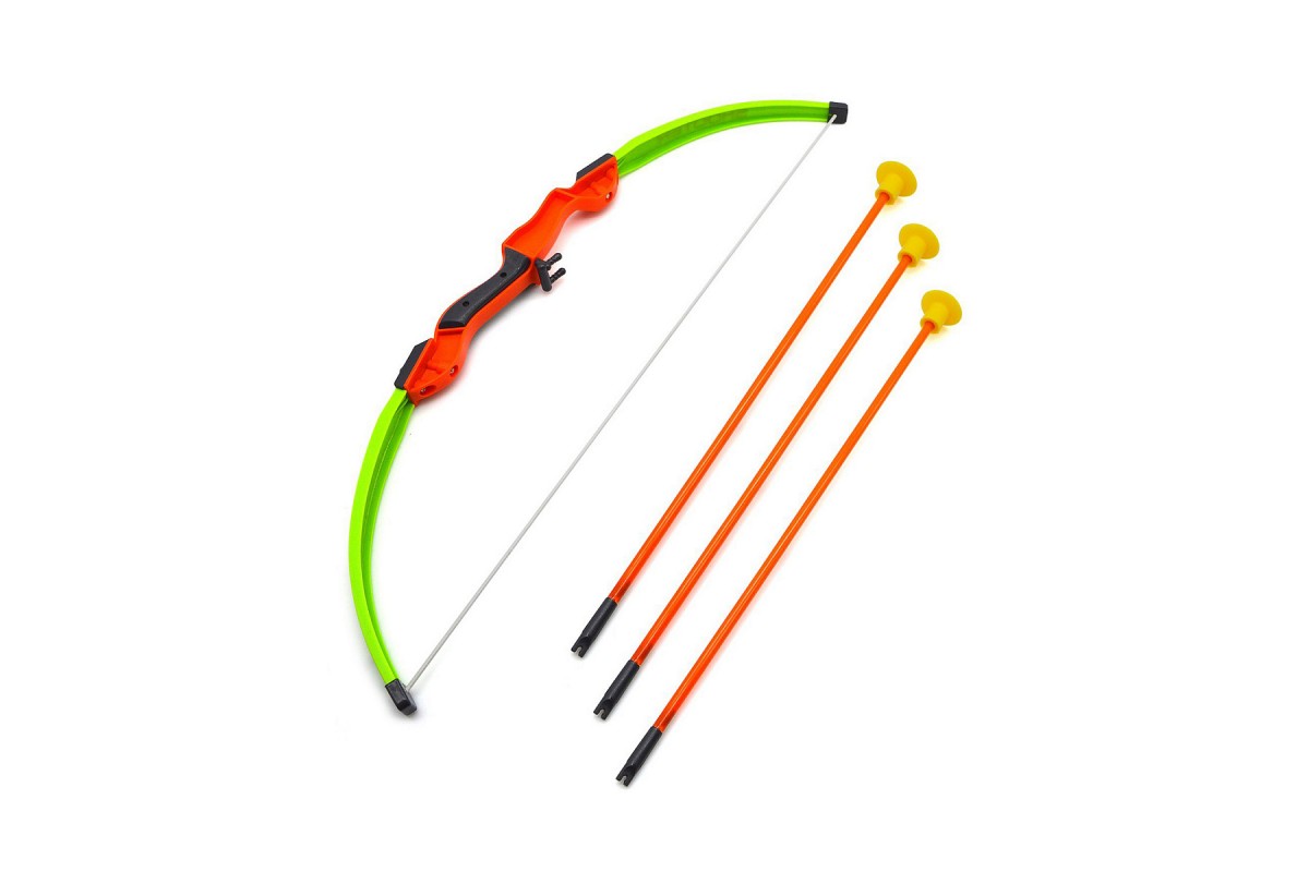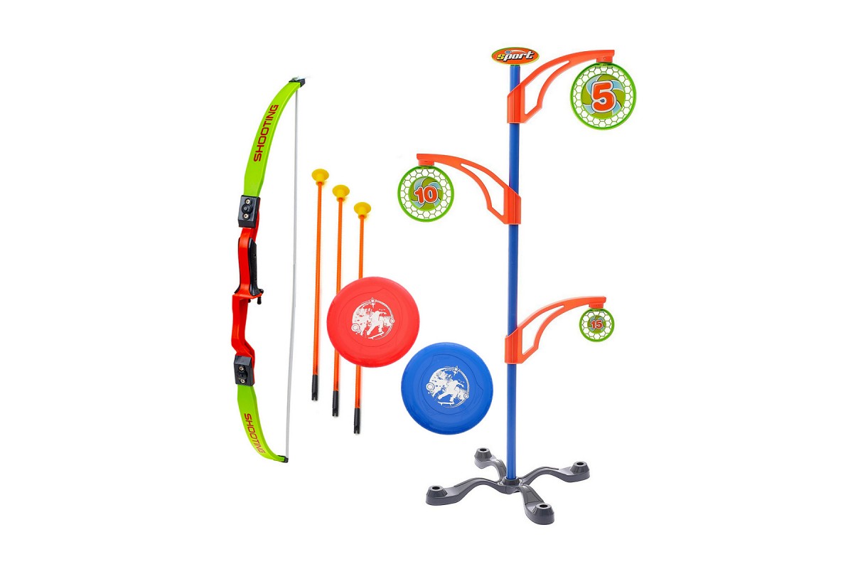 - Лук со стрелами и вертикальной стойкой с разноуровневыми мишенями. Мишени разные по размеру и сложности попадания имеют разные очки. При попадании мишени открепляются. В комплекте 3 стрелы с резиновыми присосками.