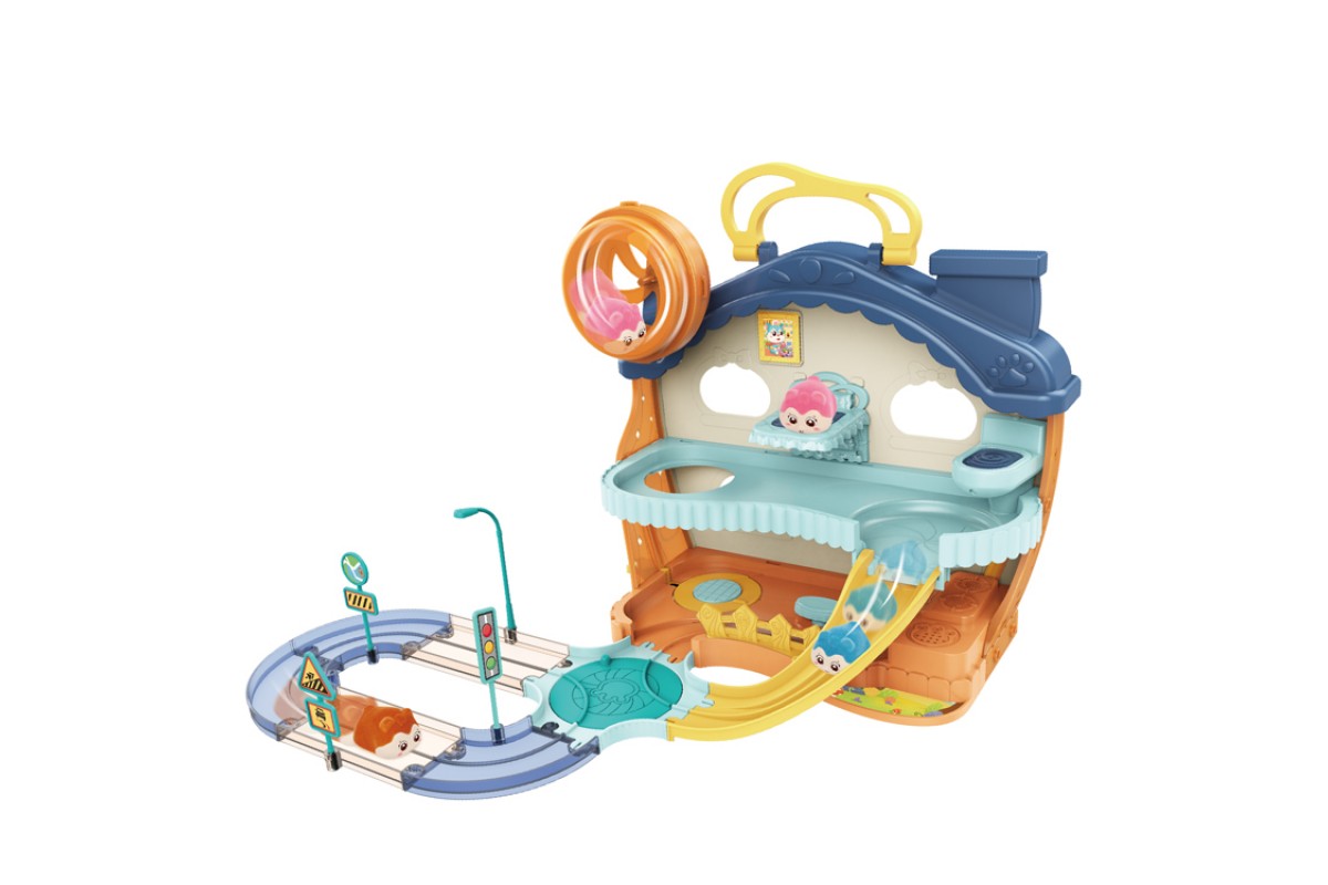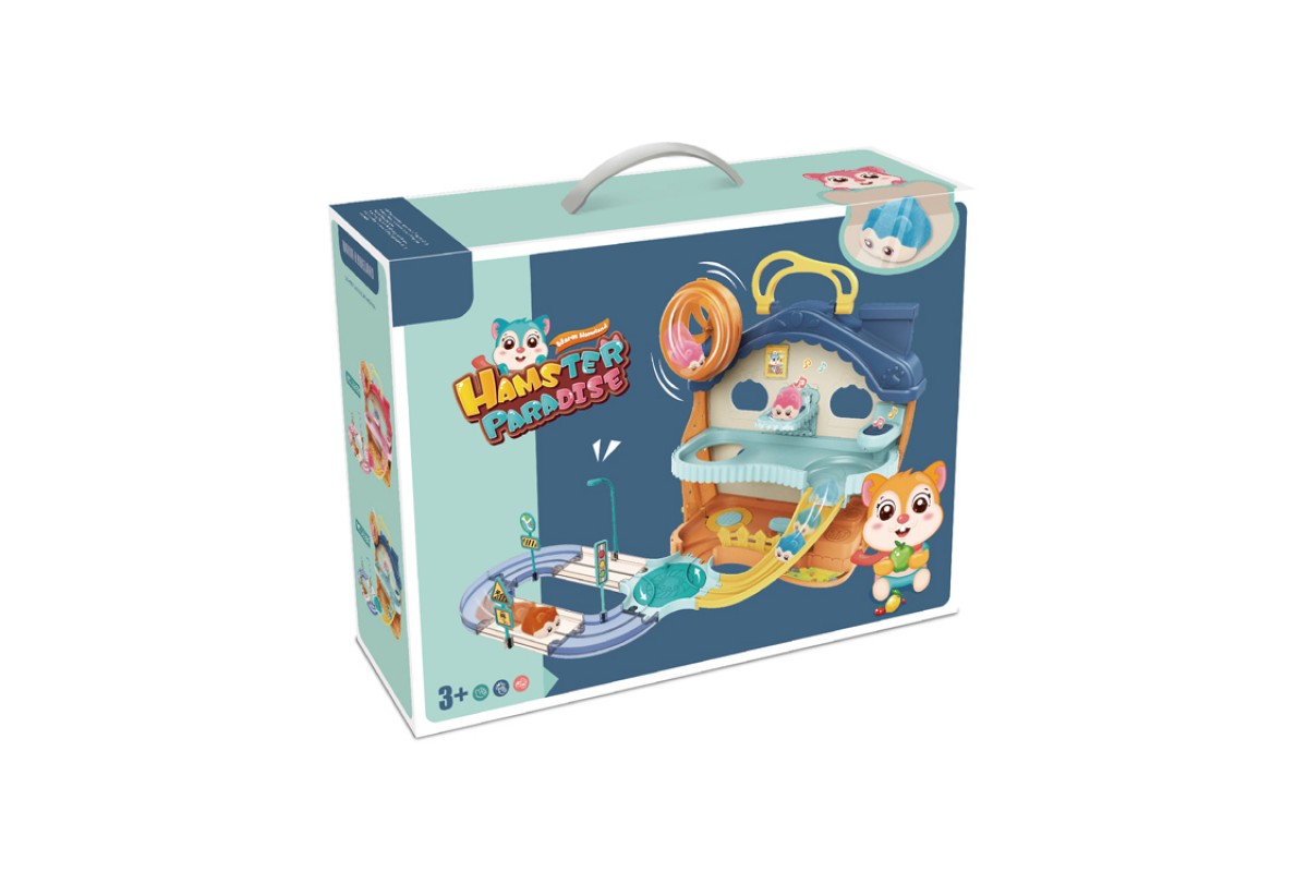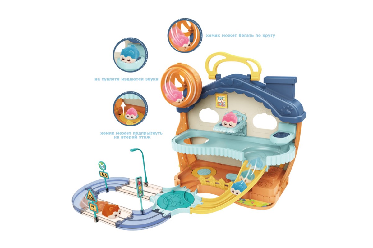 Набор игровой Fenfa "Город хомяков" Синий хомяк и дом со светом и звуком - 1619A - это игровой набор, в который входят элементы для постройки двухэтажного домика, в котором будут жить интерактивные хомячки. Кроме этого в набор уже входит один интерактивный хомячок уникальной расцветки и аксессуары для игры с ним. Хомячку будет очень комфортно жить в таком коттедже. На втором этаже домика оборудована спальня, в которой есть кровать, ванная комната с туалетом и беговое колесо для занятий спортом. Подняться с первого этажа на второй хомячок сможет на лифте. На первый этаж домика хомячок будет спускаться по наклонному треку, сразу попадая в столовую, где он с удовольствием покушает. Также хомяк может устроить увлекательную прогулку на улице.