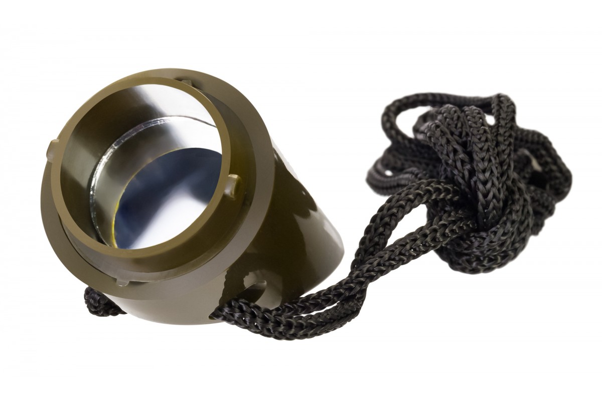 Прибор состоит из трех частей. Центральная часть – это круглая лупа, которую можно использовать для чтения мелкого текста или изучения крошечных объектов. Еще одна часть включает свисток для подачи звуковых сигналов и зеркало. Последний элемент конструкции дает доступ сразу к трем функциям: компасу, термометру и фонарику. Кнопка включения фонарика расположена в верхней части корпуса, для питания используется батарейка типа CR1220.