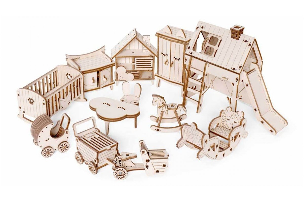 Открываются дверцы шкафчиков, крутятся колёса. Наборы подходят для кукольного дома «Венеция» и «Лофт». При желании мебель можно раскрасить акриловыми красками. Так же можно приобрести наборы мебели «Ванная» и «Бытовая техника».