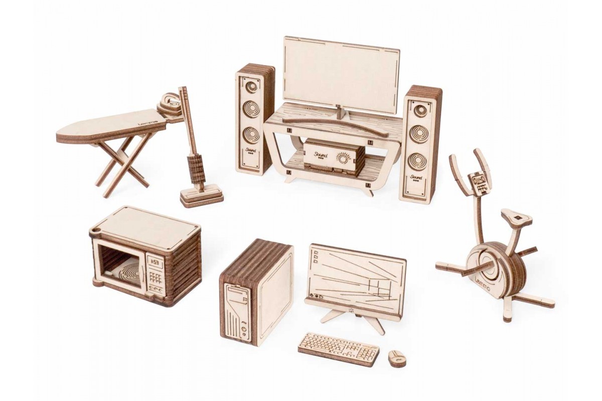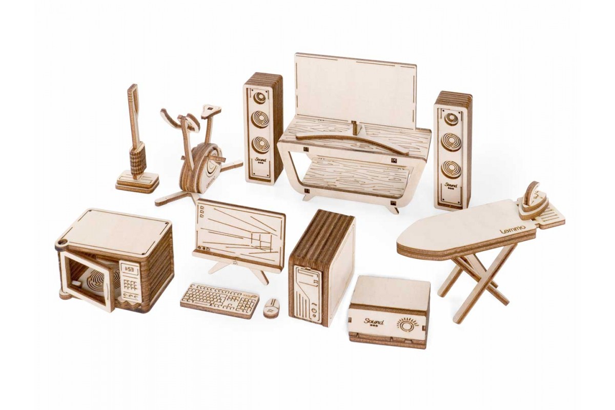 Крутятся педали тренажёра, вращается щётка пылесоса, открывается дверца микроволновки, раскладывается гладильная доска. Наборы подходят для кукольных домов «Венеция» и «Лофт». При желании мебель можно раскрасить акриловыми красками. Так же можно приобрести наборы мебели «Детская» и «Ванная»!