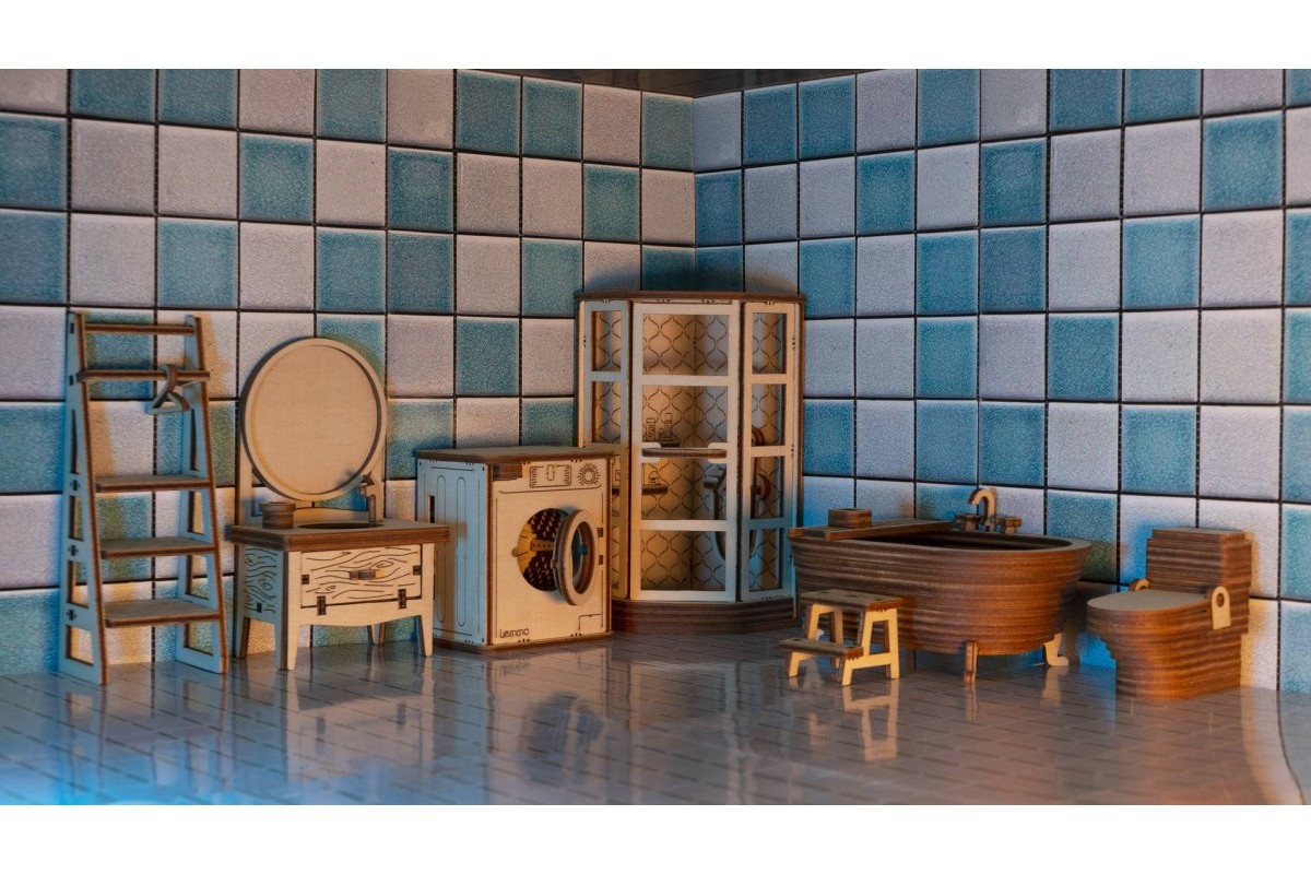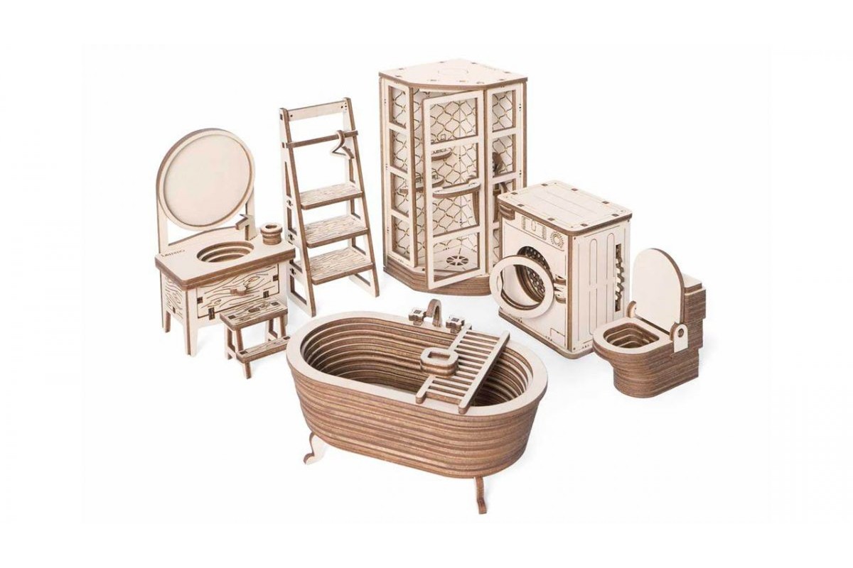 Открываются дверцы, выдвигается ящик. У стиральной машинки открывается отсек для порошка, крутится барабан, открывается дверца. Наборы подходят для кукольных домов «Венеция» и «Лофт». При желании мебель можно раскрасить акриловыми красками. Так же можно приобрести наборы мебели «Бытовая техника» и «Детская».
