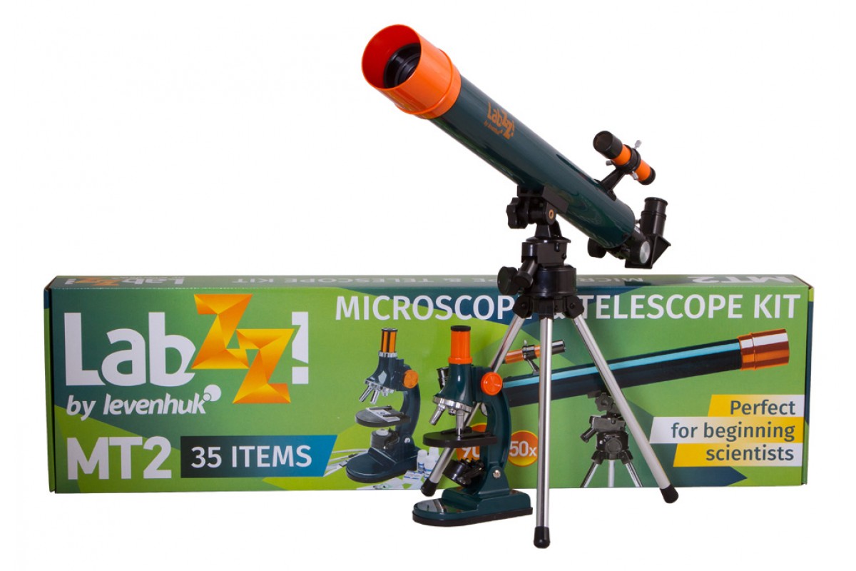 С детским набором Levenhuk LabZZ MT2 познание окружающего мира будет ярким и интересным! В набор входят небольшой телескоп-рефрактор и микроскоп начального уровня, а также множество полезных дополнительных аксессуаров. Ребенок будет с удовольствием разглядывать Луну и изучать букашек, любоваться звездами и рассматривать растения – юному исследователю не придется скучать! Набор ориентирован на дошкольников и школьников младших классов.