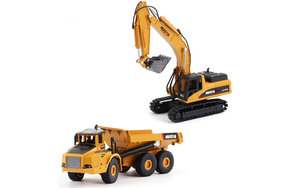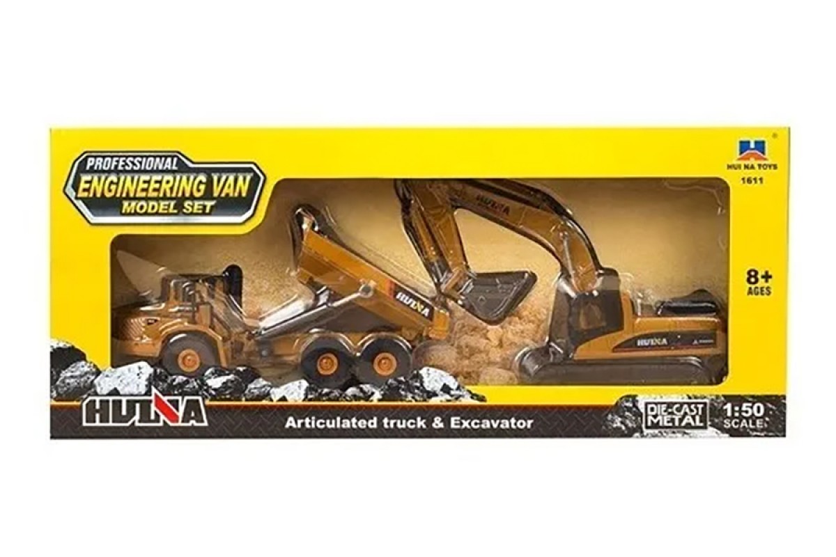 - Коллекционная модель 1:50 Экскаватор металлический + Самосвал HuiNa 1611