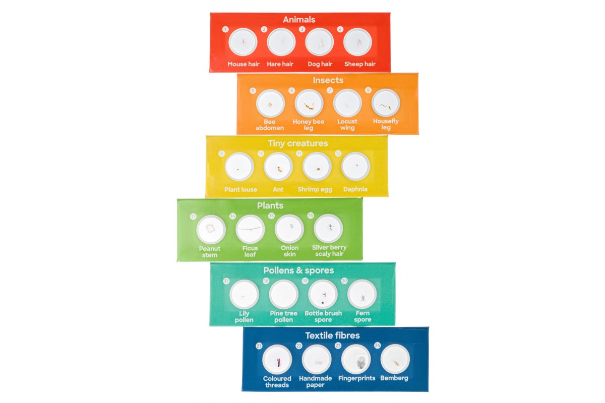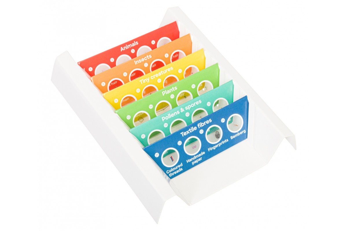 Набор состоит из 6 слайдов, на каждом из которых расположено 4 образца. Всего 24 прозрачных микропрепарата на темы зоологии и ботаники. Образцы пронумерованы и подписаны, поэтому в них легко ориентироваться даже новичку. Препараты можно изучать с любым биологическим микроскопом, оборудованным нижней подсветкой. Марка неважна.