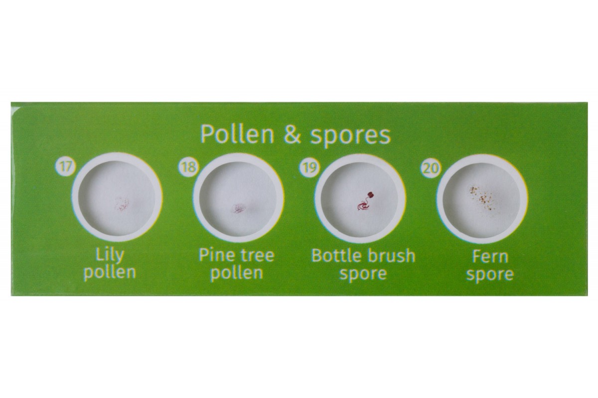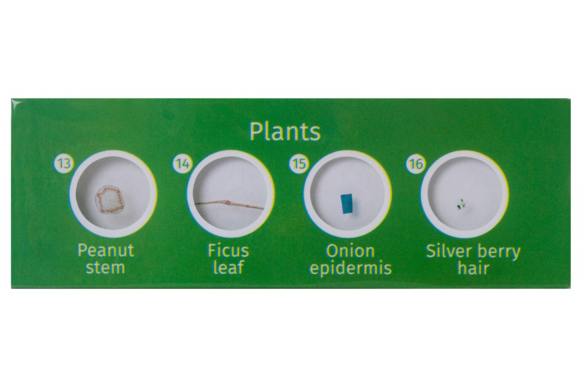 Набор состоит из 24 микропрепаратов, размещенных на 6 слайдах. Каждый слайд оклеен цветной бумагой с 4 круглыми окошками и подписями. В окошках видны образцы. Набор упакован в яркую картонную коробку.