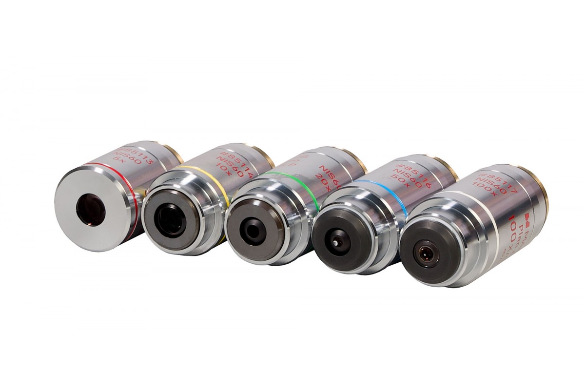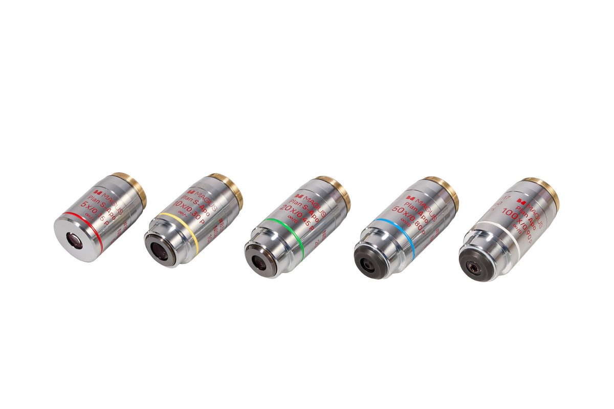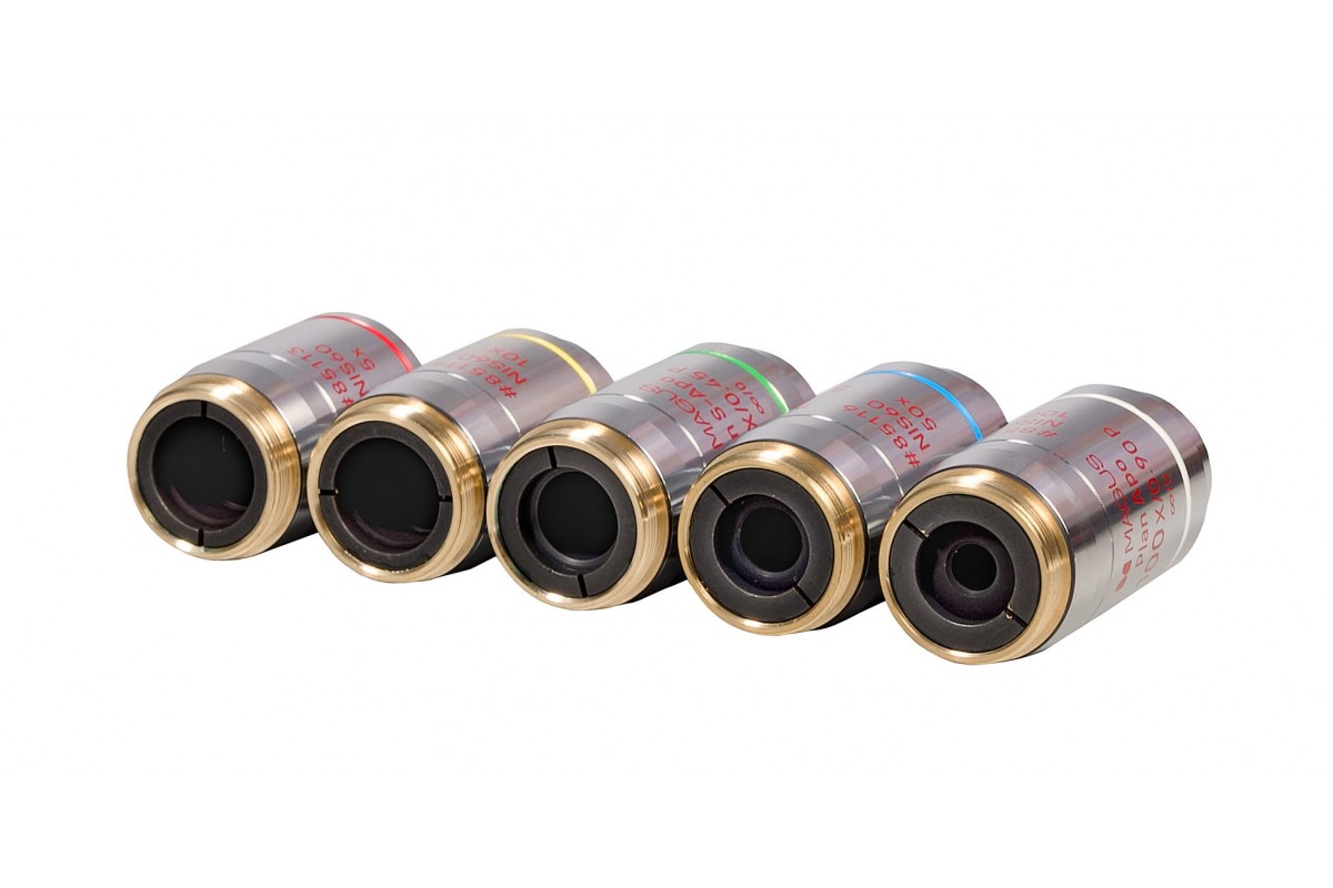 Объективы в наборе – план-полуапохроматы и план-апохроматы на бесконечность, которые обеспечивают лучшую коррекцию хроматической и сферической аберрации в сравнении с планахроматами. Изображение в окулярах и через цифровую камеру чище, контрастнее и ярче. В комплект включены пять объективов с увеличением 5х, 10х, 20х, 50х, 100х. Парфокальная высота – 60 мм.