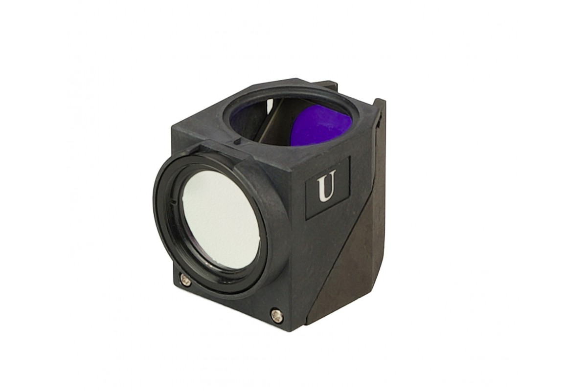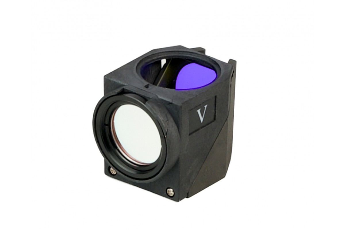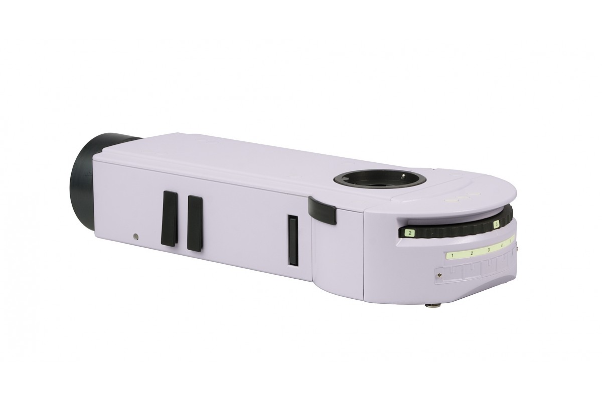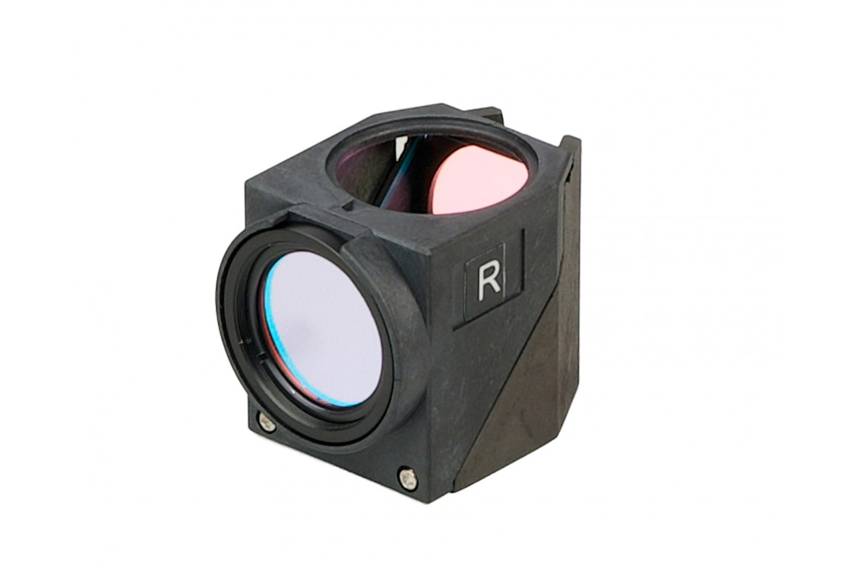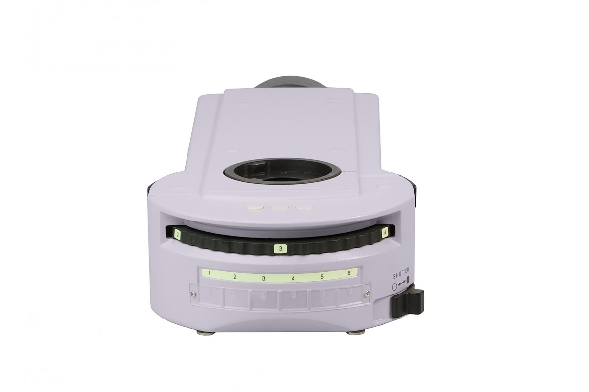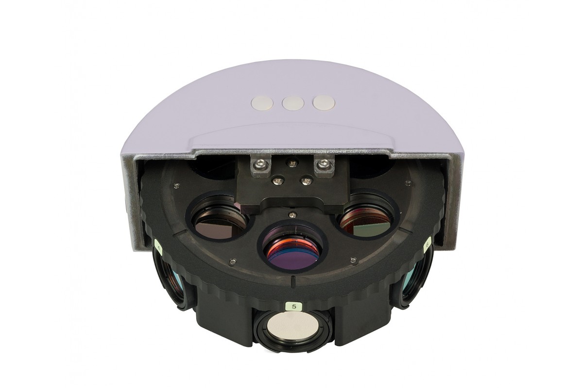 В основе устройства лежит встроенная шестипозиционная поворотная турель, рассчитанная на одновременную установку пяти фильтр‑блоков и обеспечивающая оперативное переключение между ними. Одно положение турели предназначено для работы в светлом поле. В комплектацию включены восемь фильтр-блоков: узкополосные – красный (R), для флюорохромов DAPI, FITC и TRITC; широкополосные – зеленый (G), ультрафиолетовый (UV), фиолетовый (V), синий (B). Насадка фиксируется на микроскопе на штативе – между револьвером объективов и визуальной насадкой.