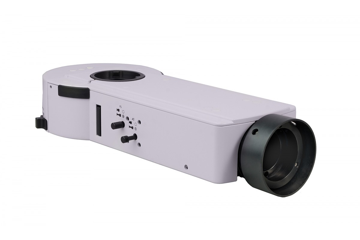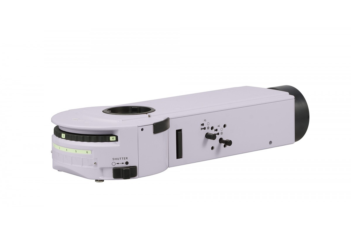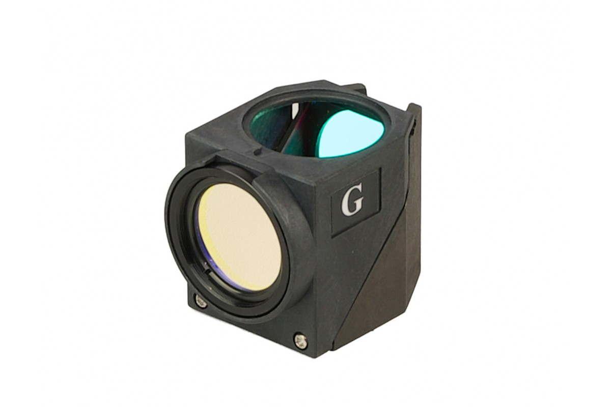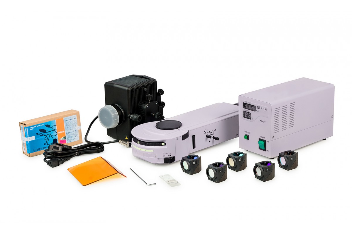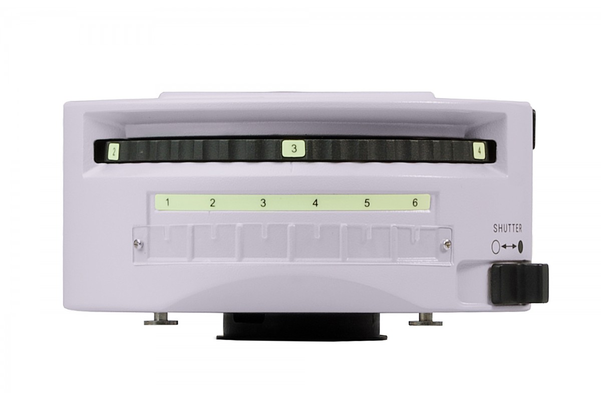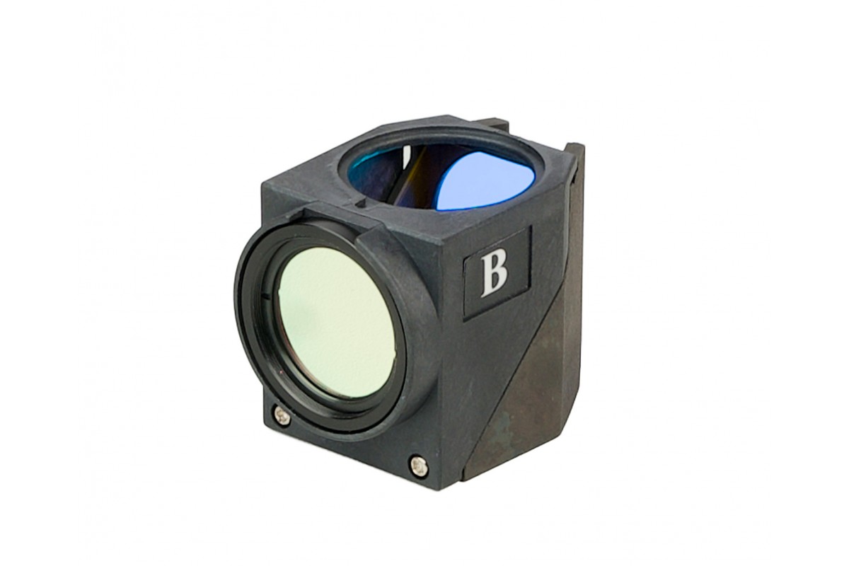 В основе устройства лежит встроенная шестипозиционная поворотная турель, рассчитанная на одновременную установку пяти фильтр‑блоков и обеспечивающая оперативное переключение между ними. Одно положение турели предназначено для работы в светлом поле. В комплектацию включены восемь фильтр-блоков: узкополосные – красный (R), для флюорохромов DAPI, FITC и TRITC; широкополосные – зеленый (G), ультрафиолетовый (UV), фиолетовый (V), синий (B). Насадка фиксируется на микроскопе на штативе – между револьвером объективов и визуальной насадкой.